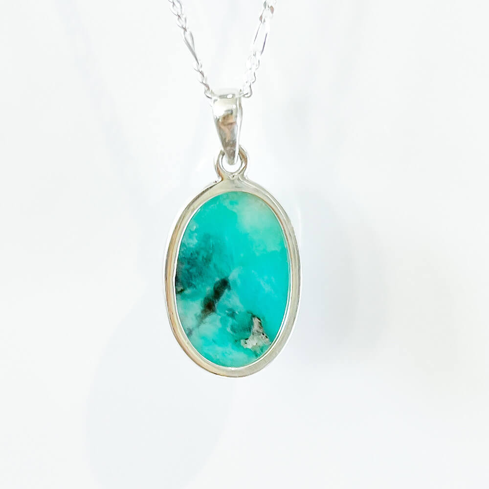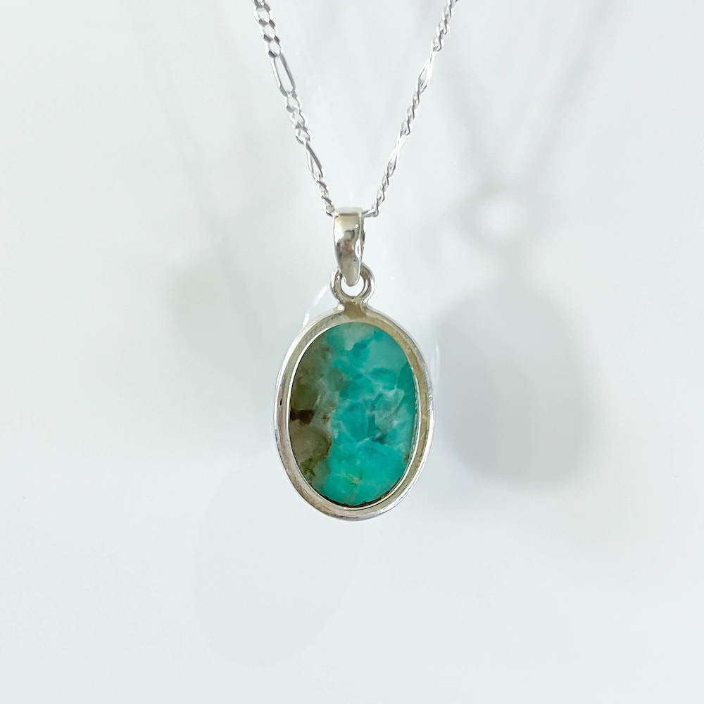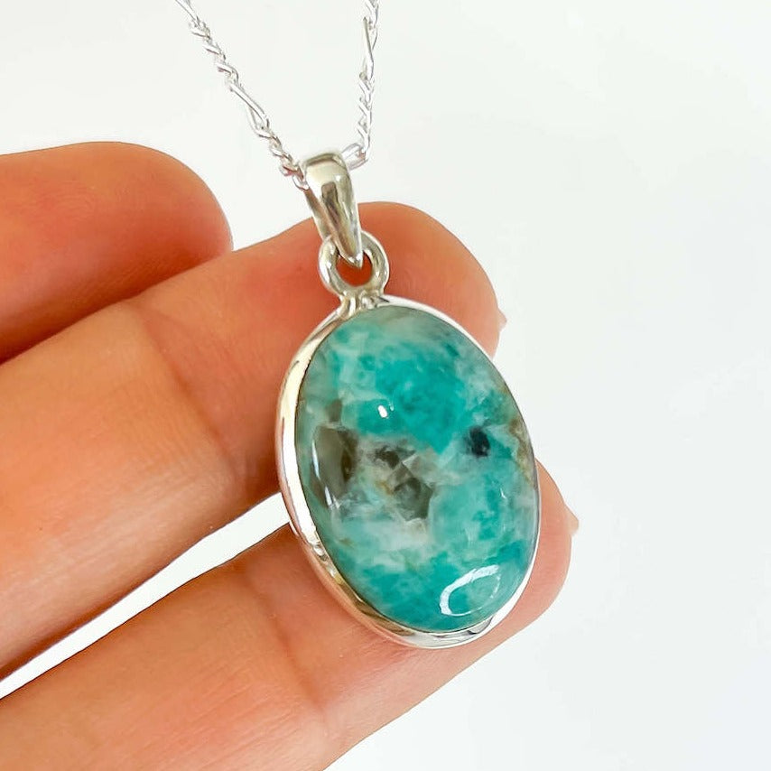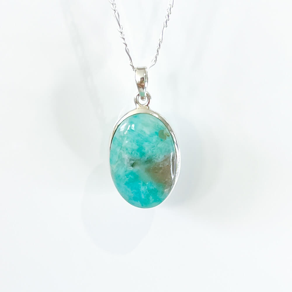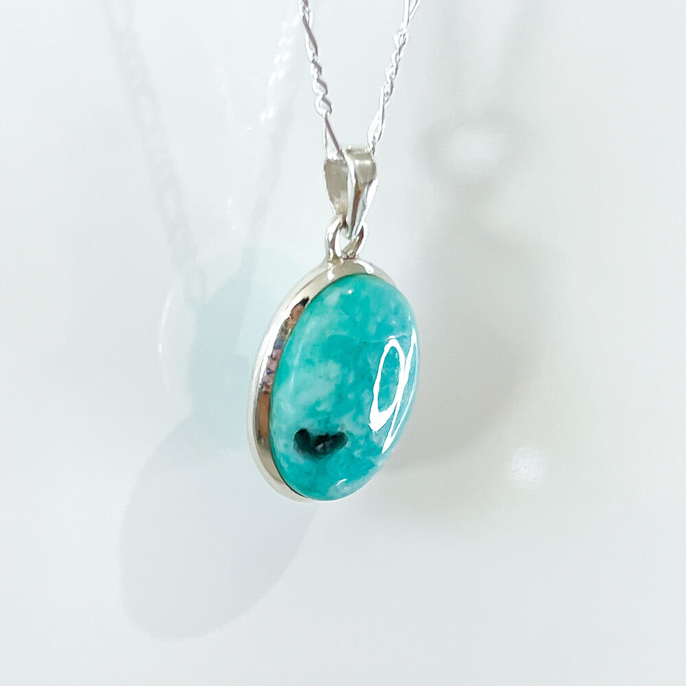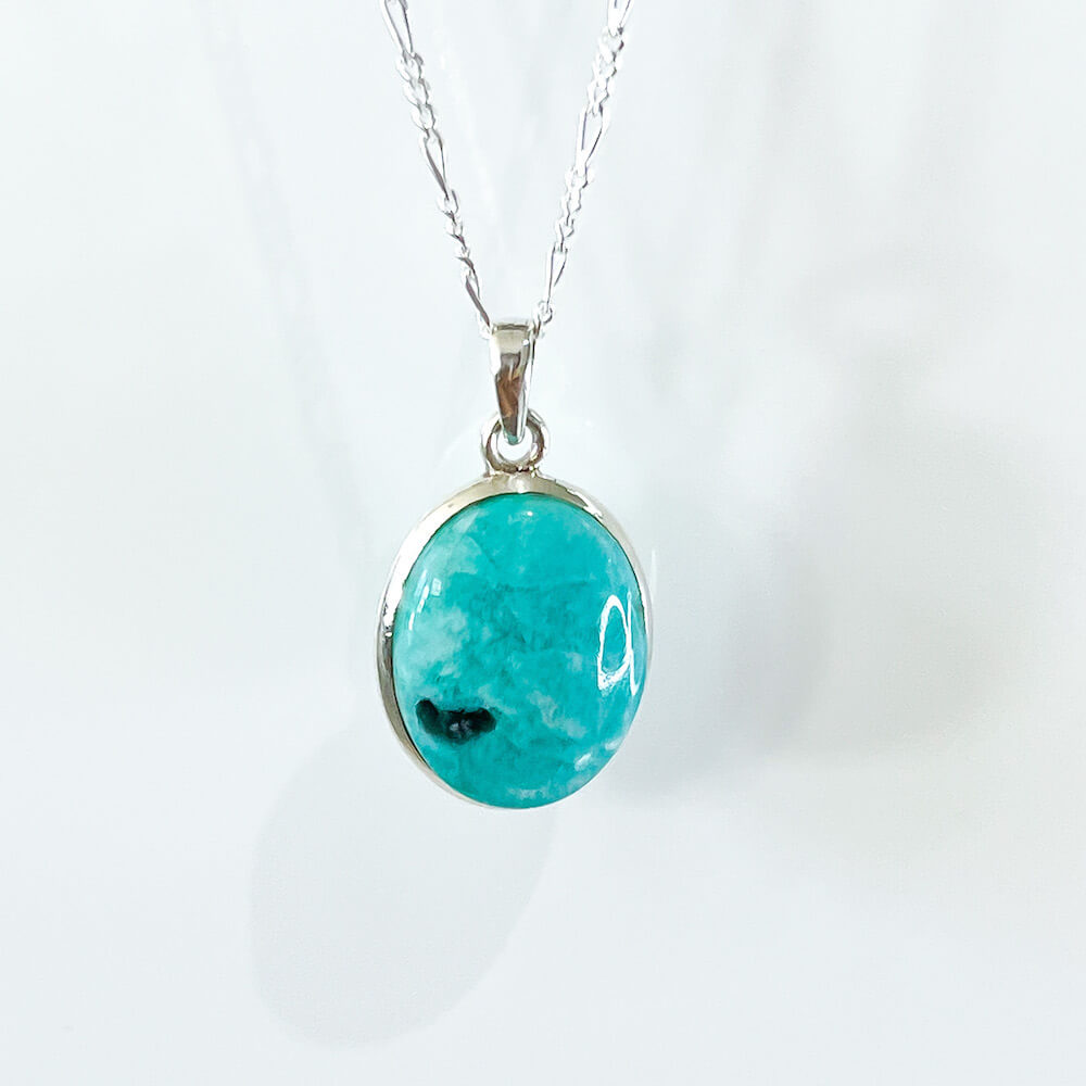 Magnífico bisel de piedra amazonita de primera calidad engarzado en plata de ley y colgado de una cadena de plata de ley.