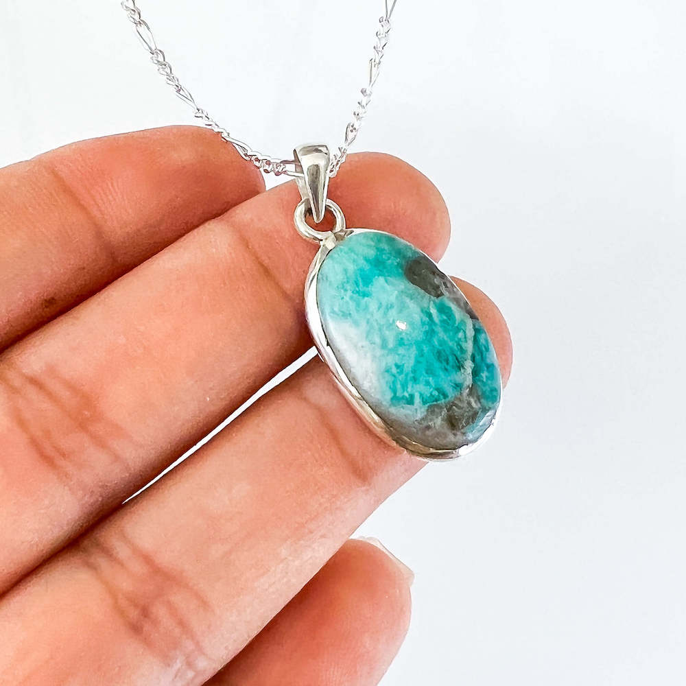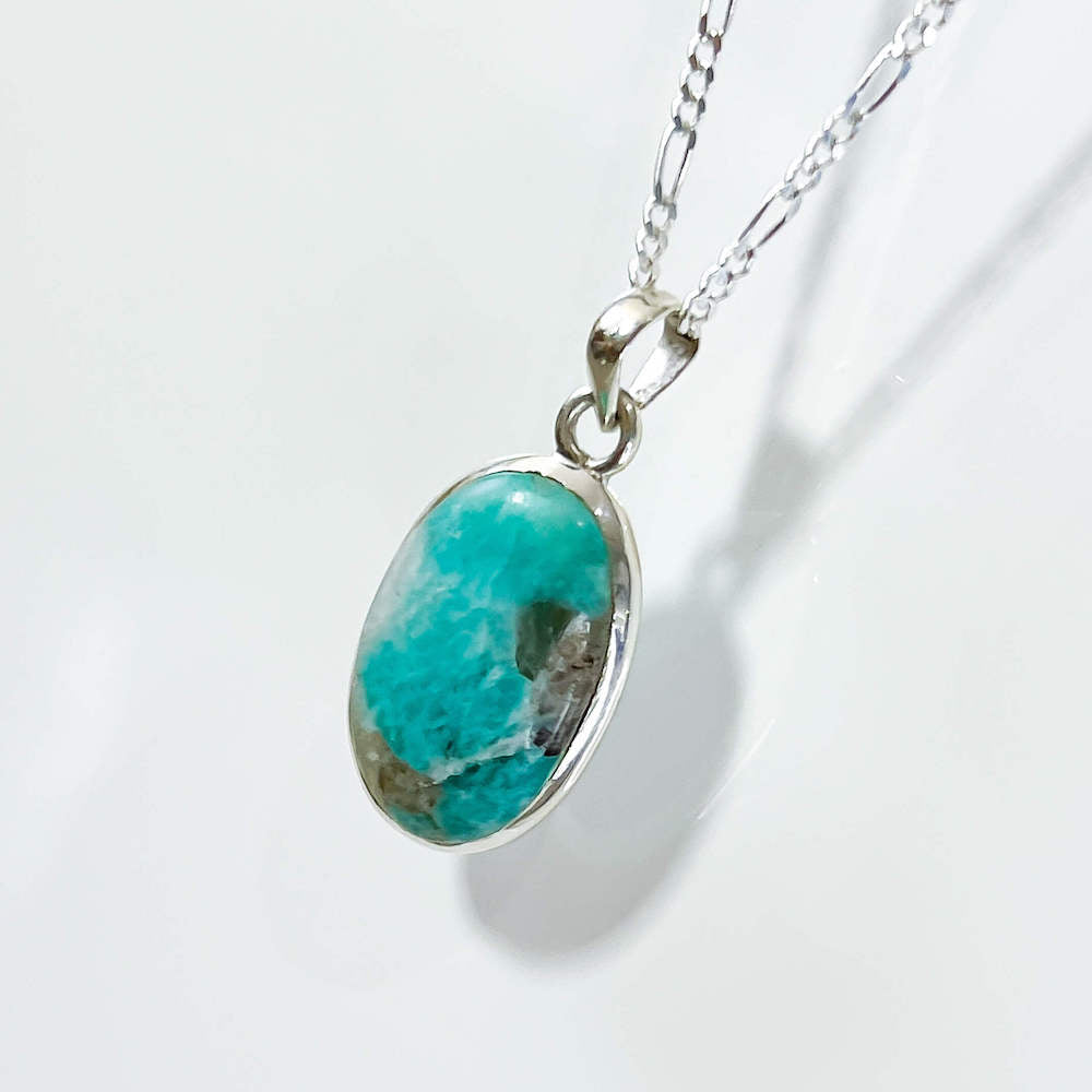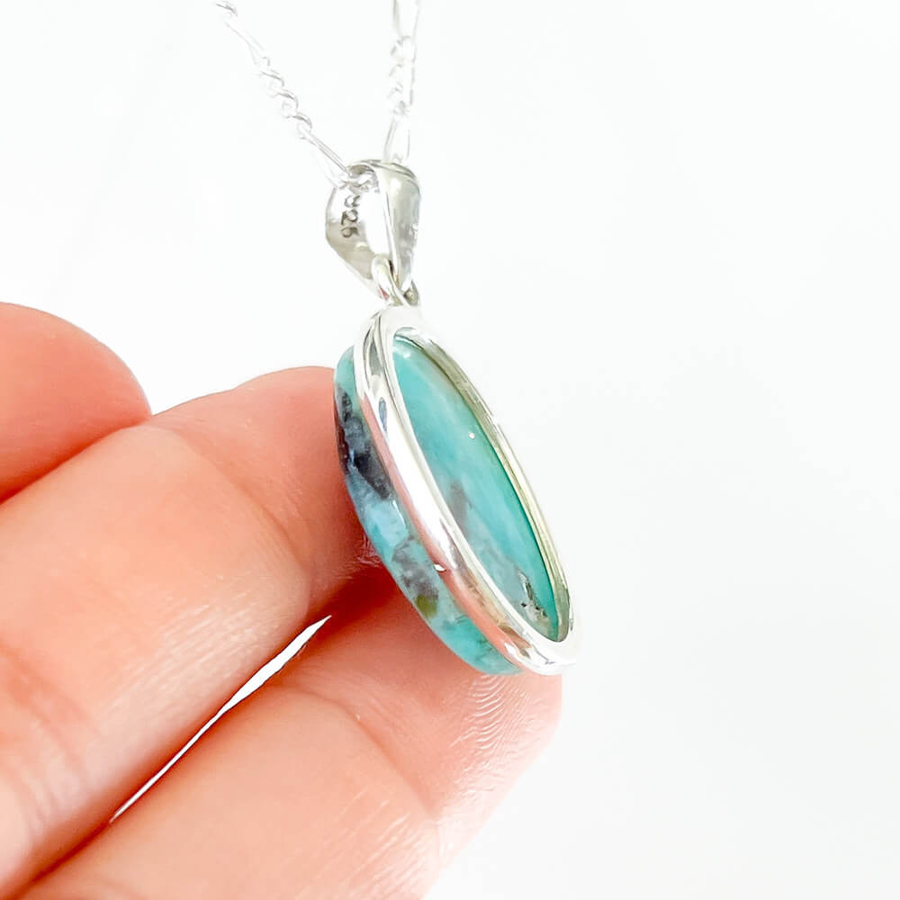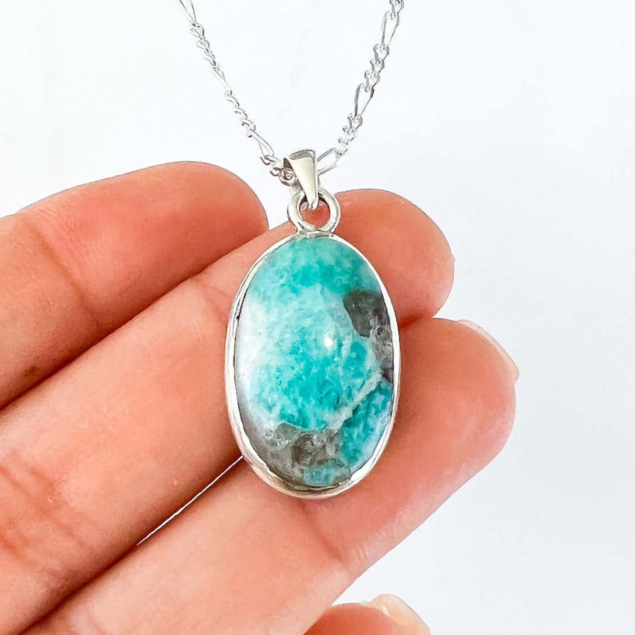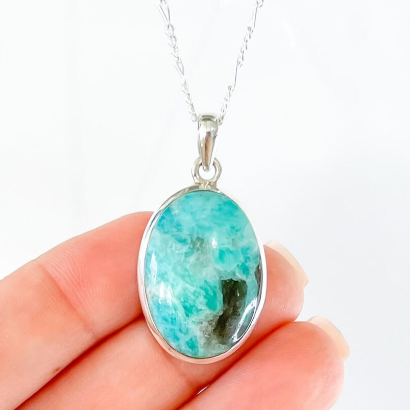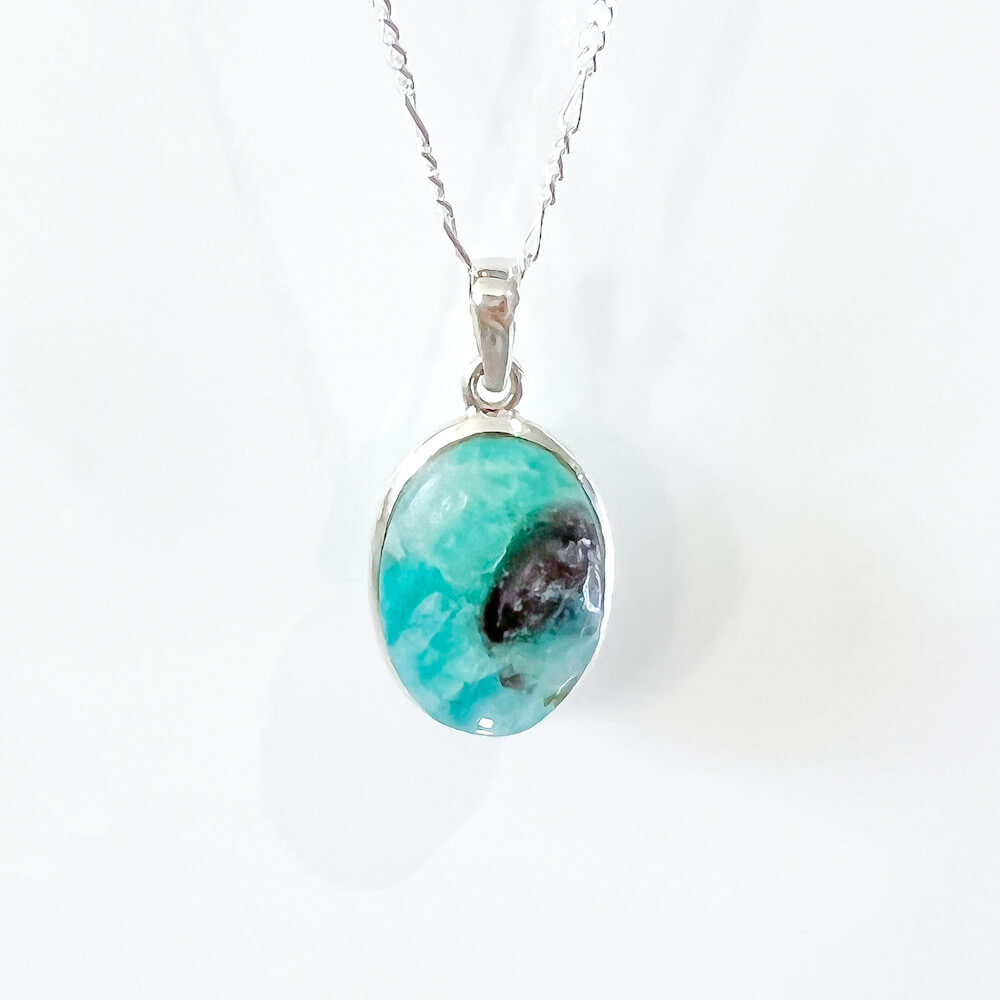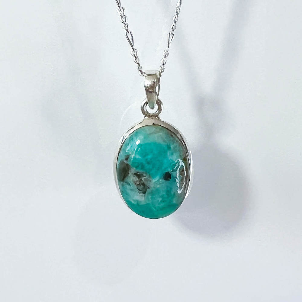 Magnífico bisel de piedra amazonita de primera calidad engarzado en plata de ley y colgado de una cadena de plata de ley.