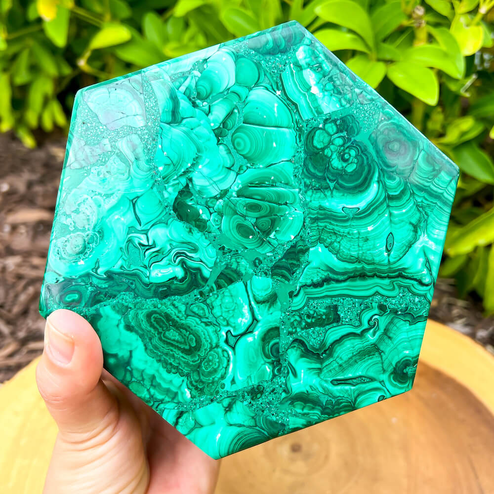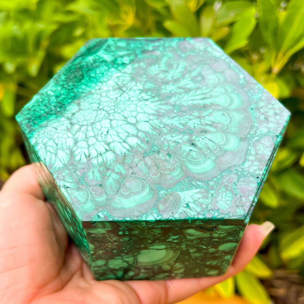 La malaquita es una piedra de transformación. Ya sea que la transformación se demuestre en este plano como un equilibrio entre el amor puro y el bienestar, la protección o la evolución espiritual, trae una transformación positiva una y otra vez. La malaquita también ayuda a realizar estos cambios transformadores con una dulzura de corazón, facilitando la transición de un estado a otro.