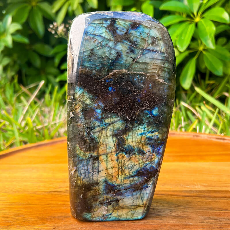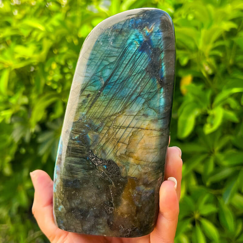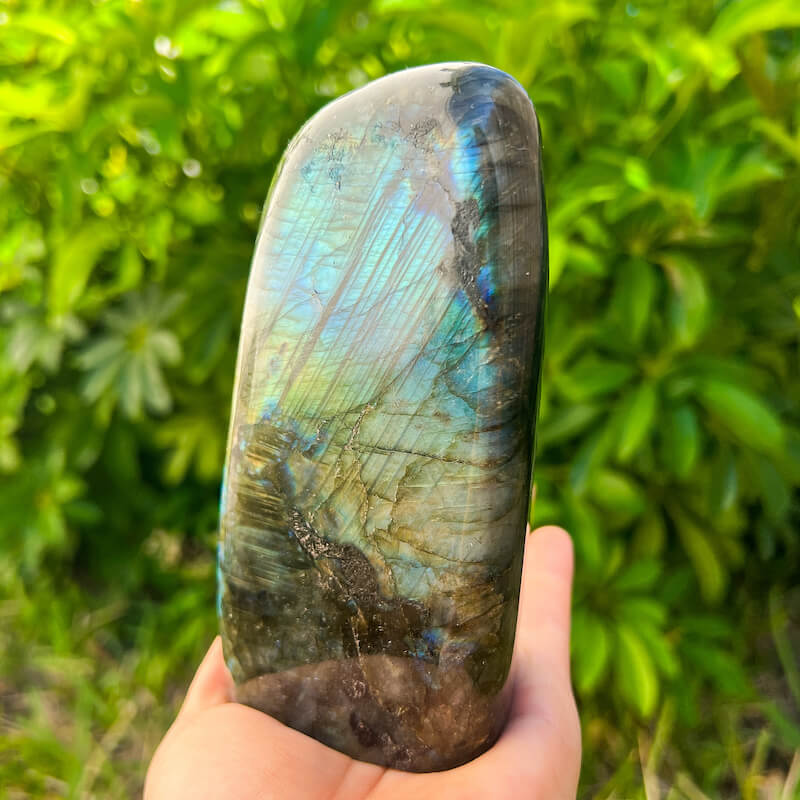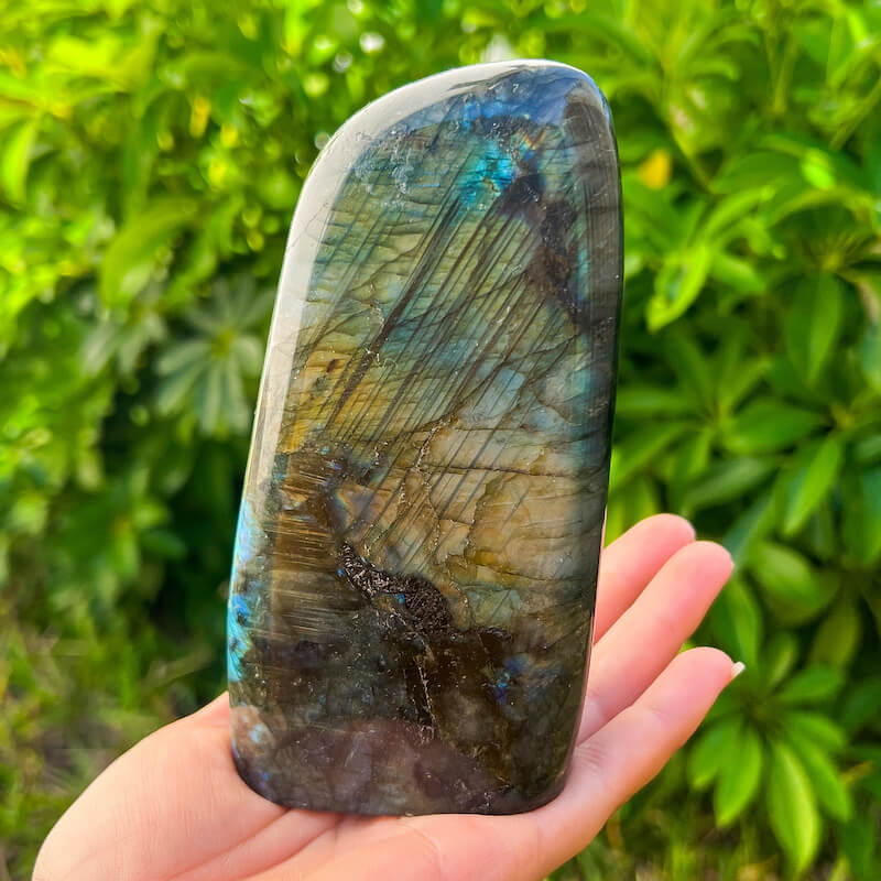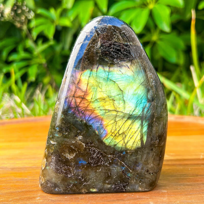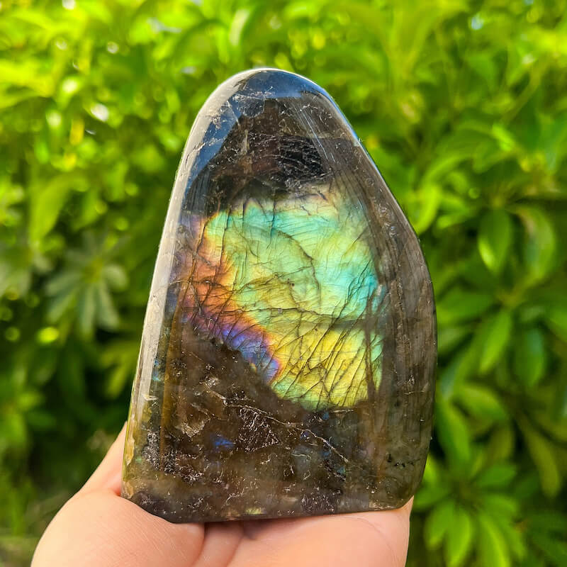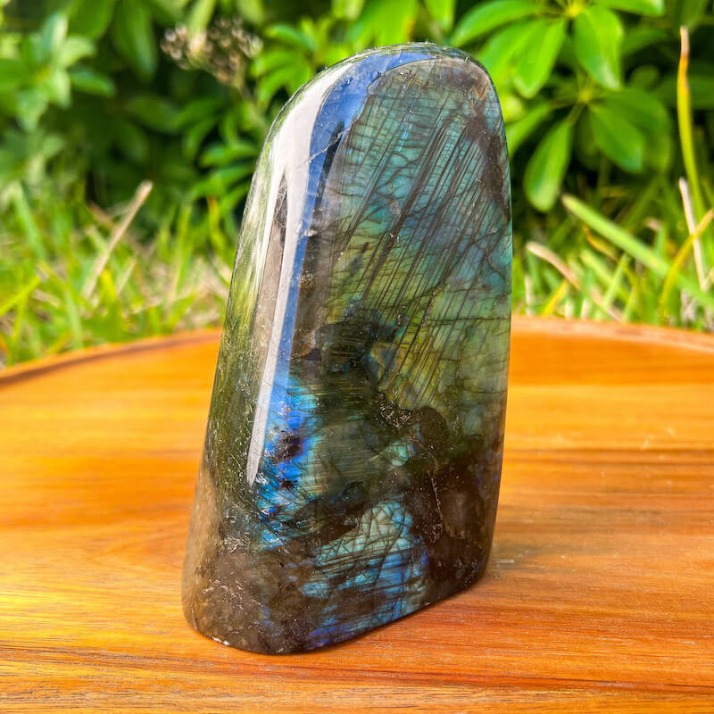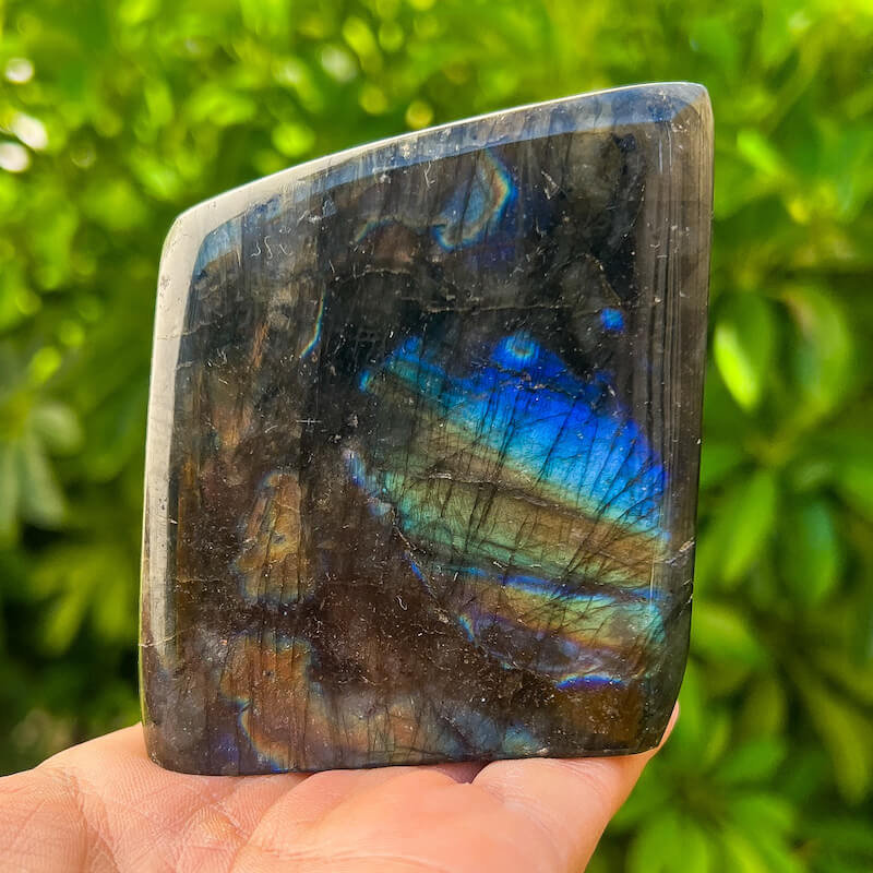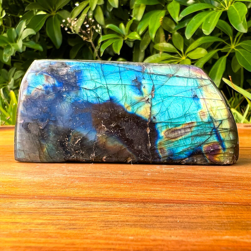 ¡Esta es una labradorita de destello alto absolutamente impresionante! Esta labradorita está pulida, tiene una forma libre y una labradorita de base cortada, lo que significa que se mantiene bien. ¡Los colores son preciosos y el flash es impresionante! ¡Esta pieza sería un gran regalo para alguien o una gran pieza para agregar a cualquier colección de cristales! Una piedra de transformación, la labradorita es una compañera útil a través del cambio, impartiendo fuerza y perseverancia. La labradorita se considera una piedra tremendamente espiritual, especialmente útil para las personas que tienden a trabajar demasiado. La labradorita es conocida por su vibración para iluminar el camino del destino espiritual.