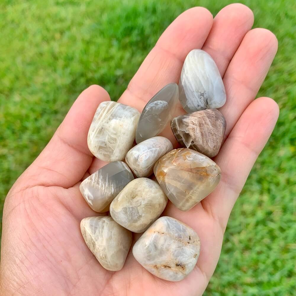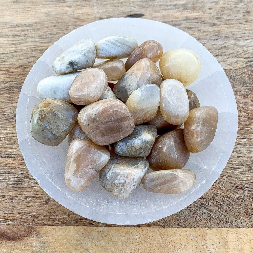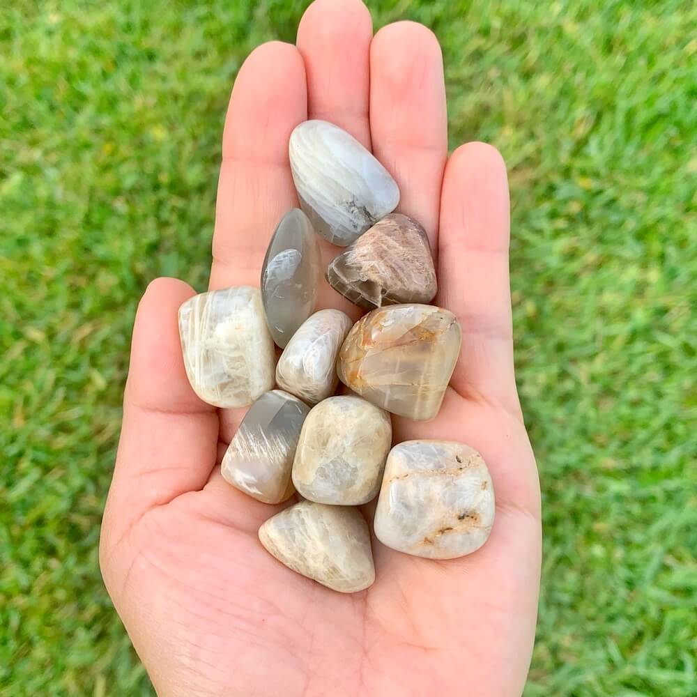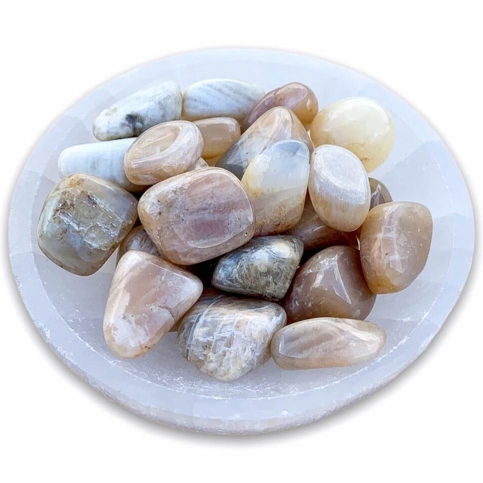 La piedra lunar se dice en la sanación con cristales para ayudar a calmar las respuestas y evitar reacciones exageradas. Aporta esperanza, potencia las energías femeninas, la sensibilidad, la intuición y las capacidades psíquicas. También se dice que trae fuertes energías de abundancia a la vida. También se asocia con el amor de todo tipo.