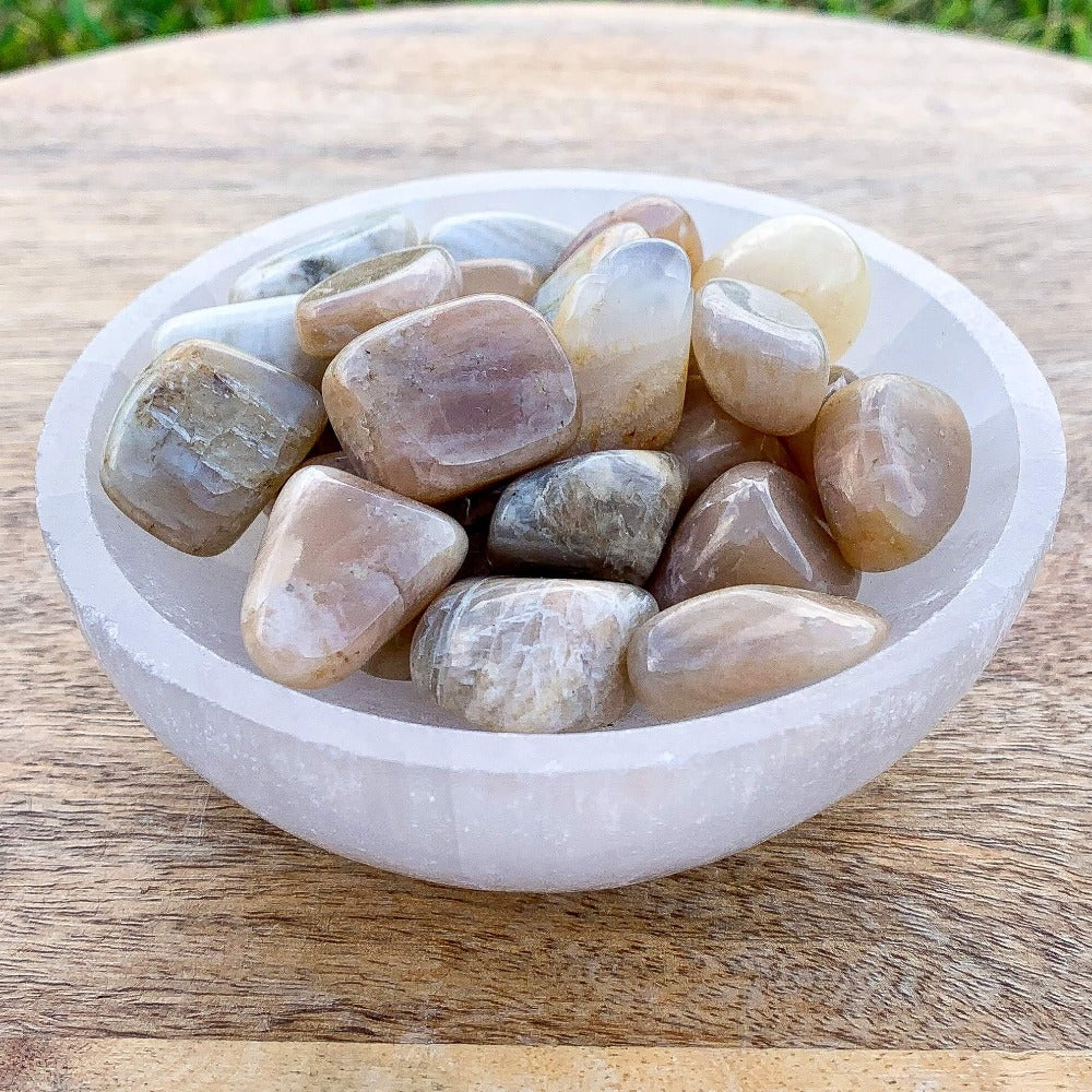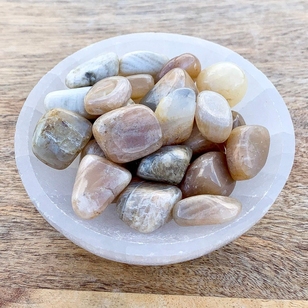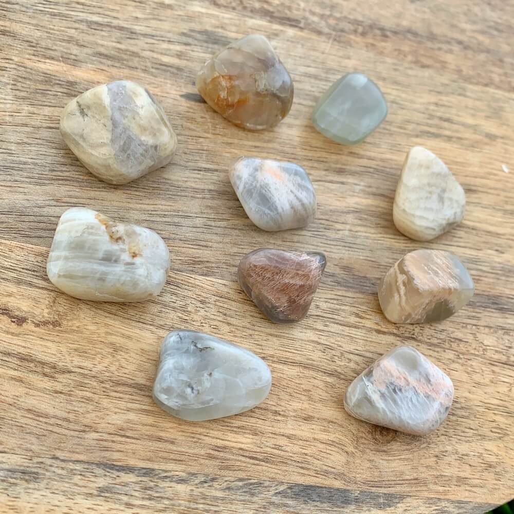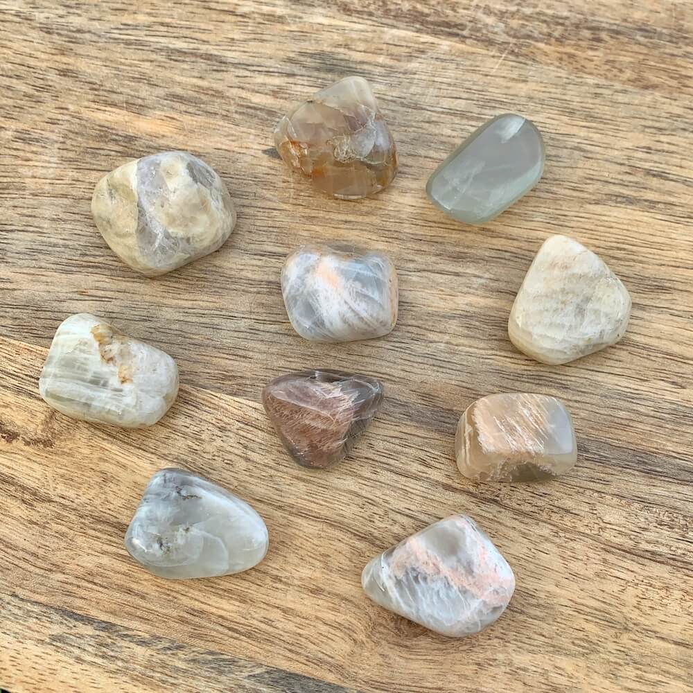 La piedra lunar se dice en la sanación con cristales para ayudar a calmar las respuestas y evitar reacciones exageradas. Aporta esperanza, potencia las energías femeninas, la sensibilidad, la intuición y las capacidades psíquicas. También se dice que trae fuertes energías de abundancia a la vida. También se asocia con el amor de todo tipo.