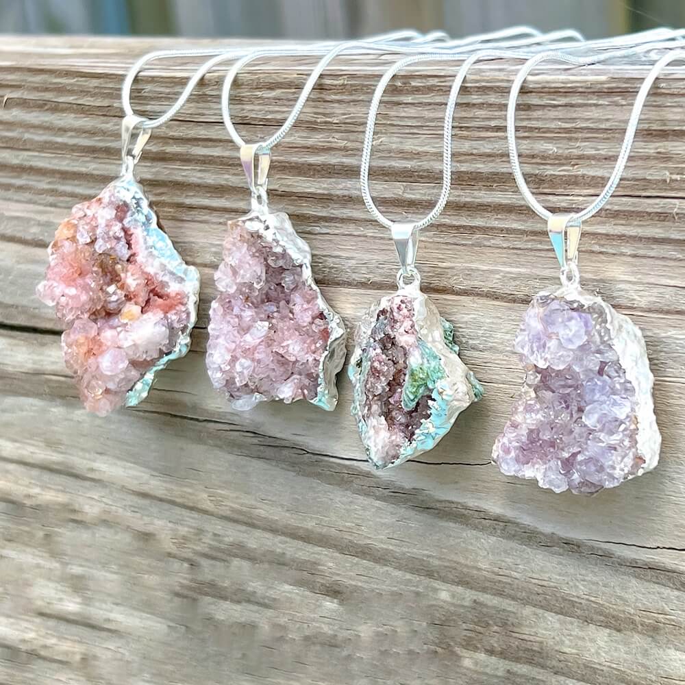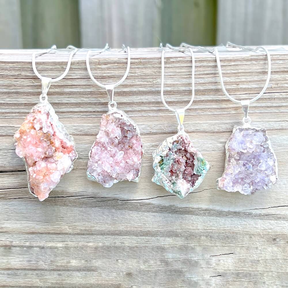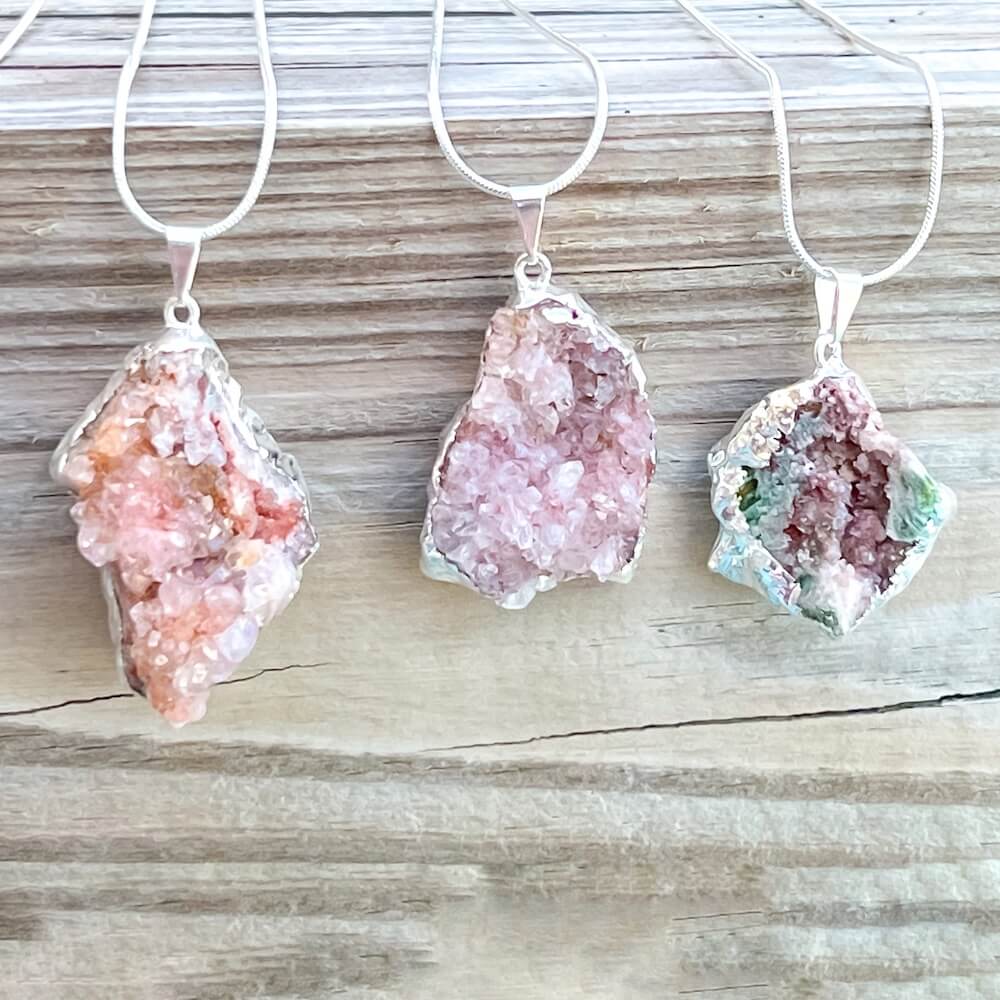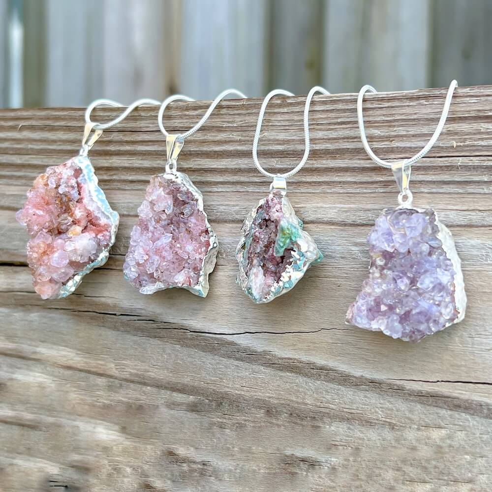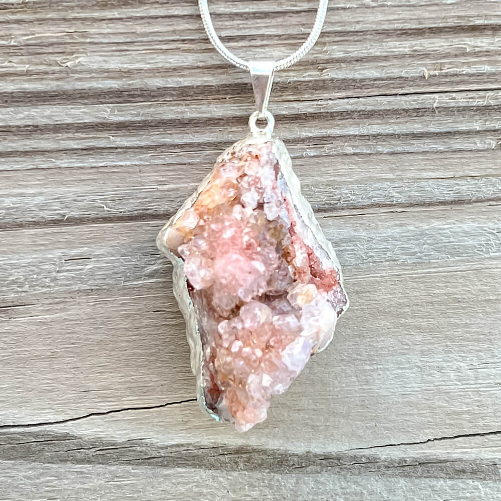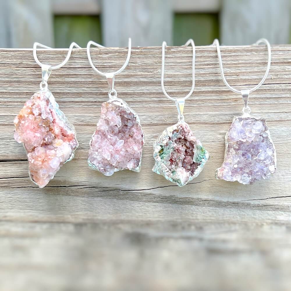Hermosa pieza de amatista rosa natural de la Patagonia, Argentina convertida en collares. Cada colgante es único y se elige intuitivamente para usted. Cada colgante fue seleccionado a mano para garantizar calidad y belleza. Pink Amethyst es un movimiento hacia el equilibrio emocional y la paz general. Se sabe que esta piedra infunde sentimientos de comprensión, calma, confianza y gracia. Mayor intuición y claridad.