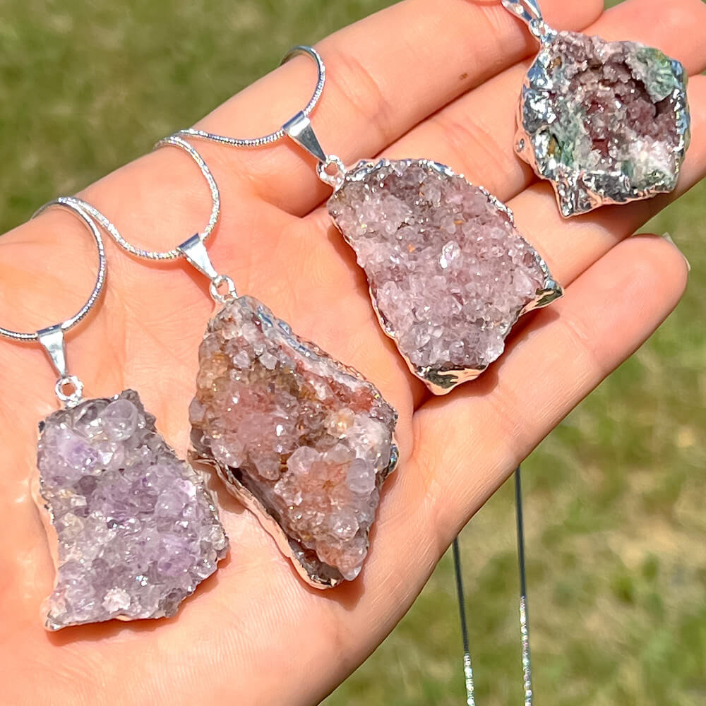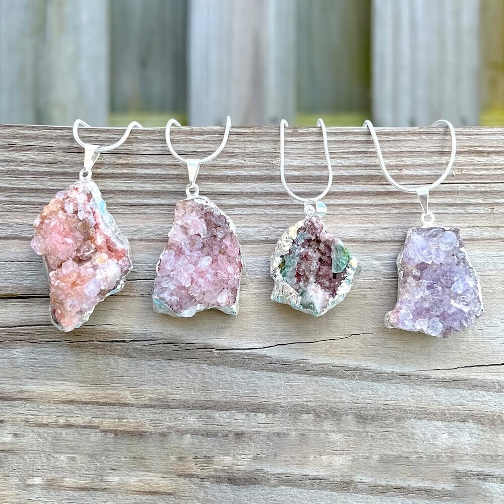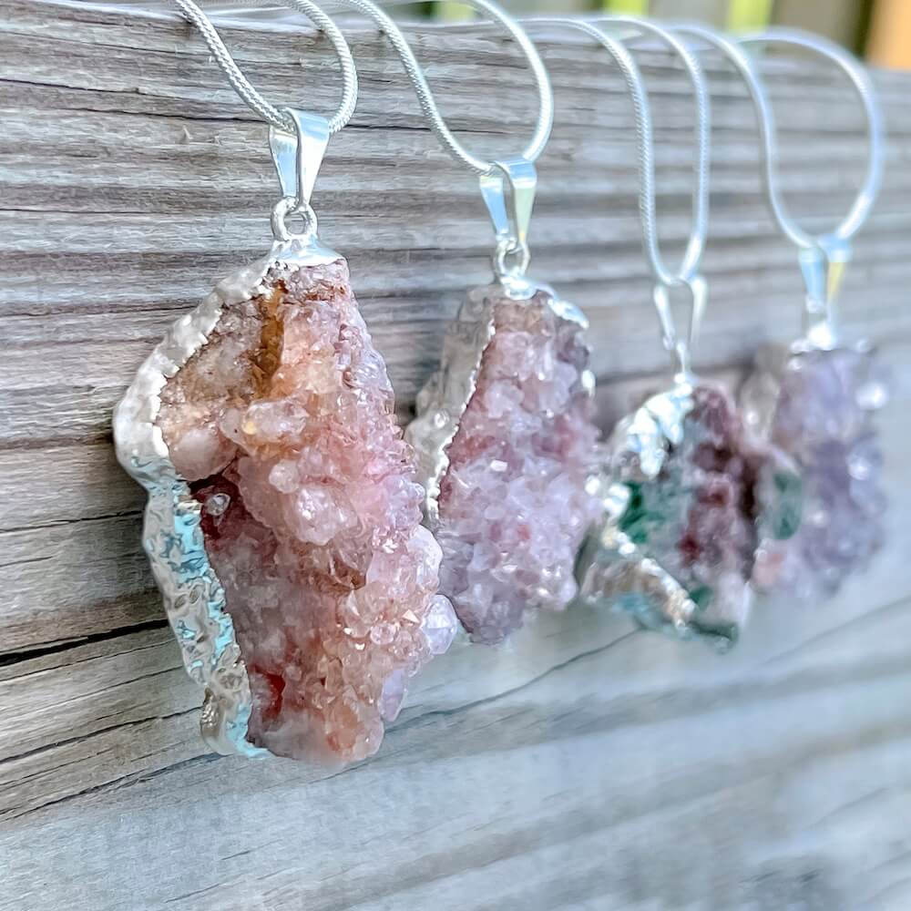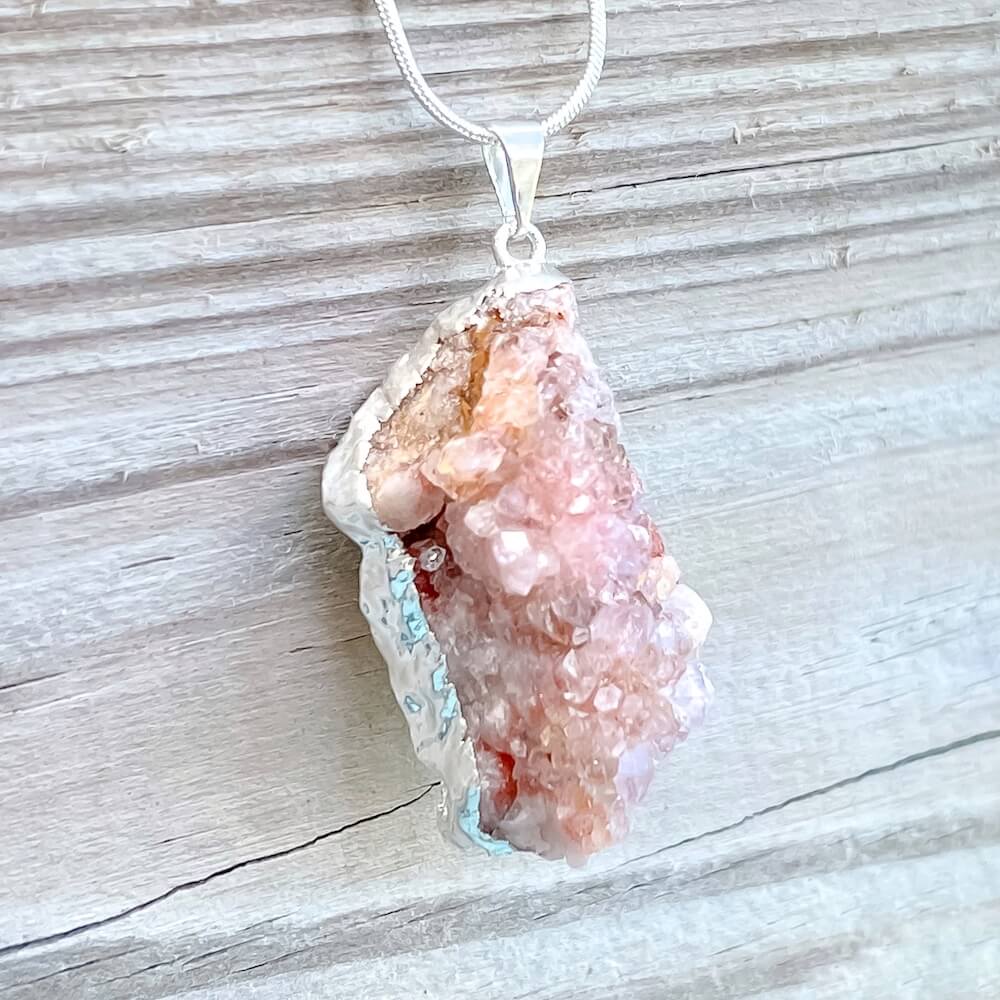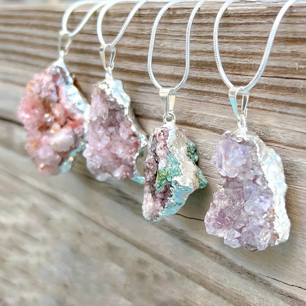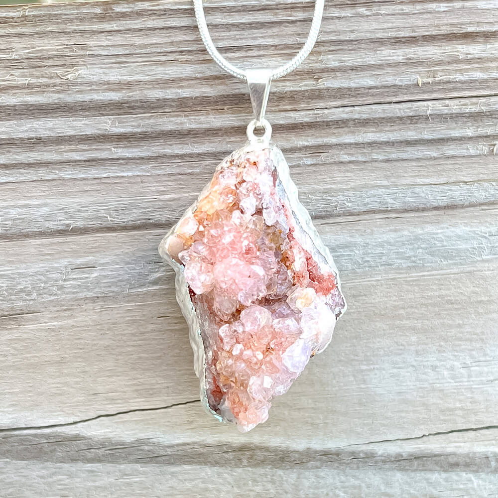 Hermosa pieza de amatista rosa natural de la Patagonia, Argentina convertida en collares. Cada colgante es único y se elige intuitivamente para usted. Cada colgante fue seleccionado a mano para garantizar calidad y belleza. Pink Amethyst es un movimiento hacia el equilibrio emocional y la paz general. Se sabe que esta piedra infunde sentimientos de comprensión, calma, confianza y gracia. Mayor intuición y claridad.