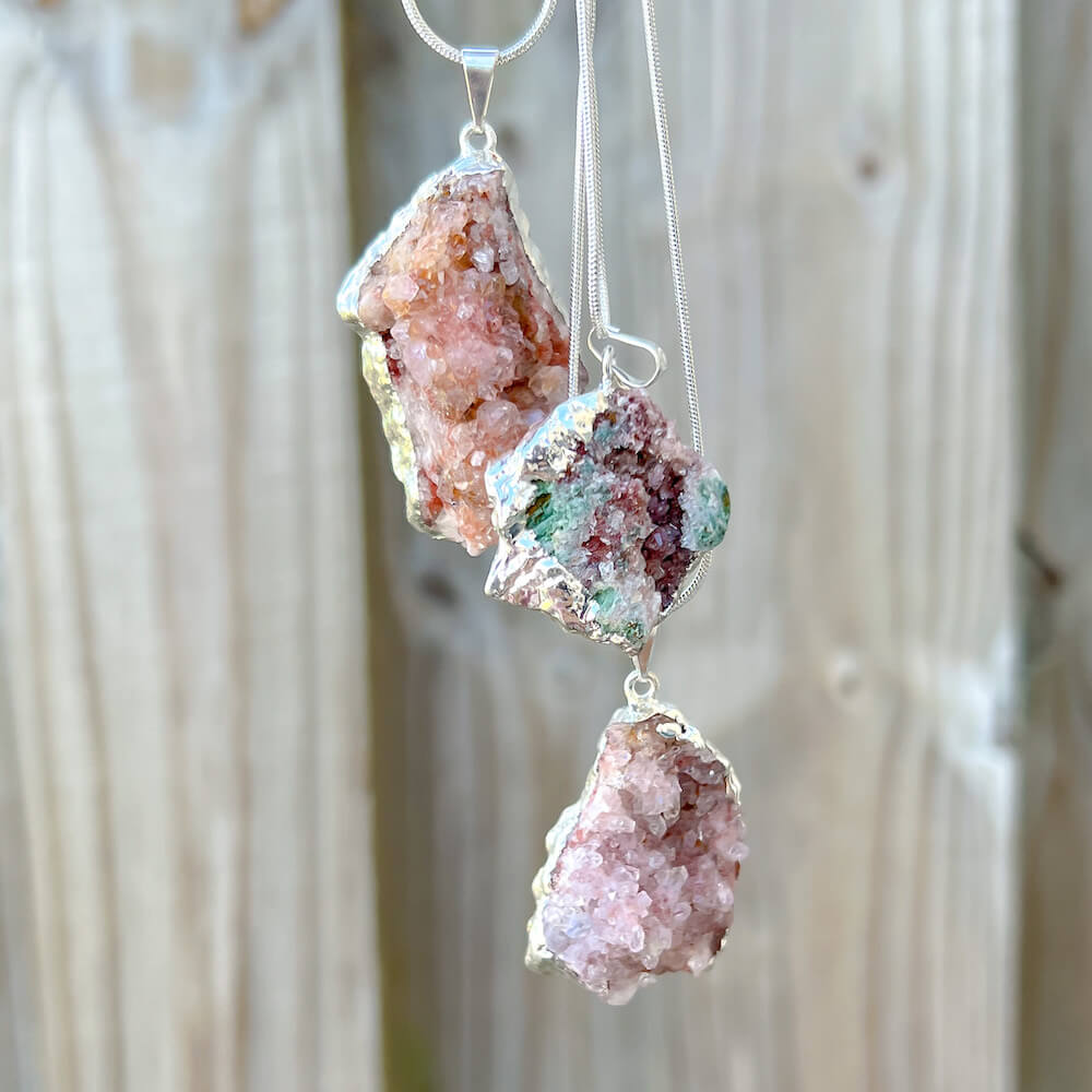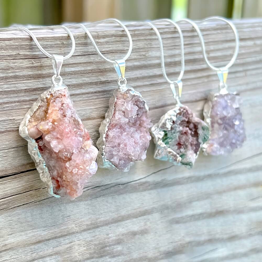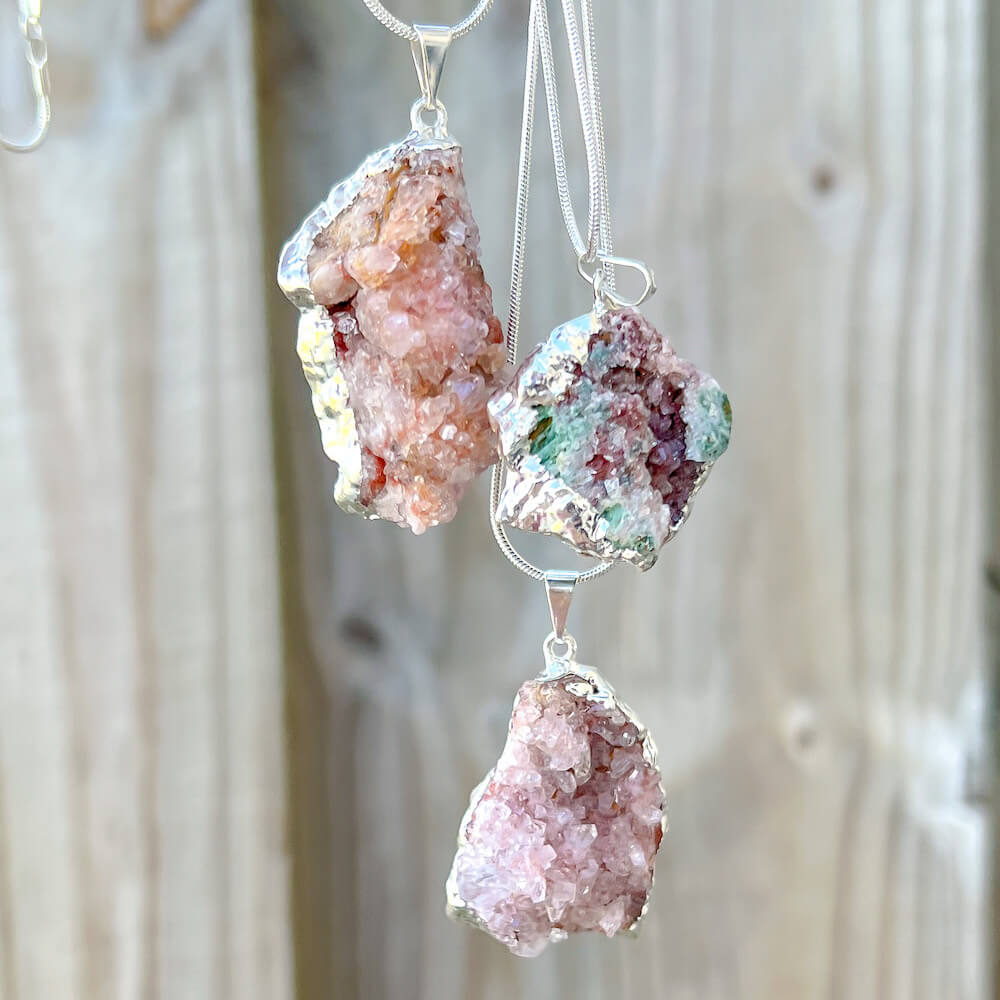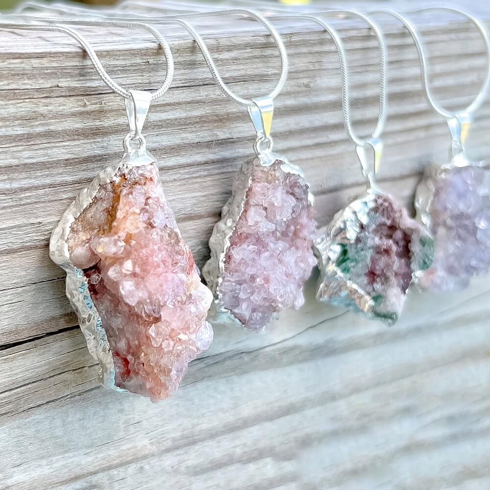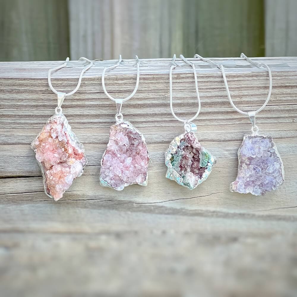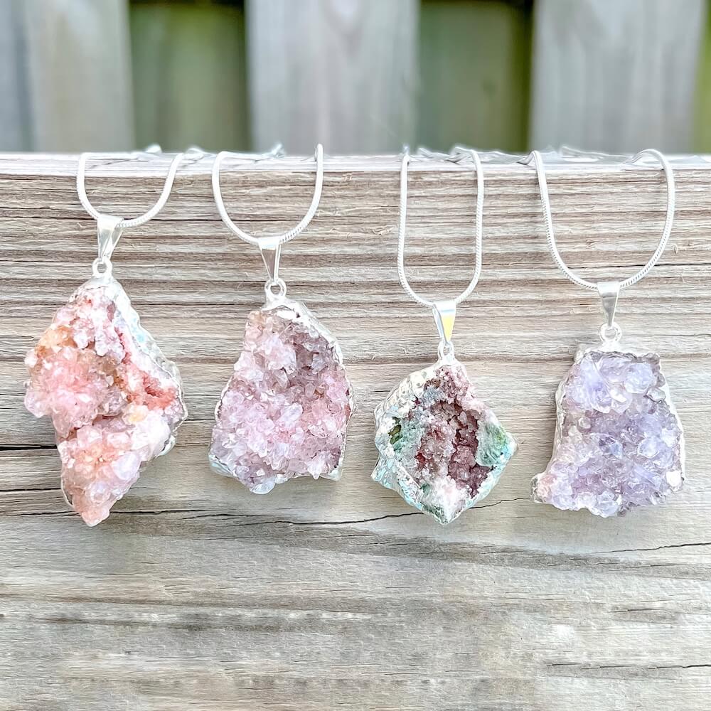 Hermosa pieza de amatista rosa natural de la Patagonia, Argentina convertida en collares. Cada colgante es único y se elige intuitivamente para usted. Cada colgante fue seleccionado a mano para garantizar calidad y belleza. Pink Amethyst es un movimiento hacia el equilibrio emocional y la paz general. Se sabe que esta piedra infunde sentimientos de comprensión, calma, confianza y gracia. Mayor intuición y claridad.