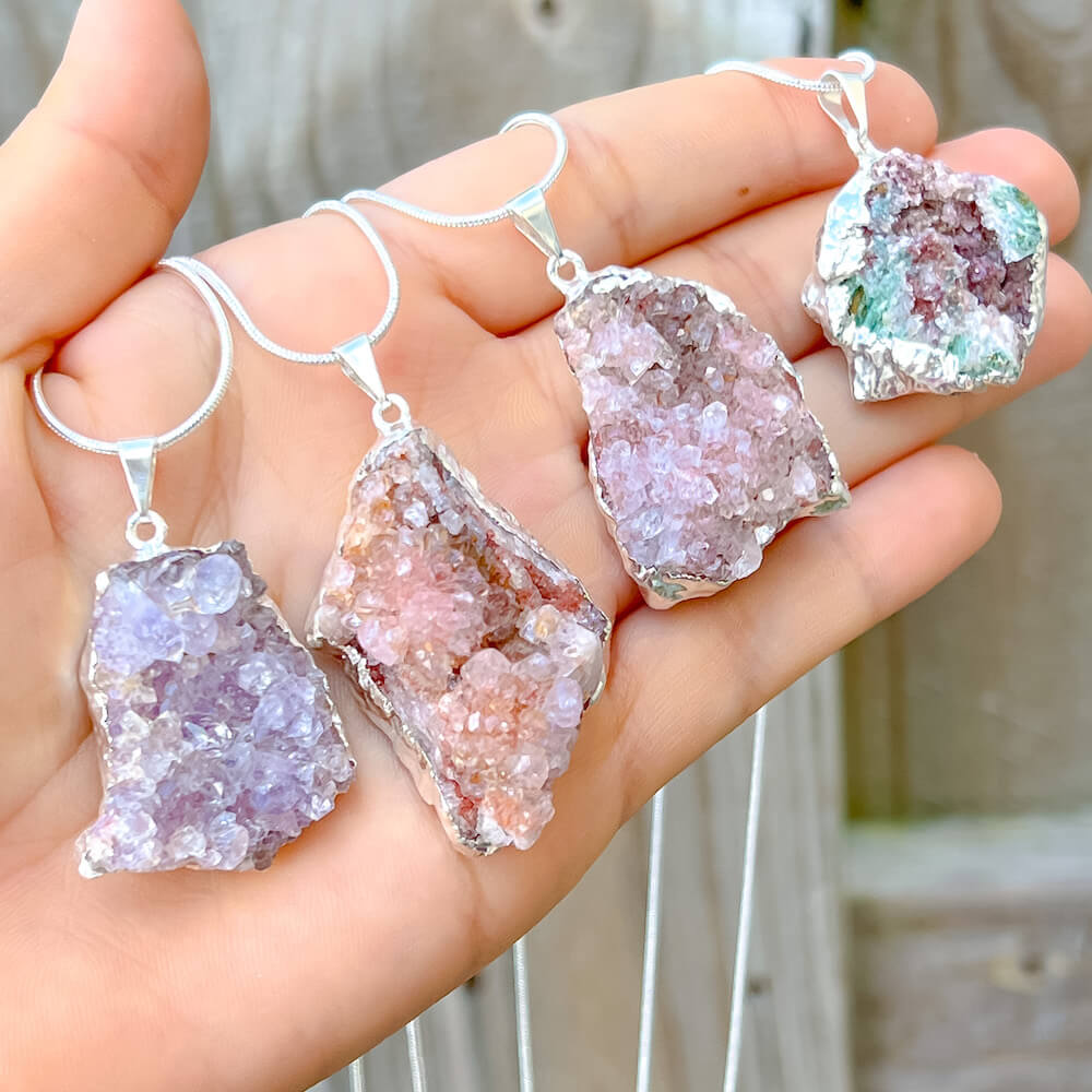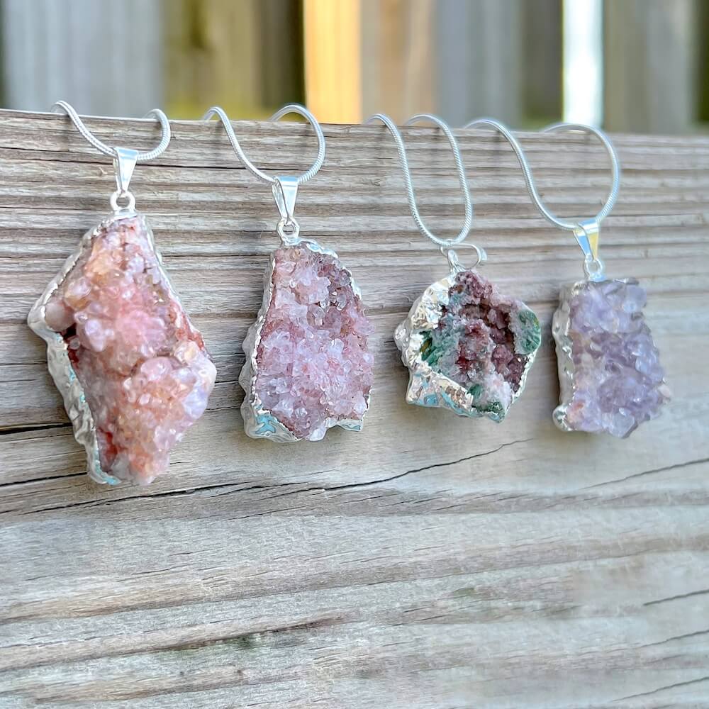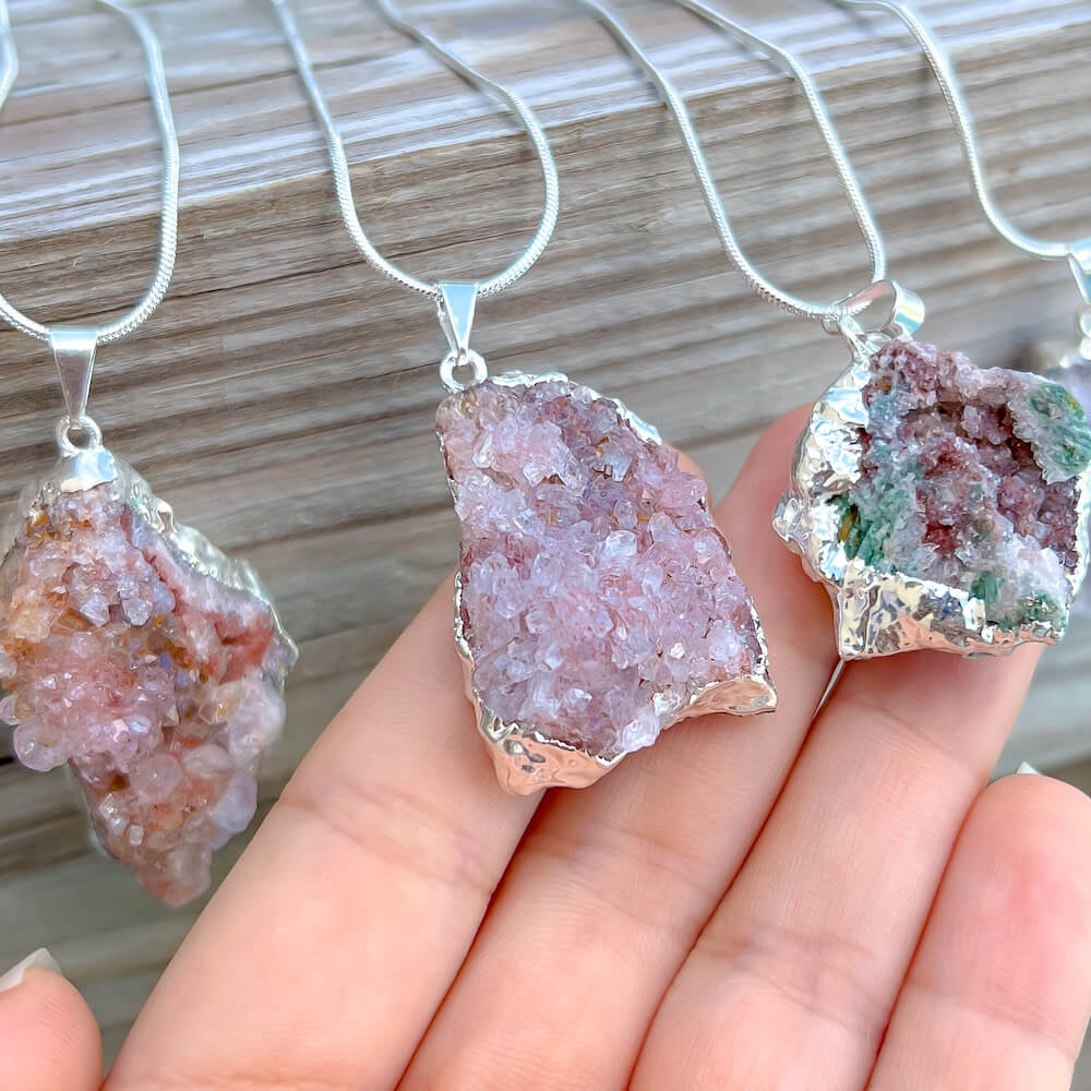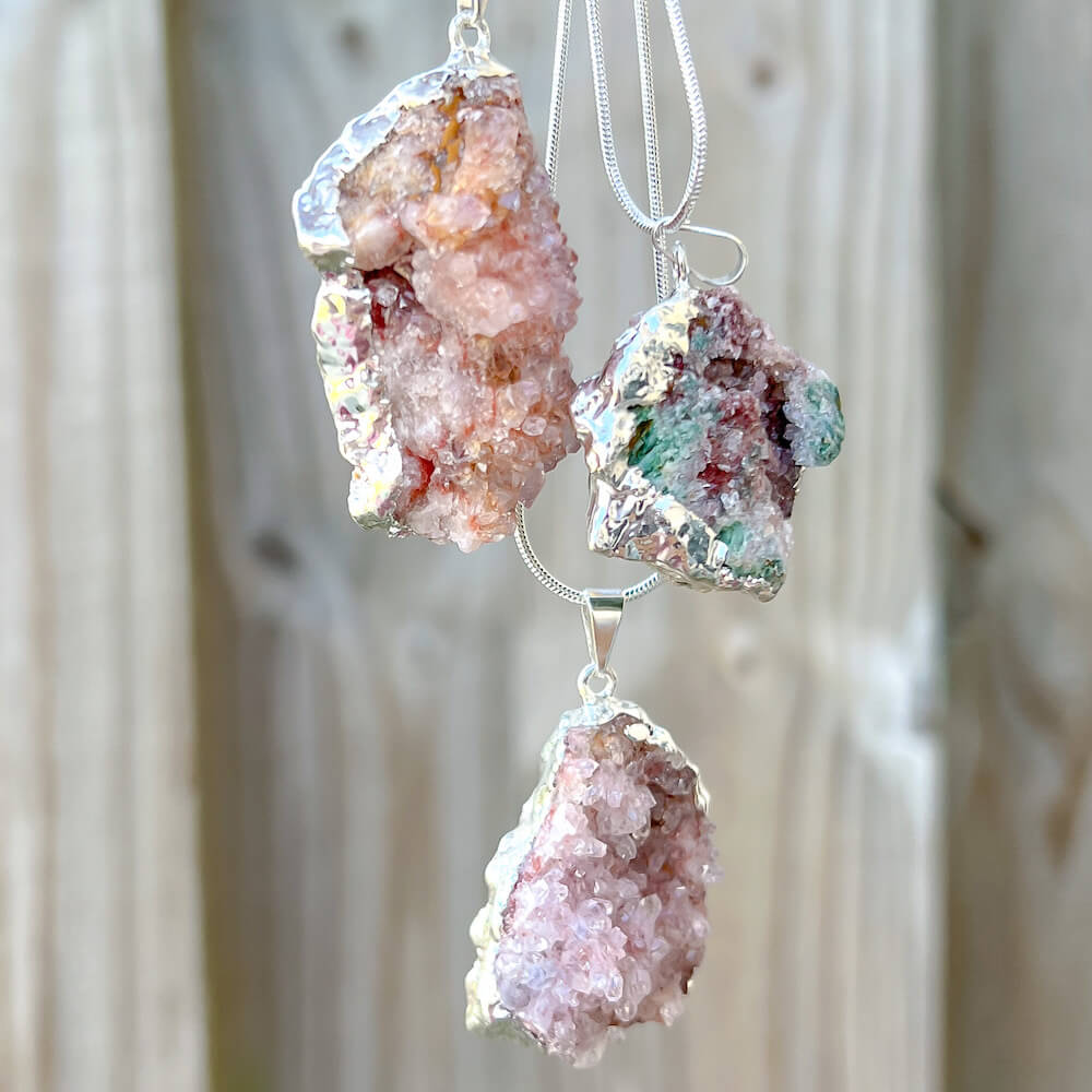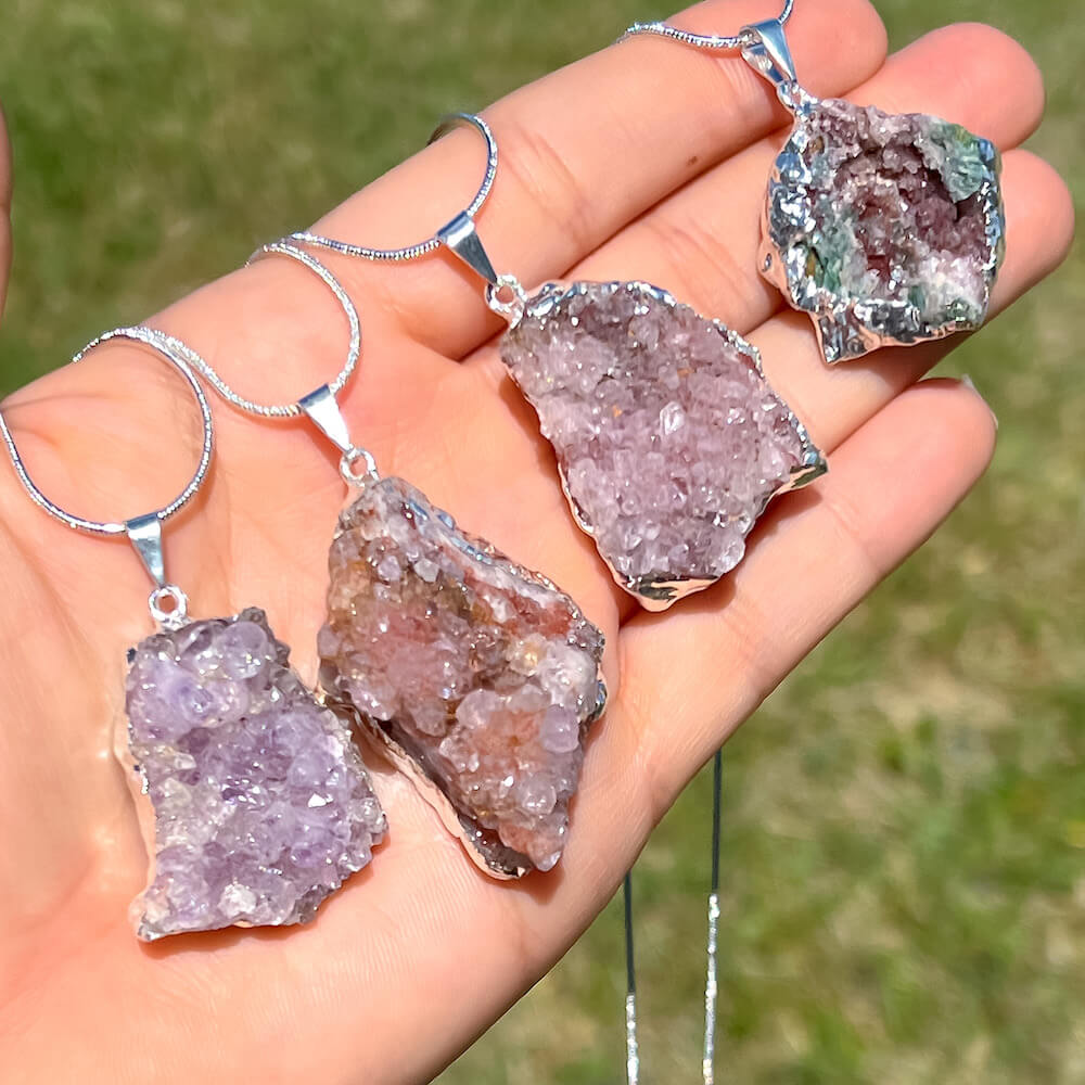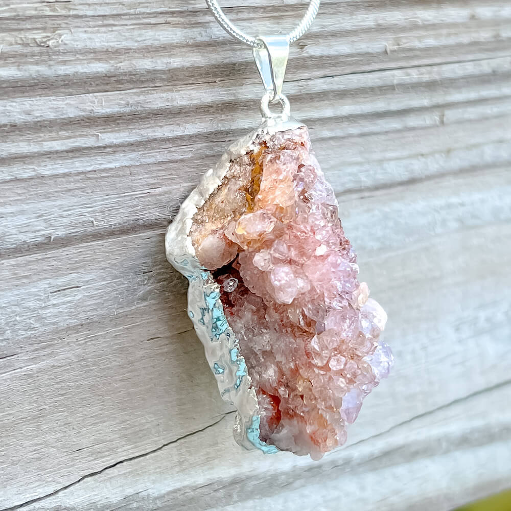 Hermosa pieza de amatista rosa natural de la Patagonia, Argentina convertida en collares. Cada colgante es único y se elige intuitivamente para usted. Cada colgante fue seleccionado a mano para garantizar calidad y belleza. Pink Amethyst es un movimiento hacia el equilibrio emocional y la paz general. Se sabe que esta piedra infunde sentimientos de comprensión, calma, confianza y gracia. Mayor intuición y claridad.
