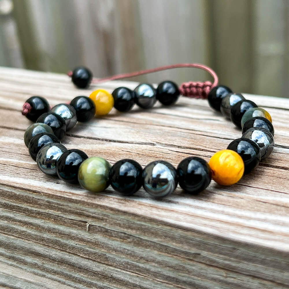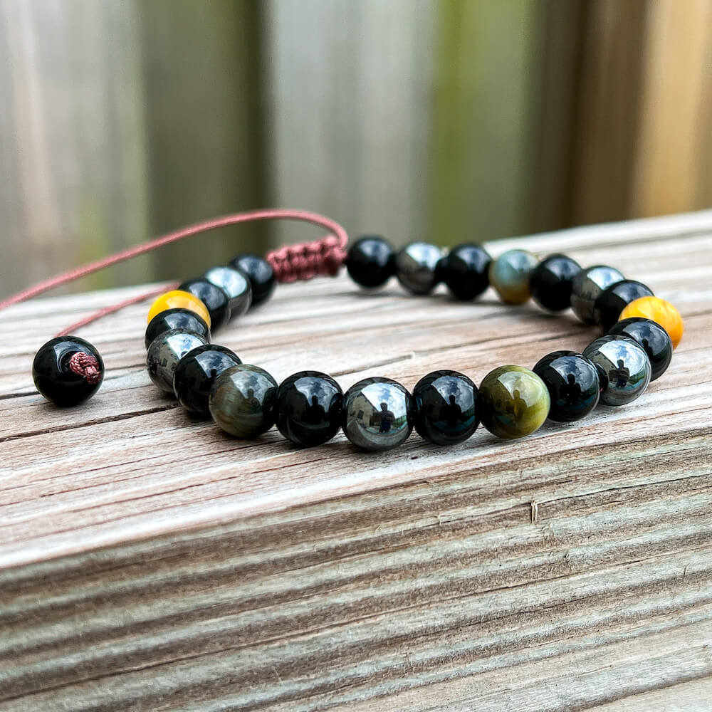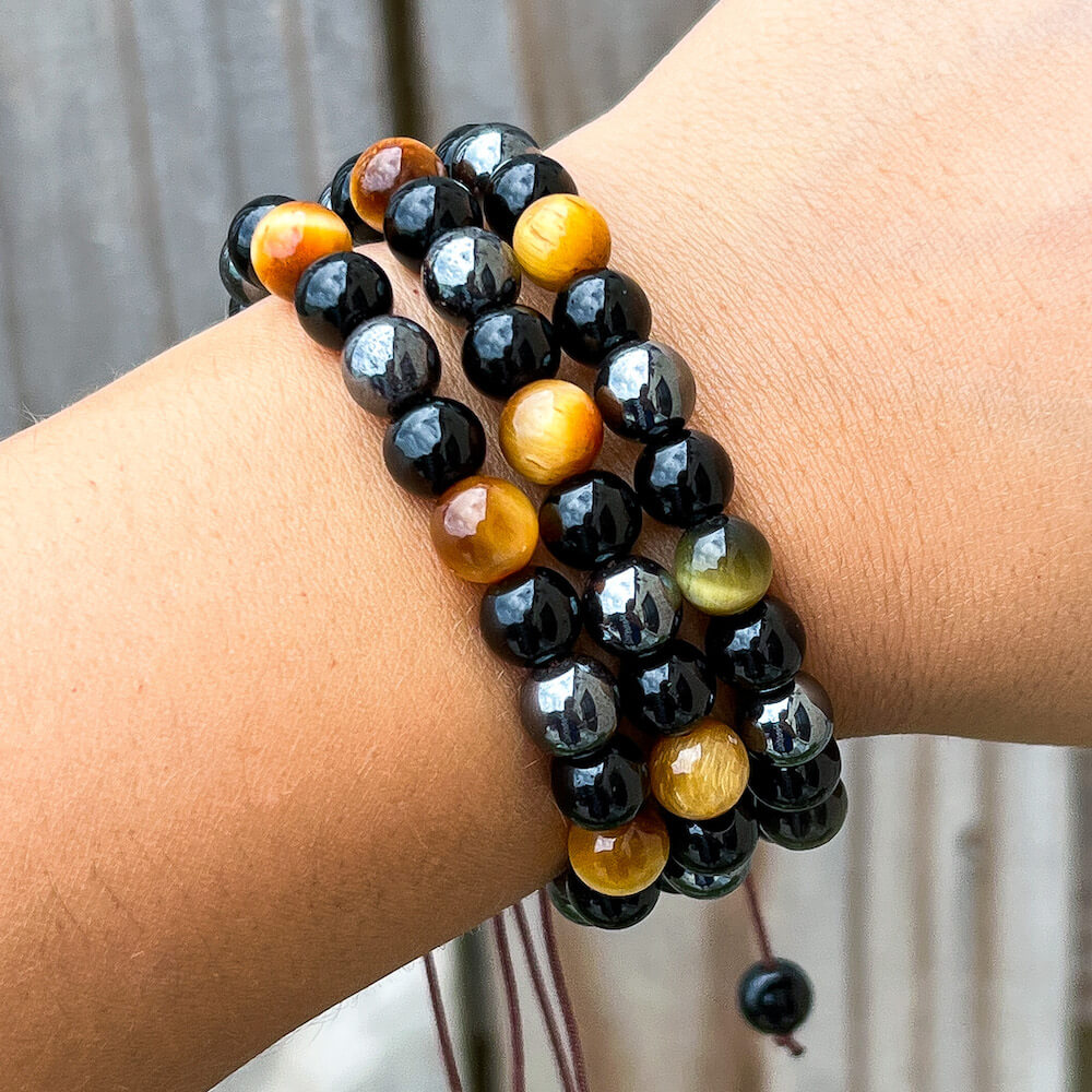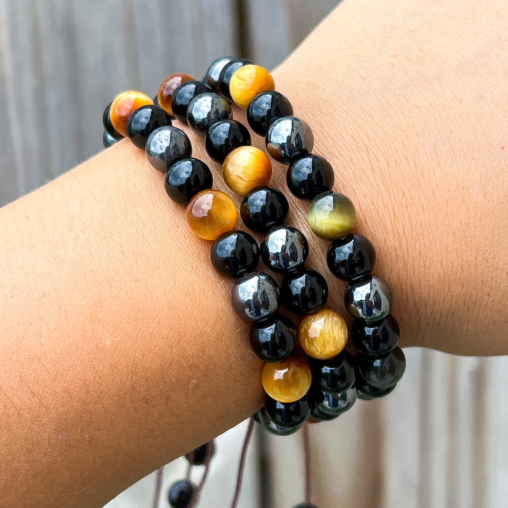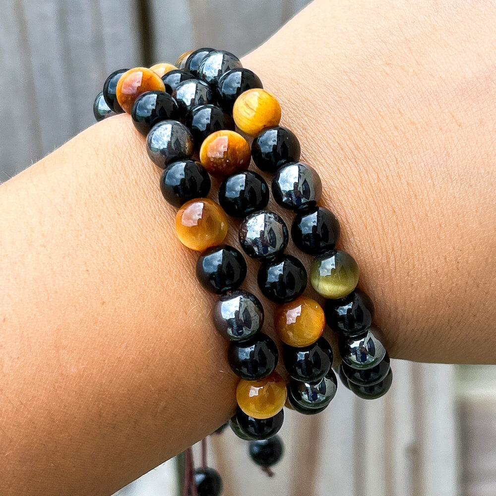 Pulsera Triple Protección - Cuentas Ajustables de Ojo de Tigre Natural de Ensueño, Obsidiana Negra y Hematites
