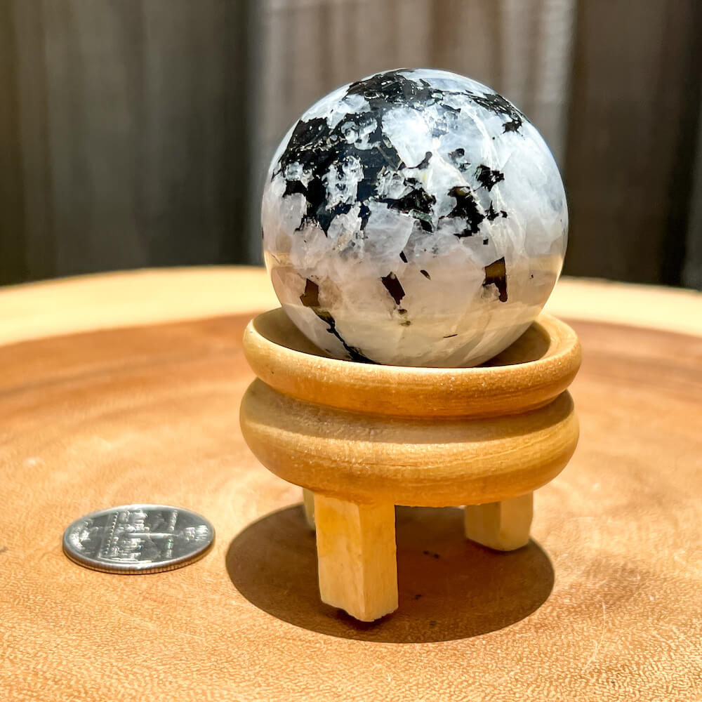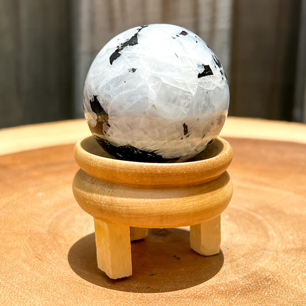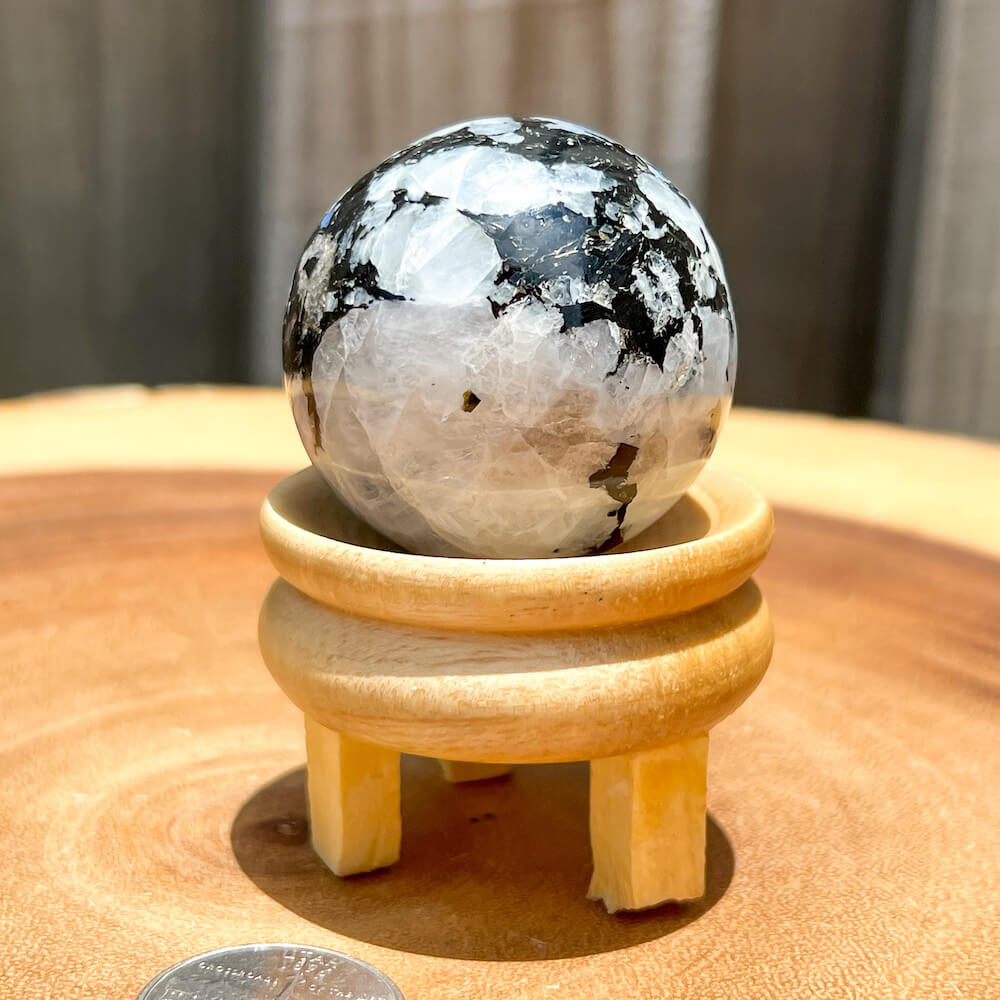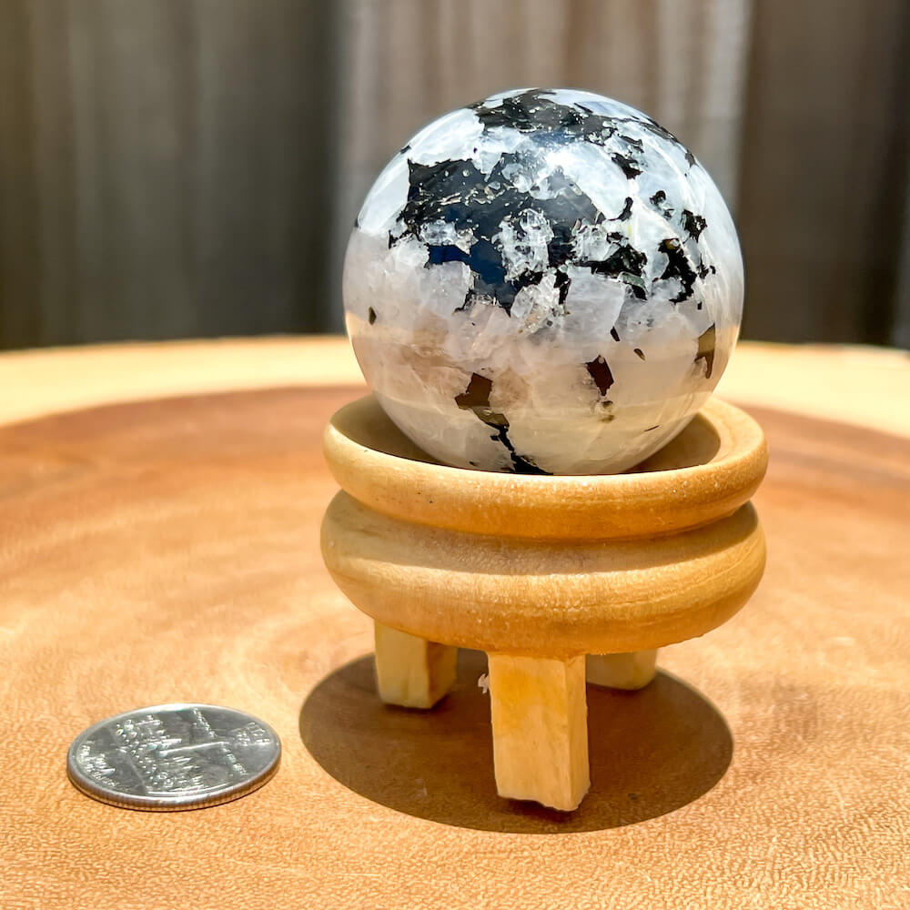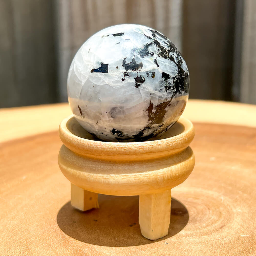 ¡Canaliza la magia de la luna llena con esta radiante esfera de piedra lunar arcoíris ! La piedra lunar arcoíris resuena con la fase de luna llena: un momento de celebración, gratitud, expansión, posibilidad y realización. Coloque esta esfera en su espacio sagrado y permita que irradie vibraciones puras y positivas en todas las direcciones.