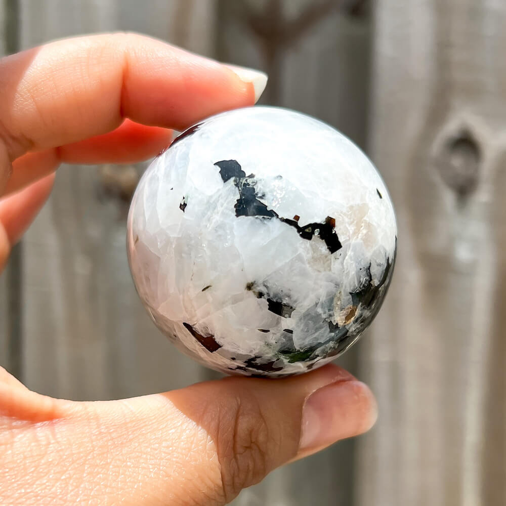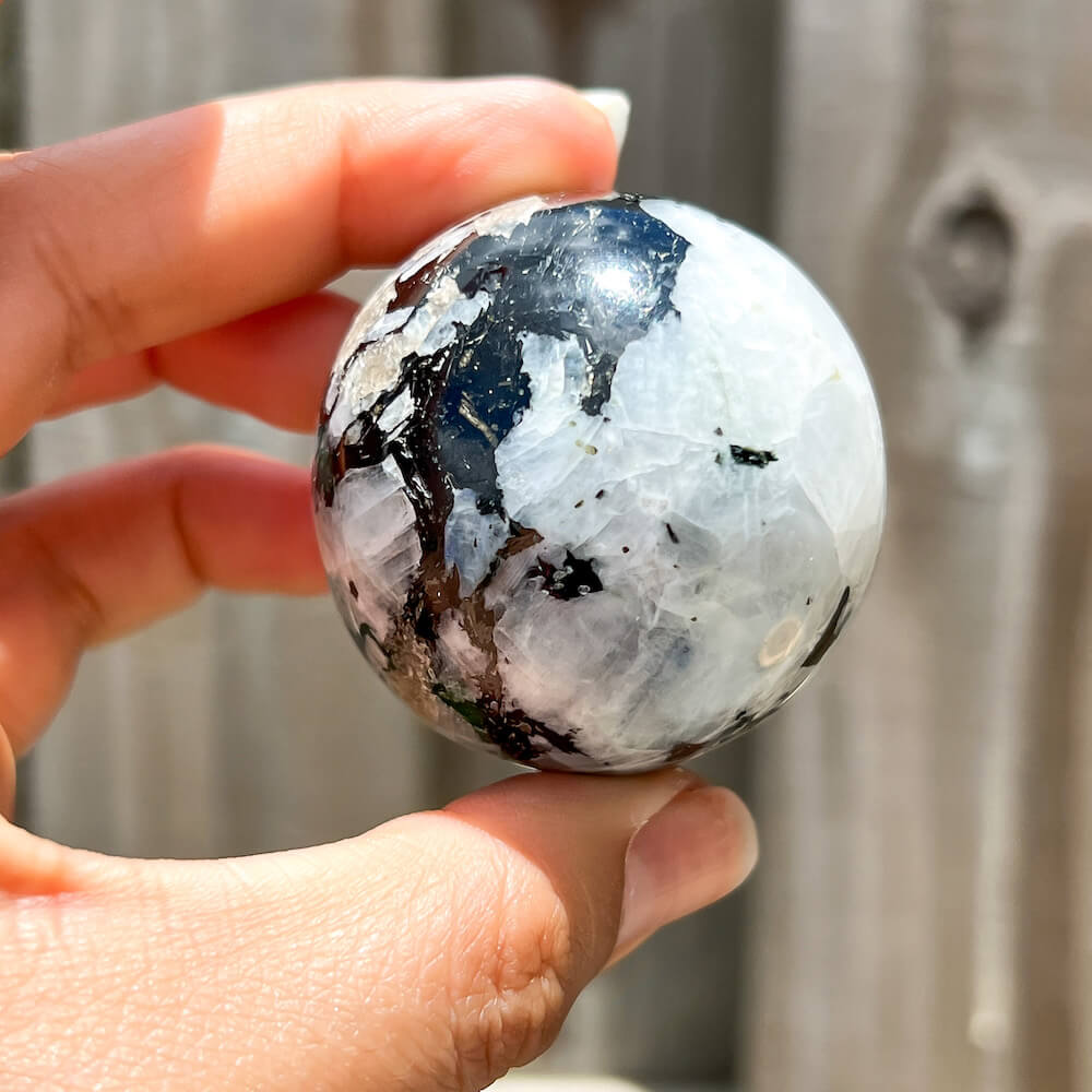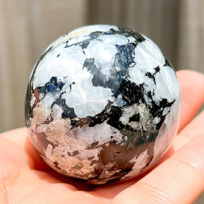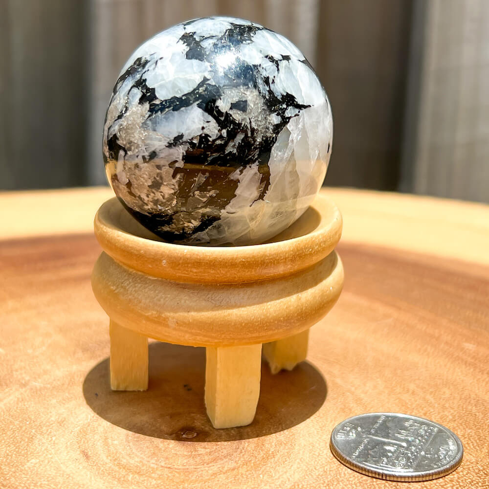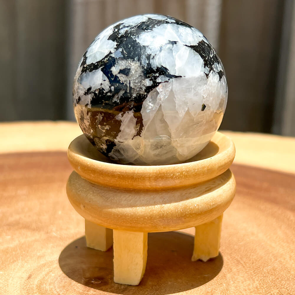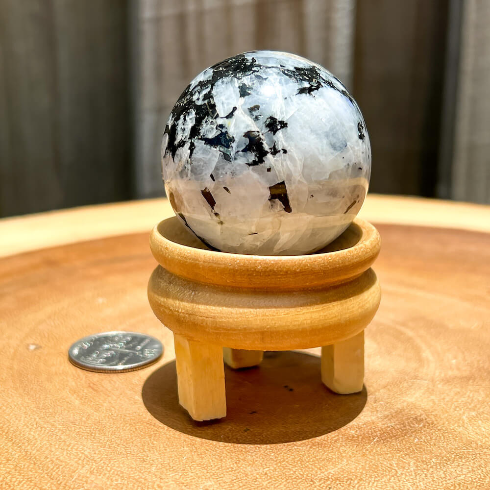 ¡Canaliza la magia de la luna llena con esta radiante esfera de piedra lunar arcoíris ! La piedra lunar arcoíris resuena con la fase de luna llena: un momento de celebración, gratitud, expansión, posibilidad y realización. Coloque esta esfera en su espacio sagrado y permita que irradie vibraciones puras y positivas en todas las direcciones.