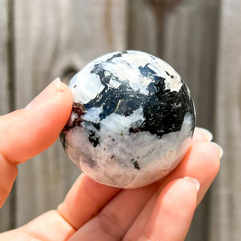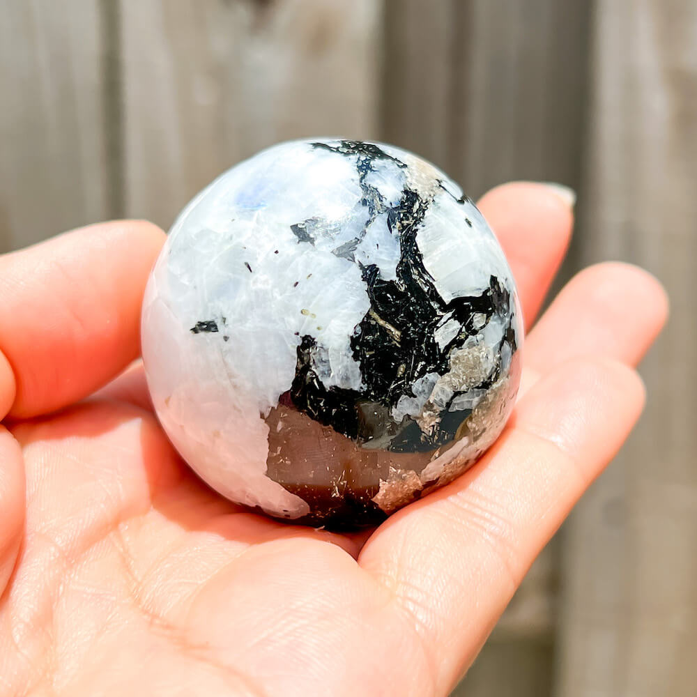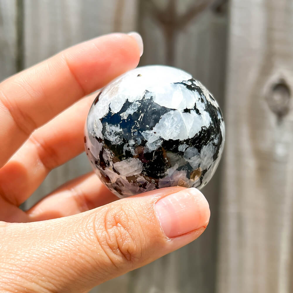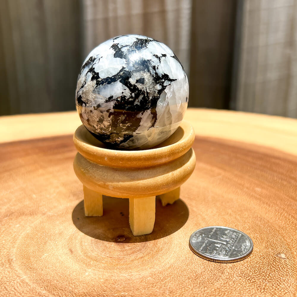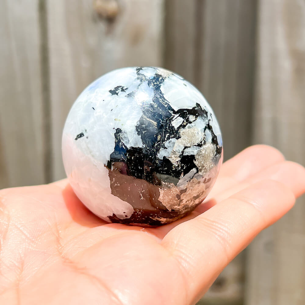 ¡Canaliza la magia de la luna llena con esta radiante esfera de piedra lunar arcoíris ! La piedra lunar arcoíris resuena con la fase de luna llena: un momento de celebración, gratitud, expansión, posibilidad y realización. Coloque esta esfera en su espacio sagrado y permita que irradie vibraciones puras y positivas en todas las direcciones.