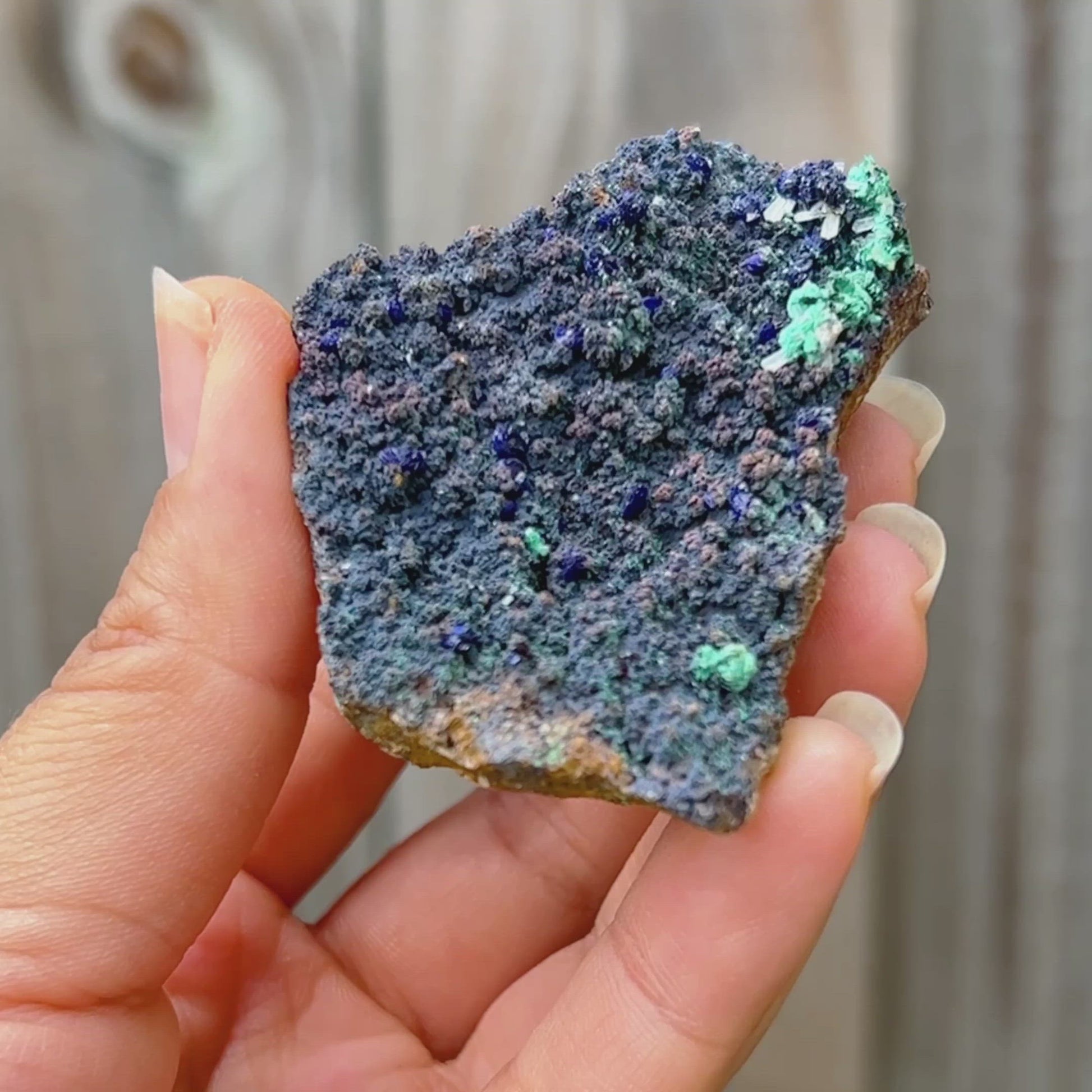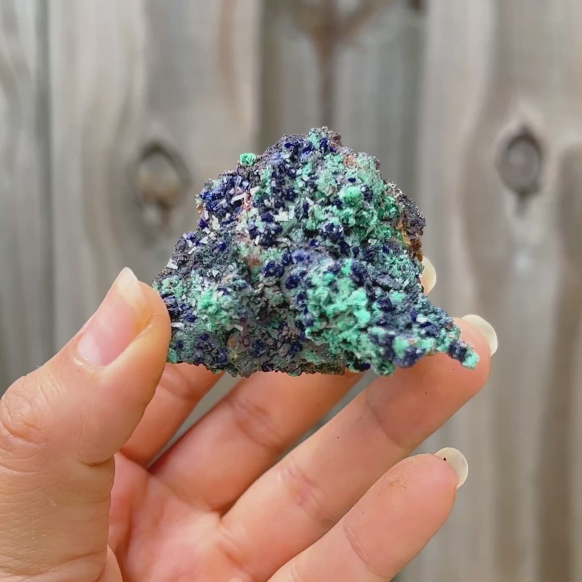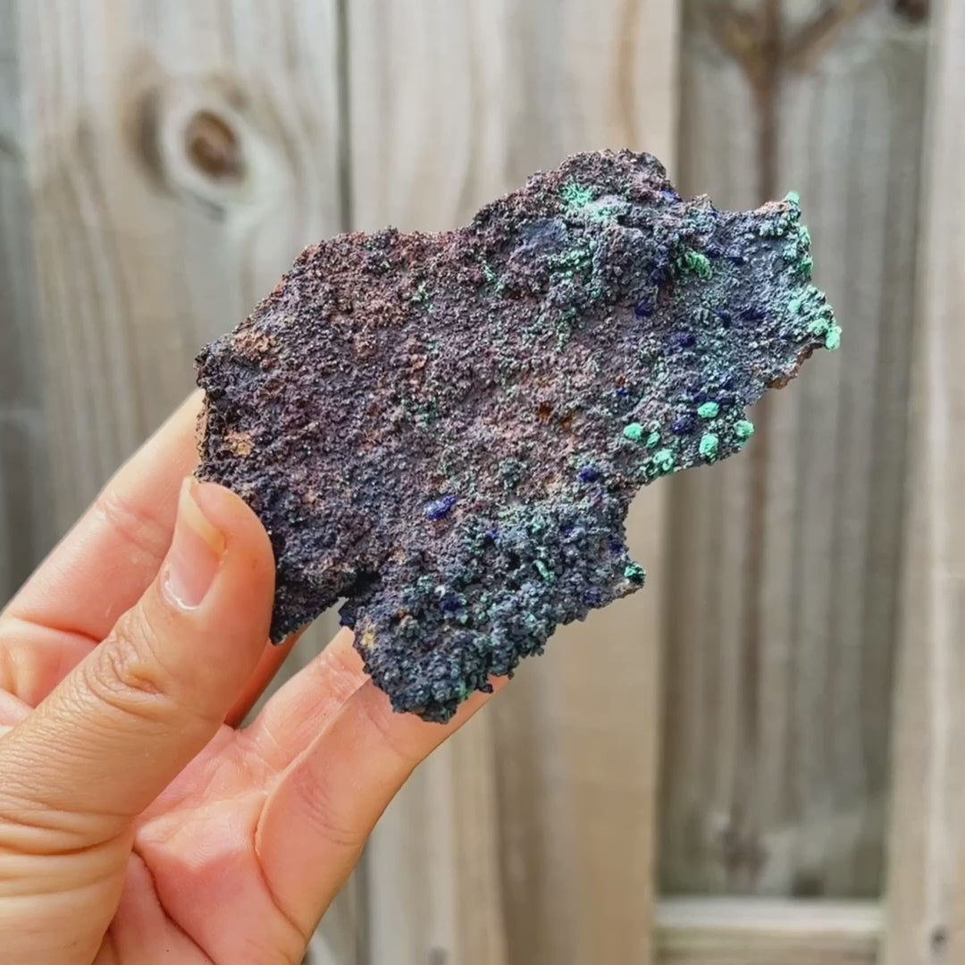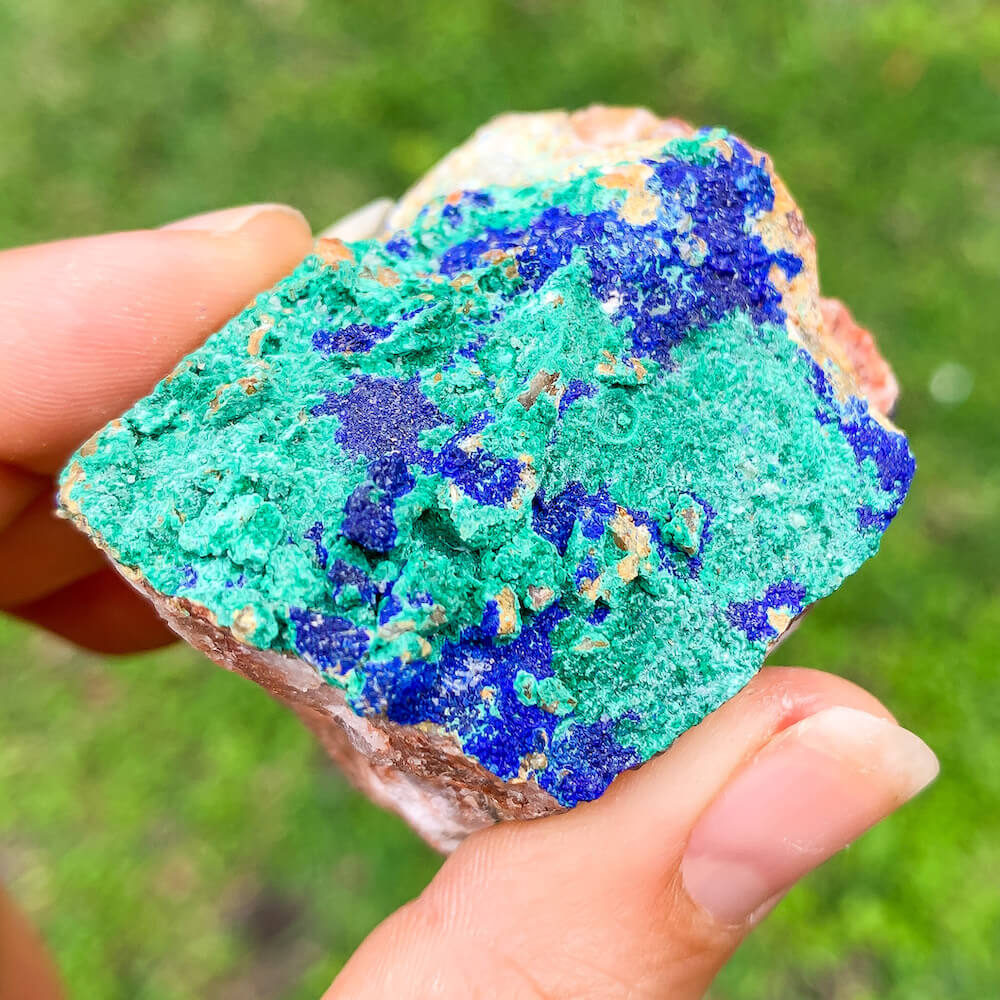Unidos como azurita-malaquita, se cree que este mineral combina diferentes rasgos, refresca la visión de la vida del usuario y disuelve las características egocéntricas; disipando la presunción, la arrogancia y la vanidad y mejorando la flexibilidad en el movimiento y el pensamiento. Expande la conciencia, crea un equilibrio emocional y activa un escudo protector contra las fuerzas negativas u hostiles.
