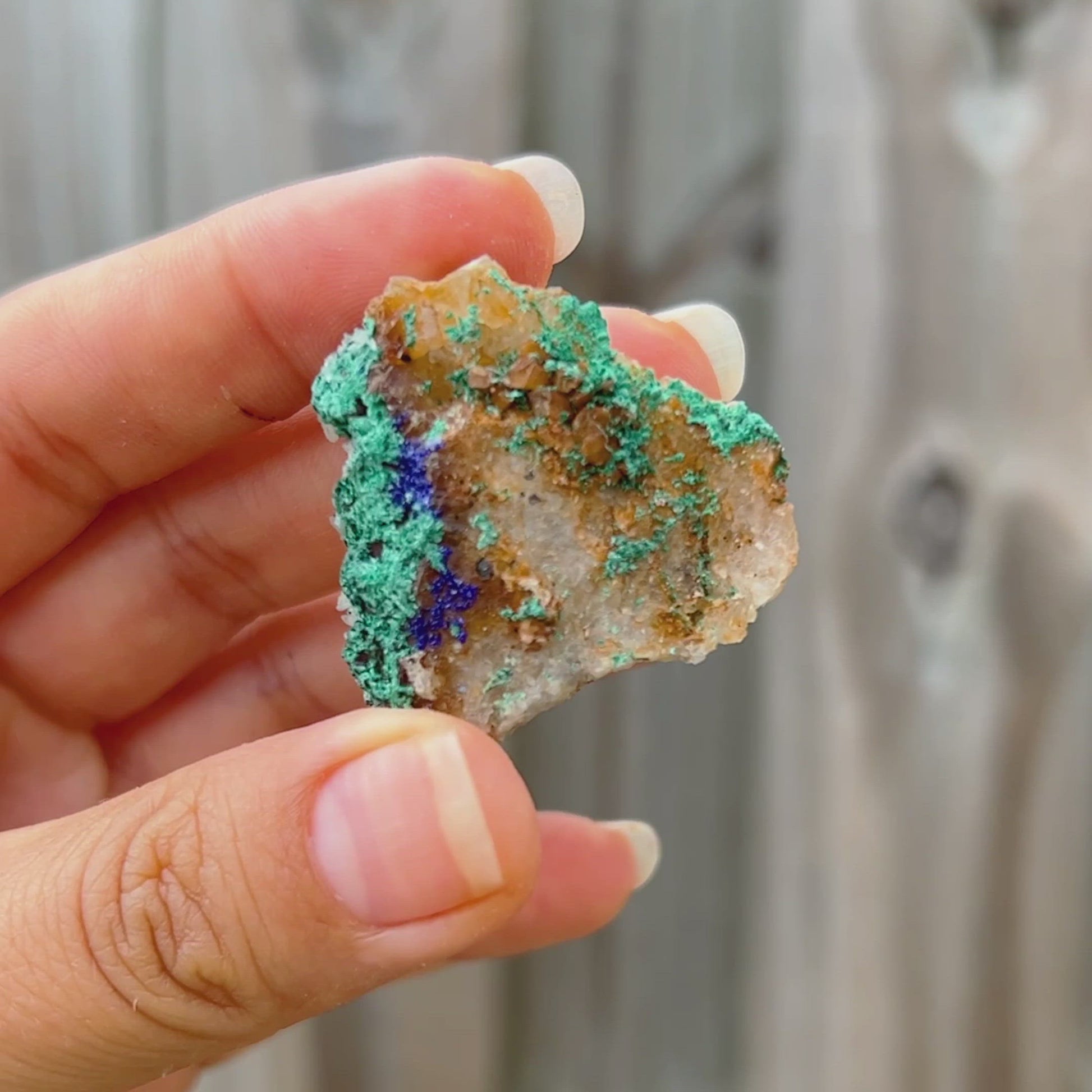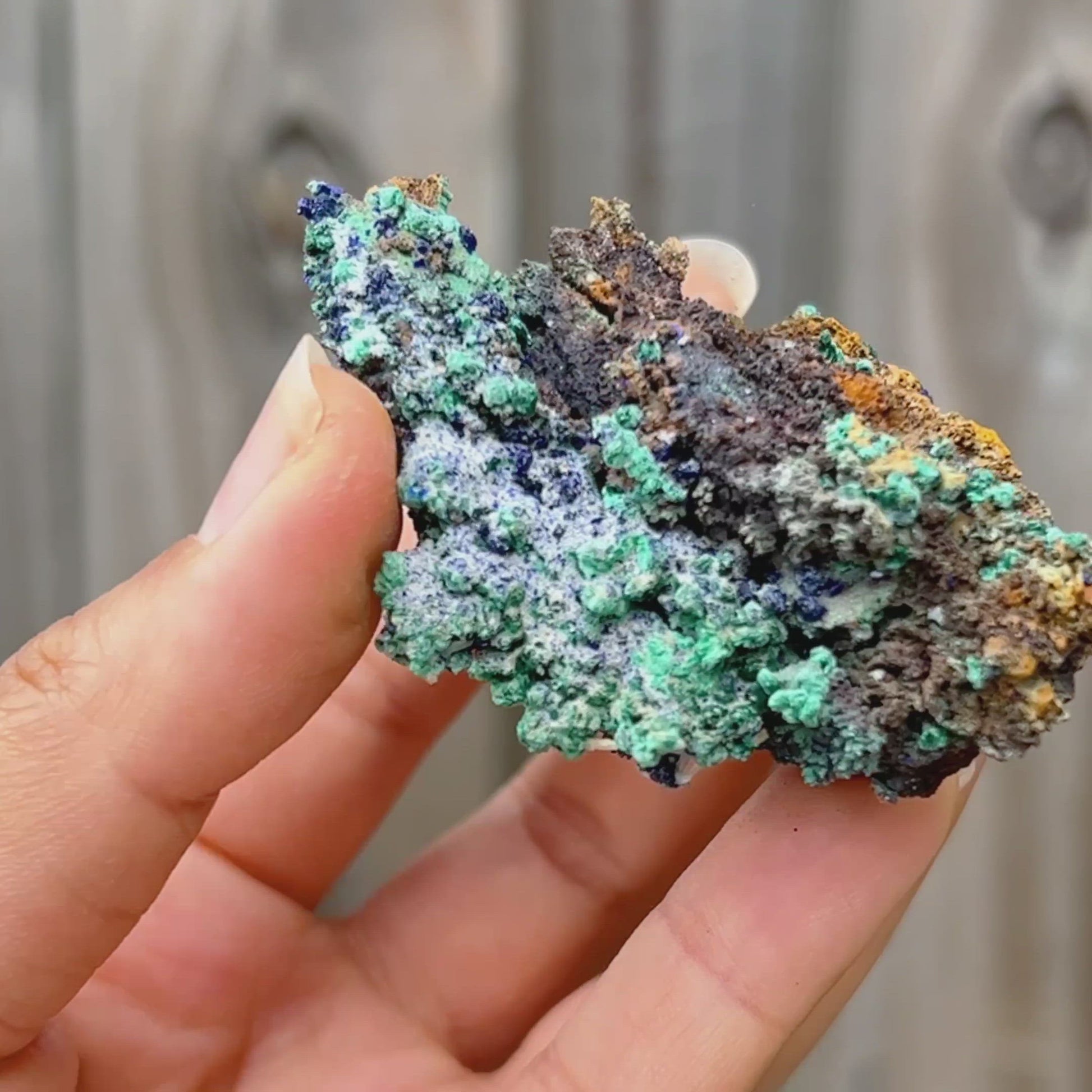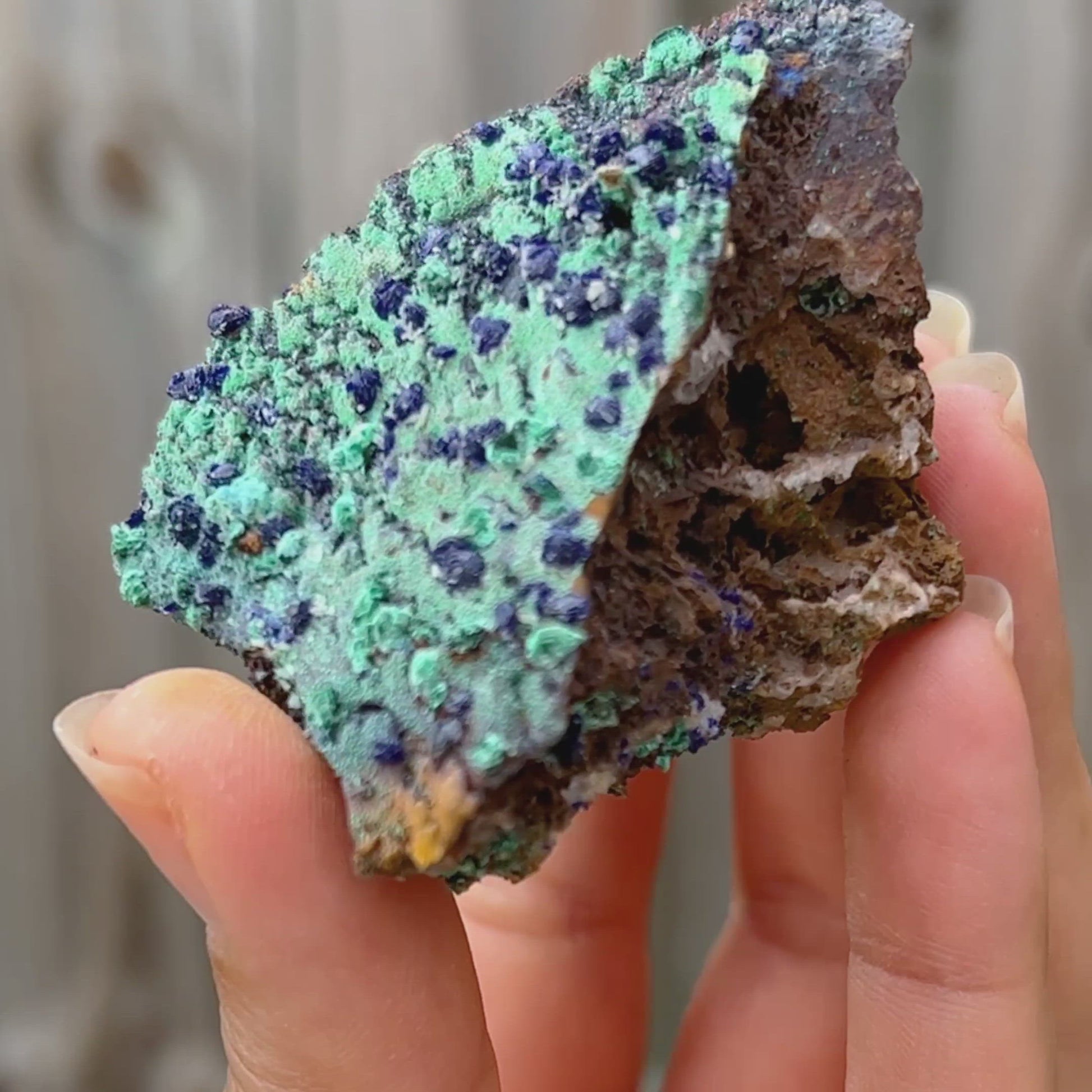 Unidos como azurita-malaquita, se cree que este mineral combina diferentes rasgos, refresca la visión de la vida del usuario y disuelve las características egocéntricas; disipando la presunción, la arrogancia y la vanidad y mejorando la flexibilidad en el movimiento y el pensamiento. Expande la conciencia, crea un equilibrio emocional y activa un escudo protector contra las fuerzas negativas u hostiles.