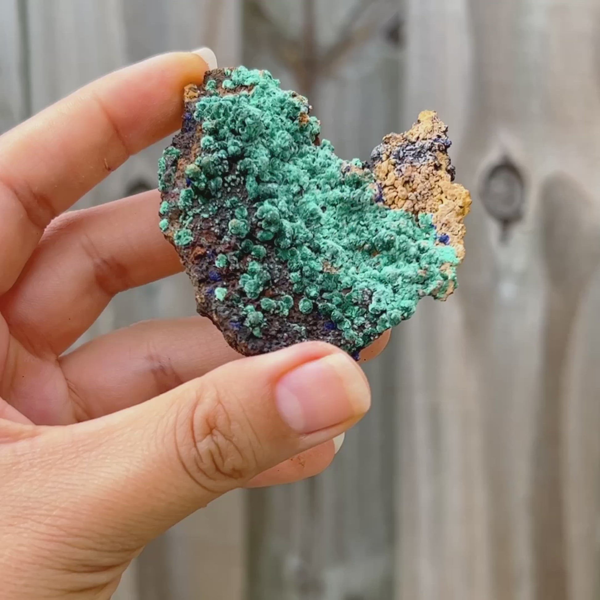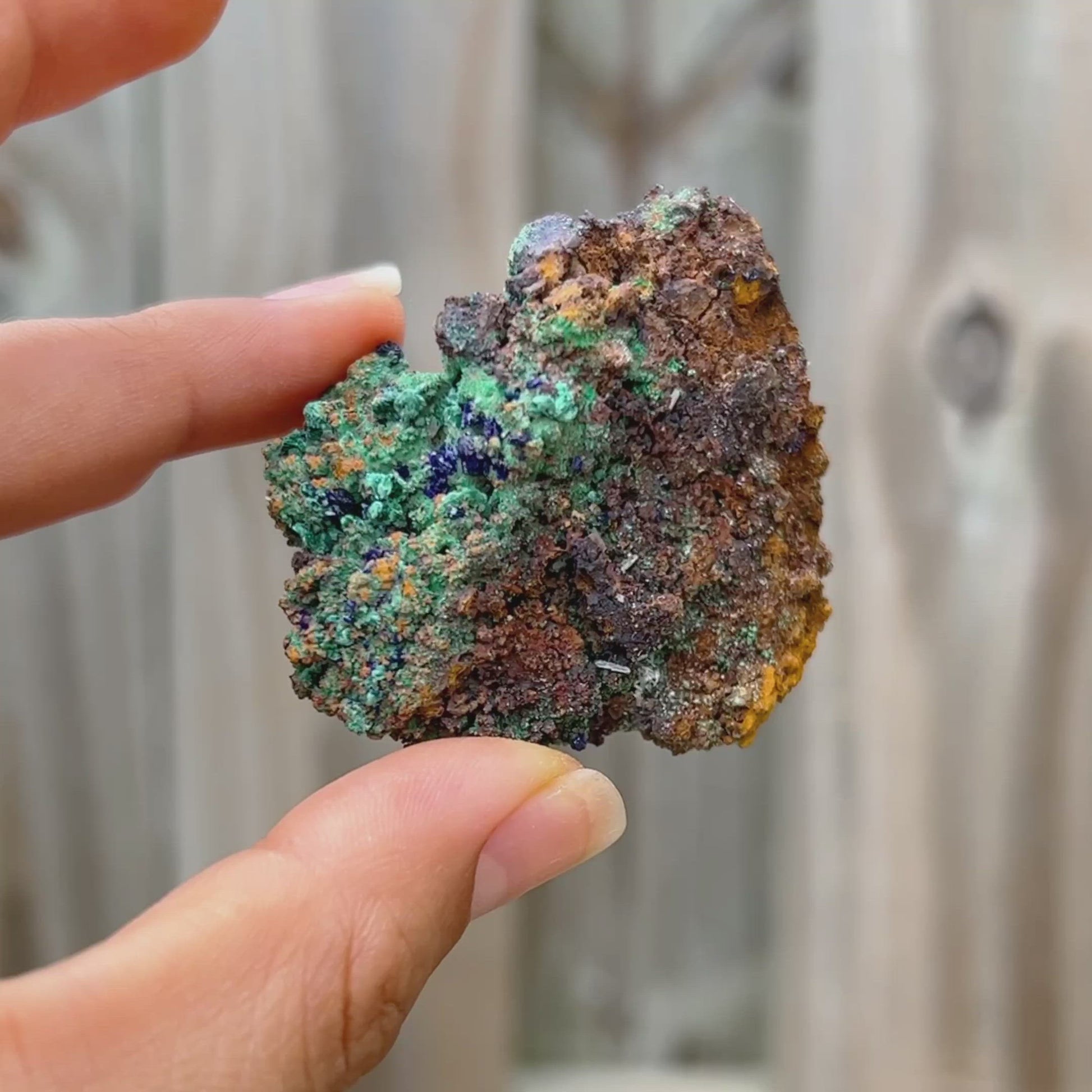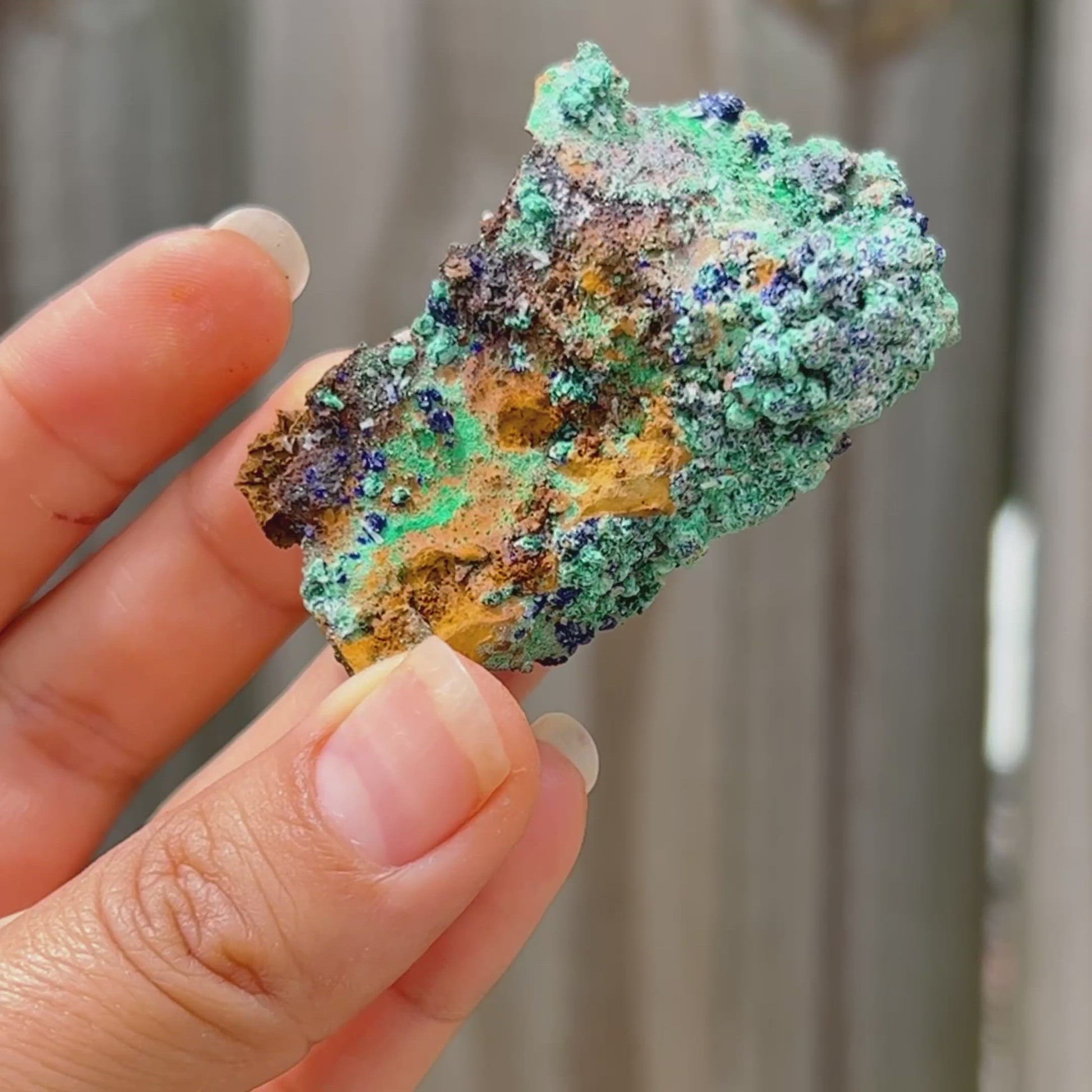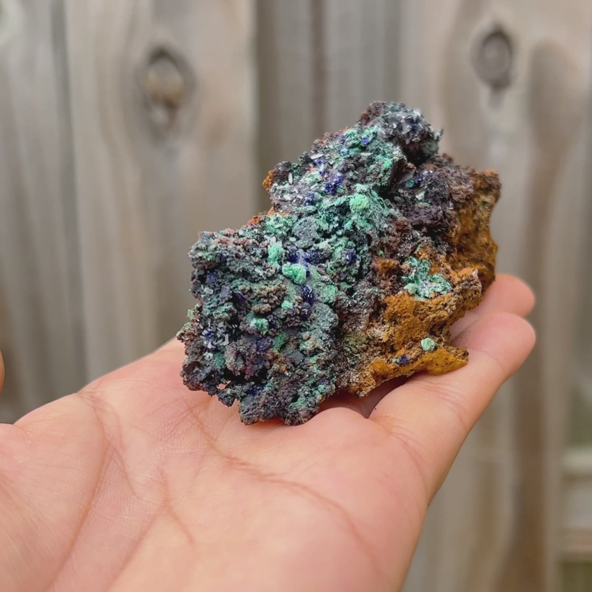 Unidos como azurita-malaquita, se cree que este mineral combina diferentes rasgos, refresca la visión de la vida del usuario y disuelve las características egocéntricas; disipando la presunción, la arrogancia y la vanidad y mejorando la flexibilidad en el movimiento y el pensamiento. Expande la conciencia, crea un equilibrio emocional y activa un escudo protector contra las fuerzas negativas u hostiles.