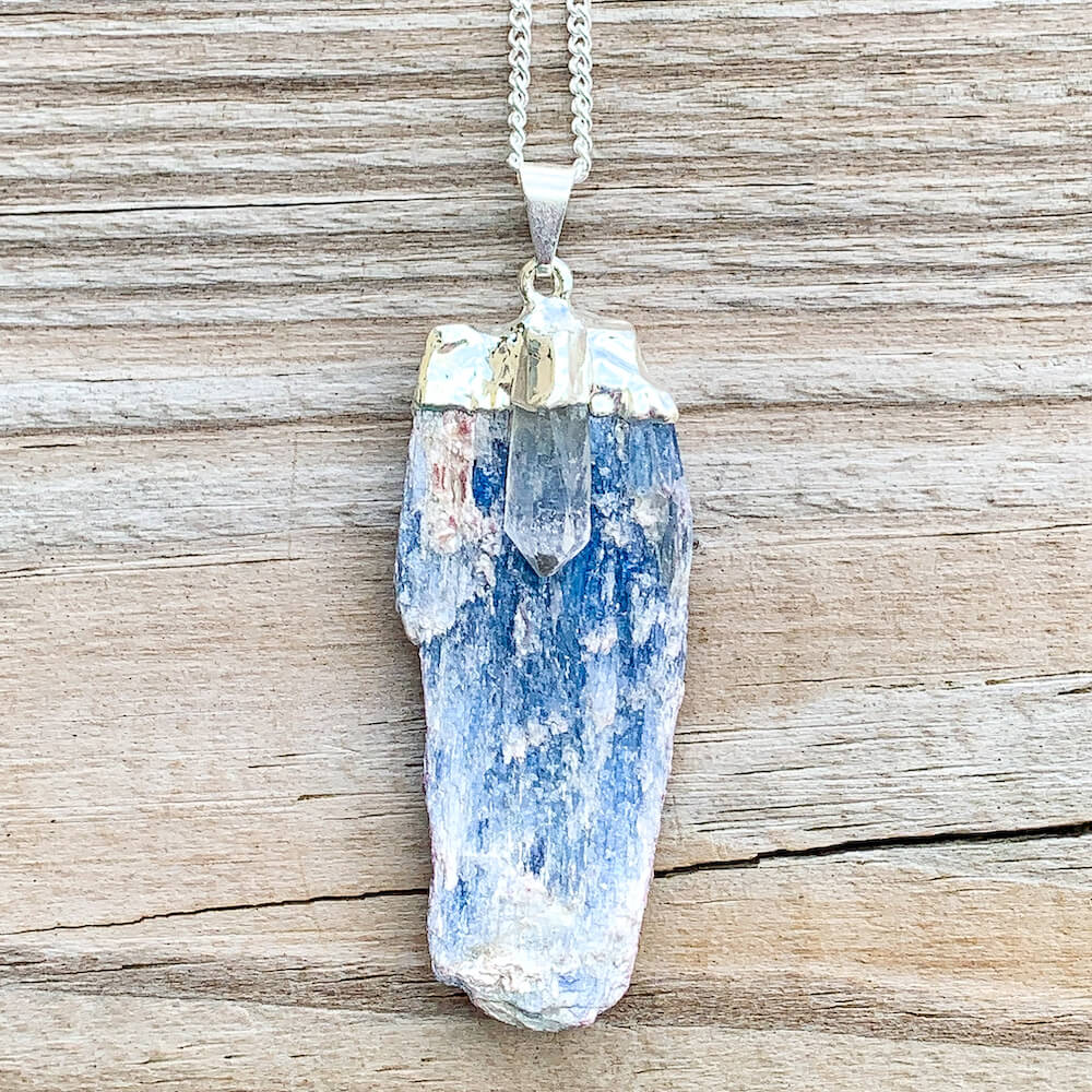 Collar con colgante de cianita azul crudo con cuarzo transparente