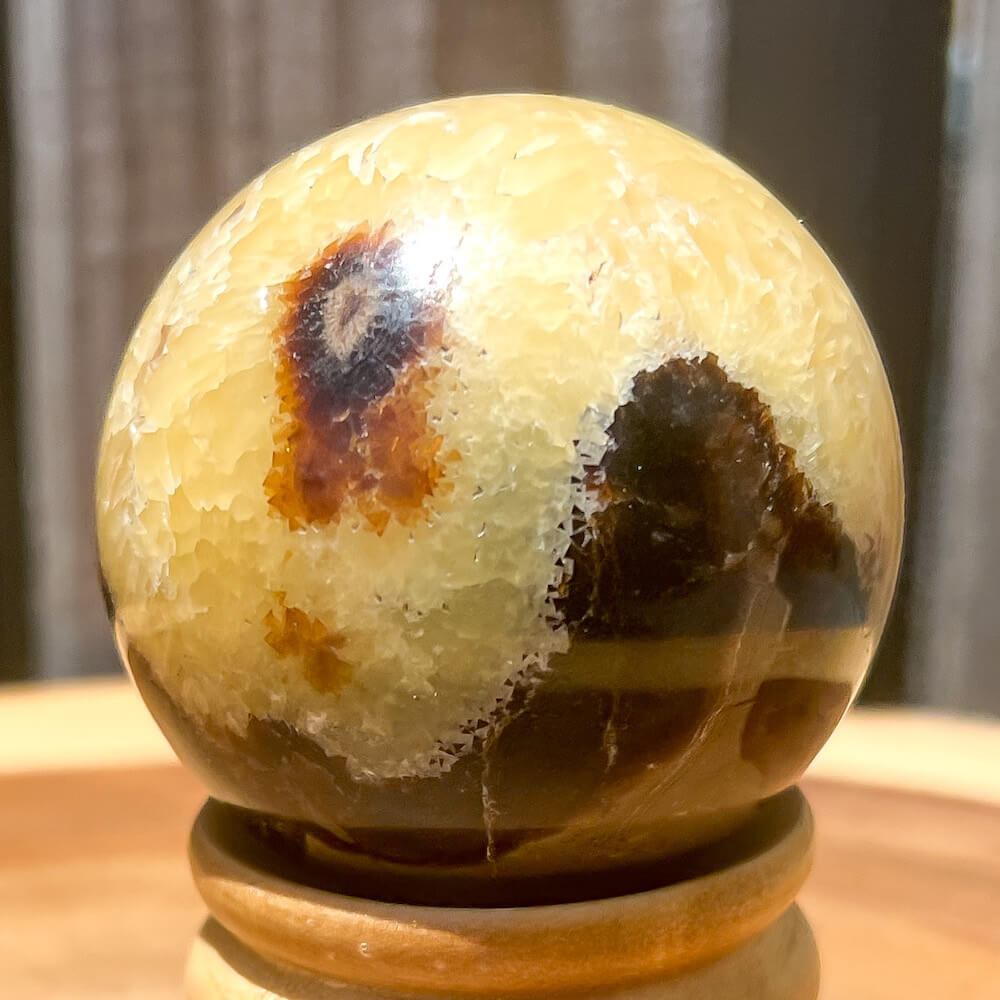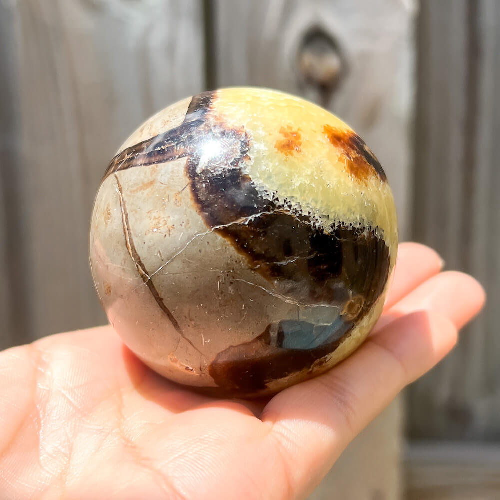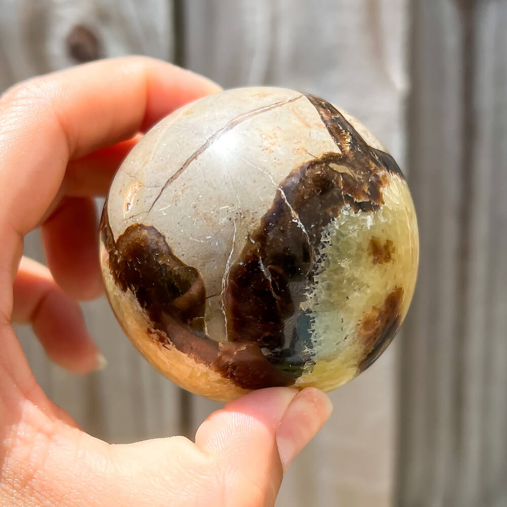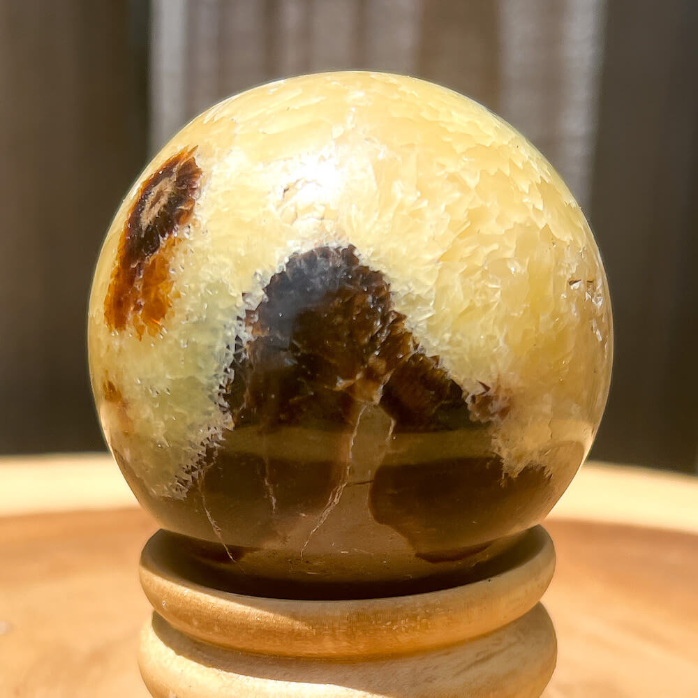 Septarian también se conoce como Septaria, Septeyre y Dragon Stone. Dentro del septario, hay muchos minerales mezclados. Las partes amarillas que ves son la calcita y las líneas marrones son aragonito. Las líneas blancas son baritina y las grises son calcedonia o piedra caliza.