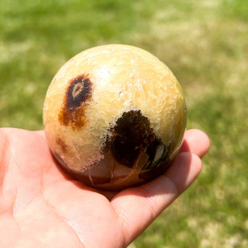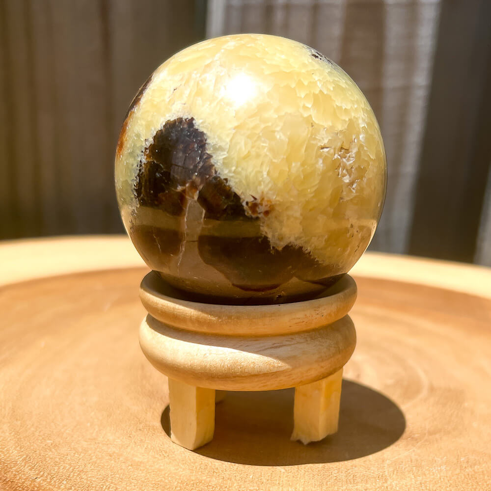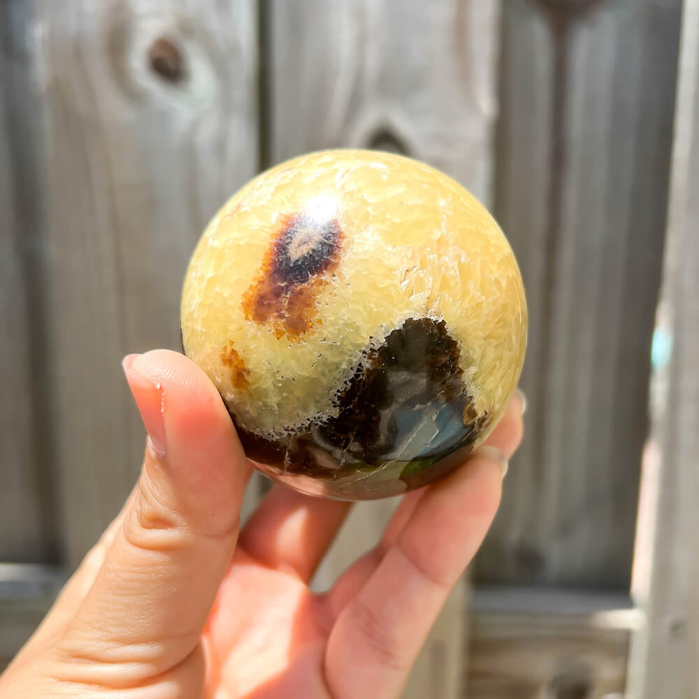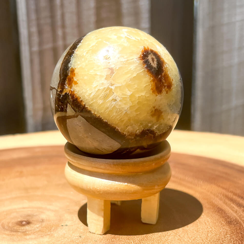 Septarian también se conoce como Septaria, Septeyre y Dragon Stone. Dentro del septario, hay muchos minerales mezclados. Las partes amarillas que ves son la calcita y las líneas marrones son aragonito. Las líneas blancas son baritina y las grises son calcedonia o piedra caliza.
