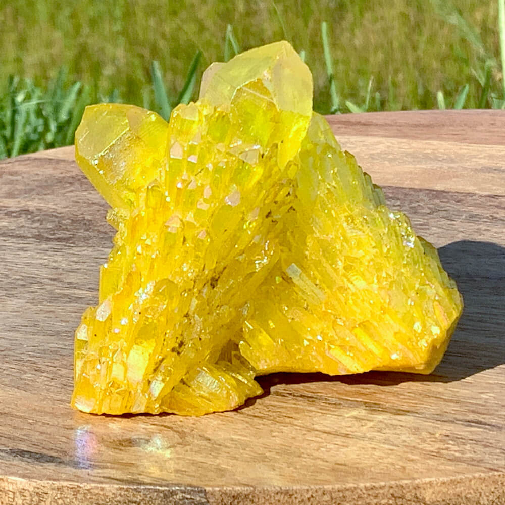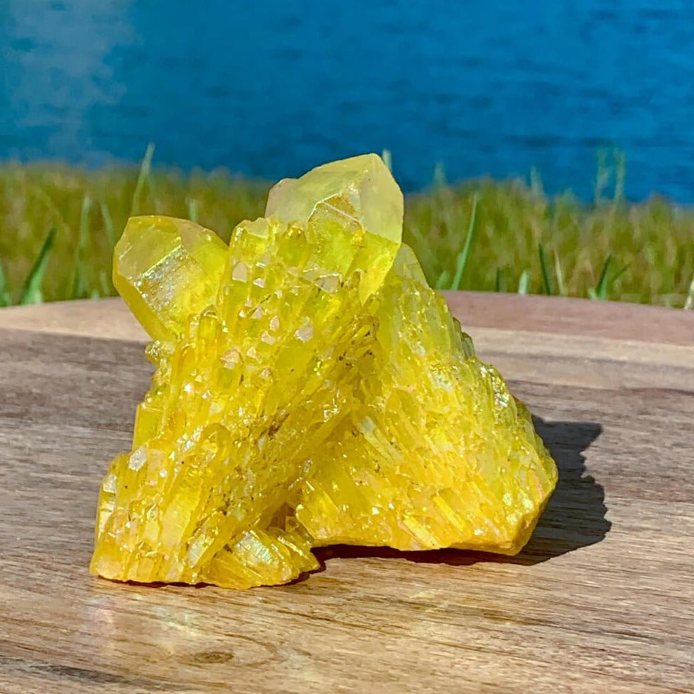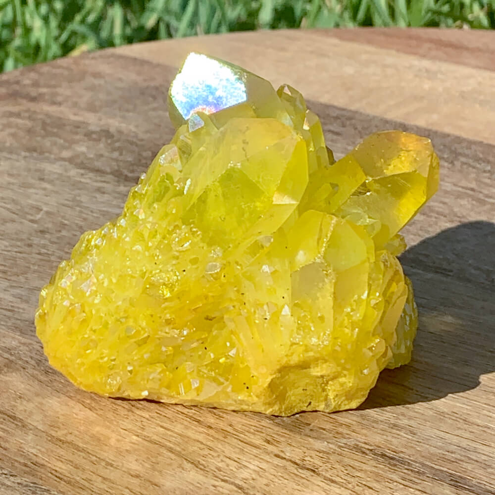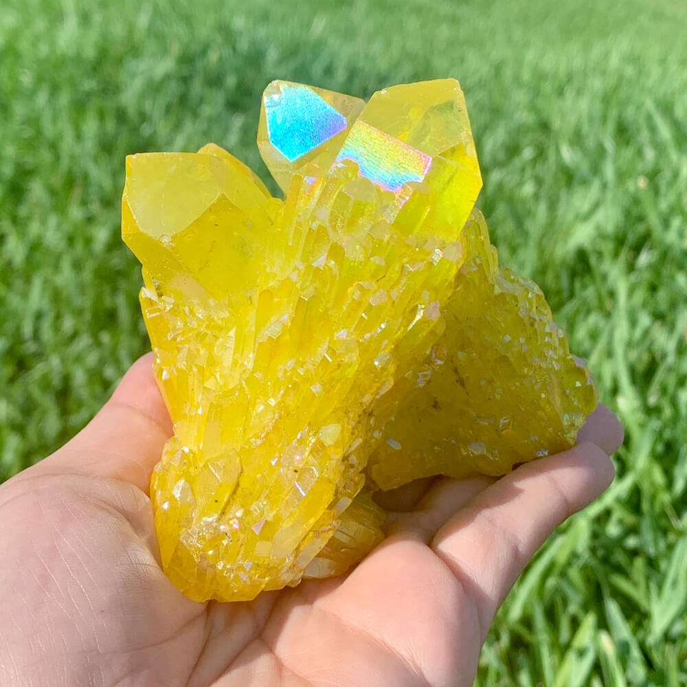 Cuarzo de aura de llama amarilla, también conocido como Sunshine Aura Quartz es un cuarzo transparente natural unido con oro y platino. Utilice estos cristales durante la mediación para ayudar a filtrar las distracciones. Aura Quartz ofrece un profundo consuelo espiritual, disolviendo bloqueos emocionales y reemplazándolos con amor incondicional y la sensación de ser parte de un grupo de almas superior. Se cree que estos cristales aportan alegría y vitalidad a la fuerza vital.