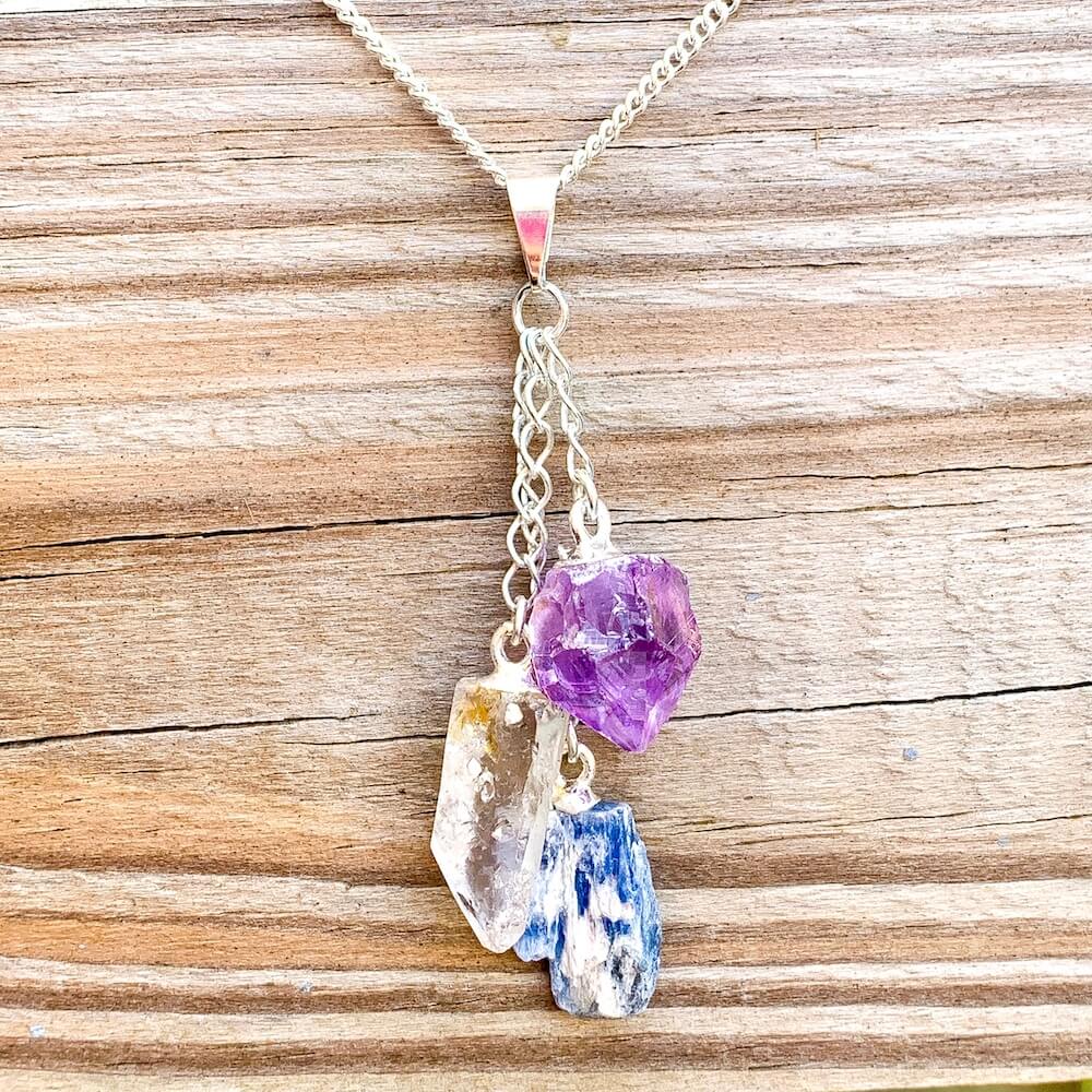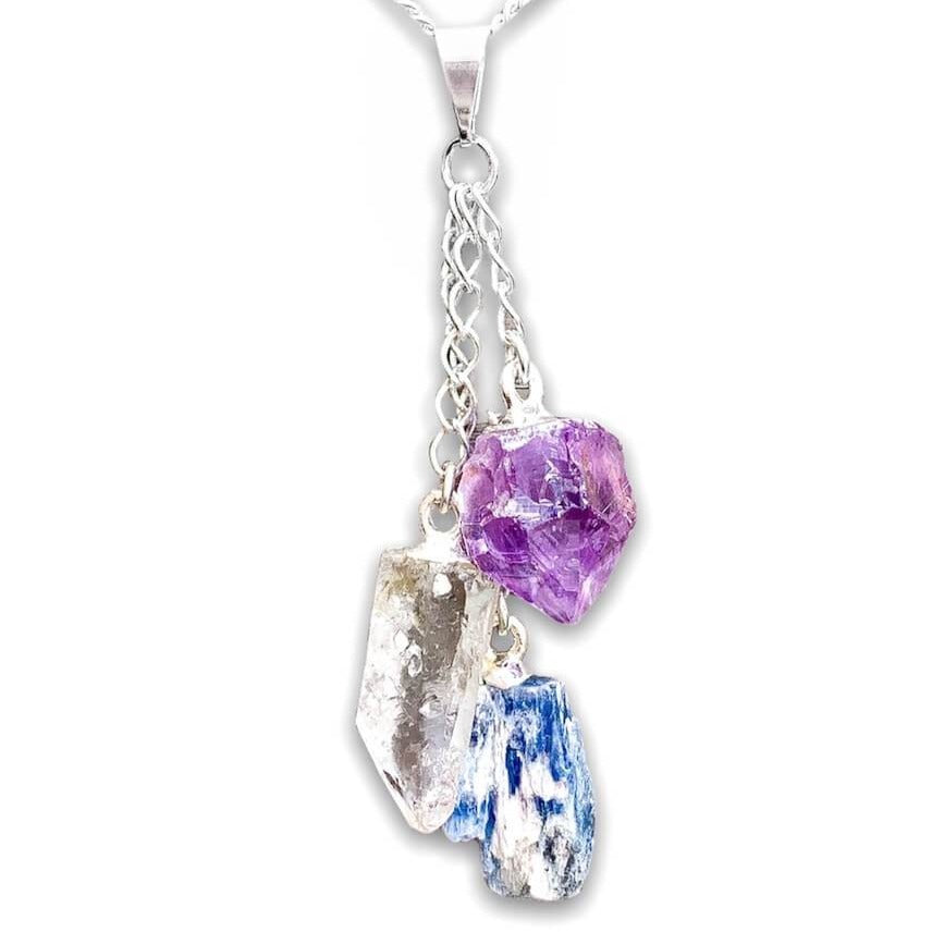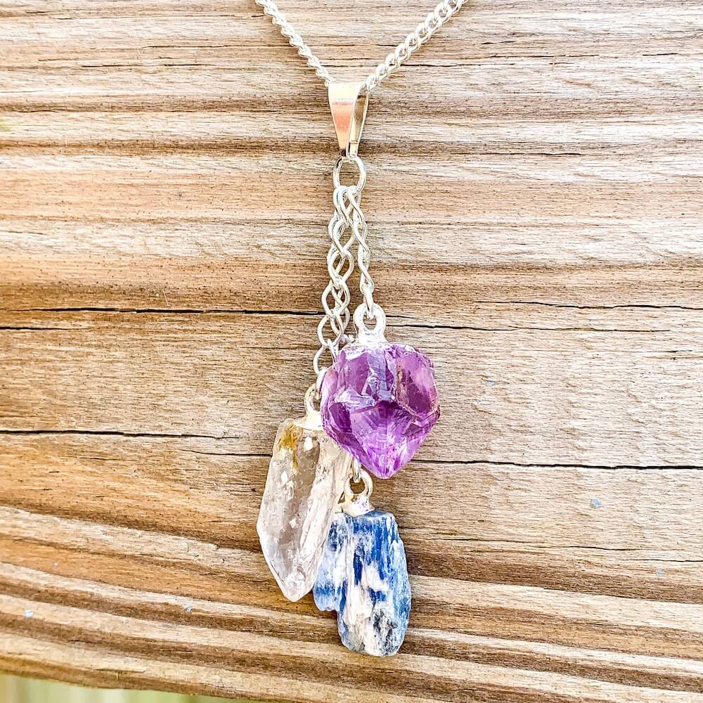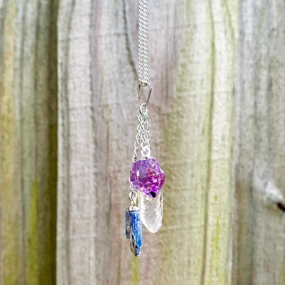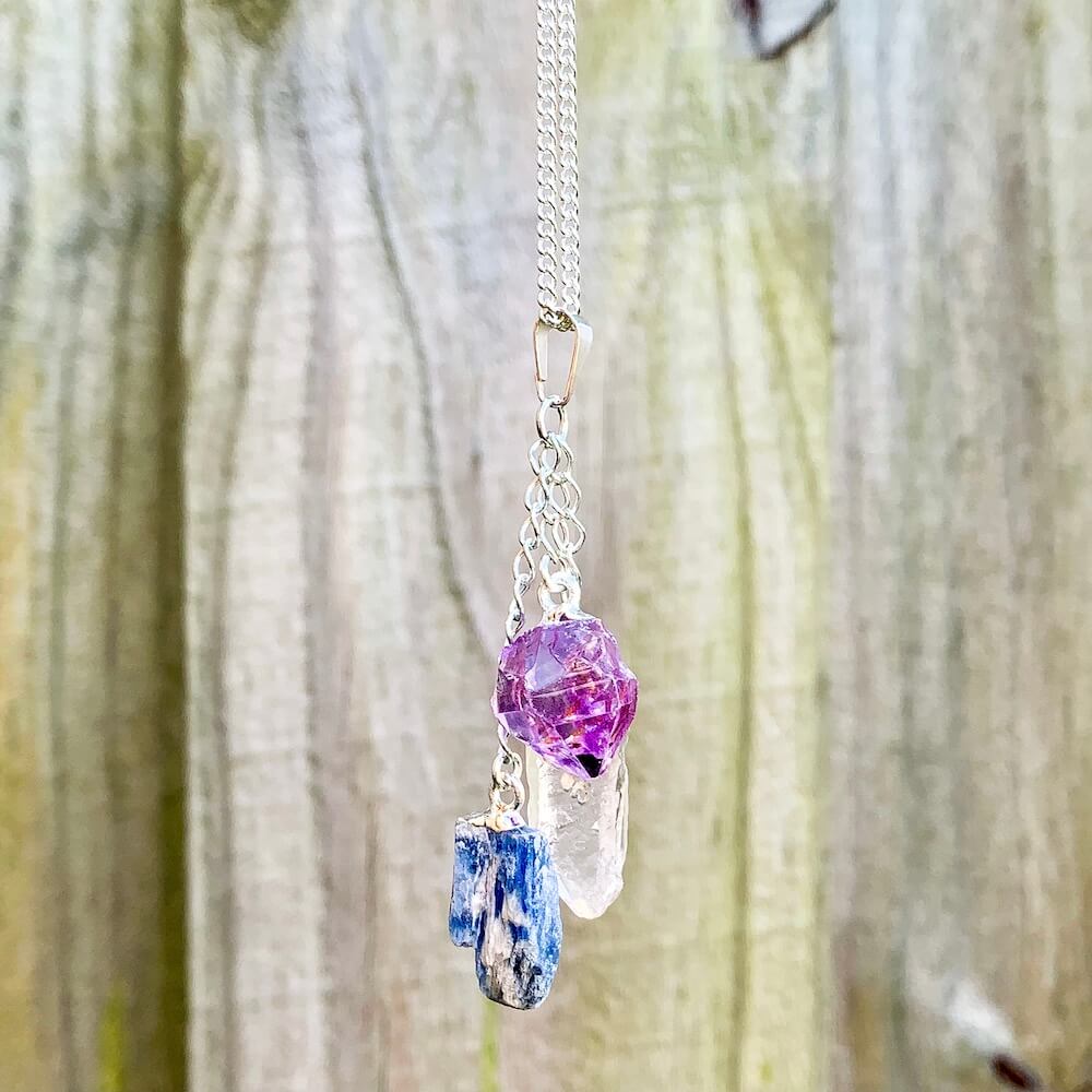 Amethyst, Blue Kyanite and Quartz Triple Stone Pendant Necklace