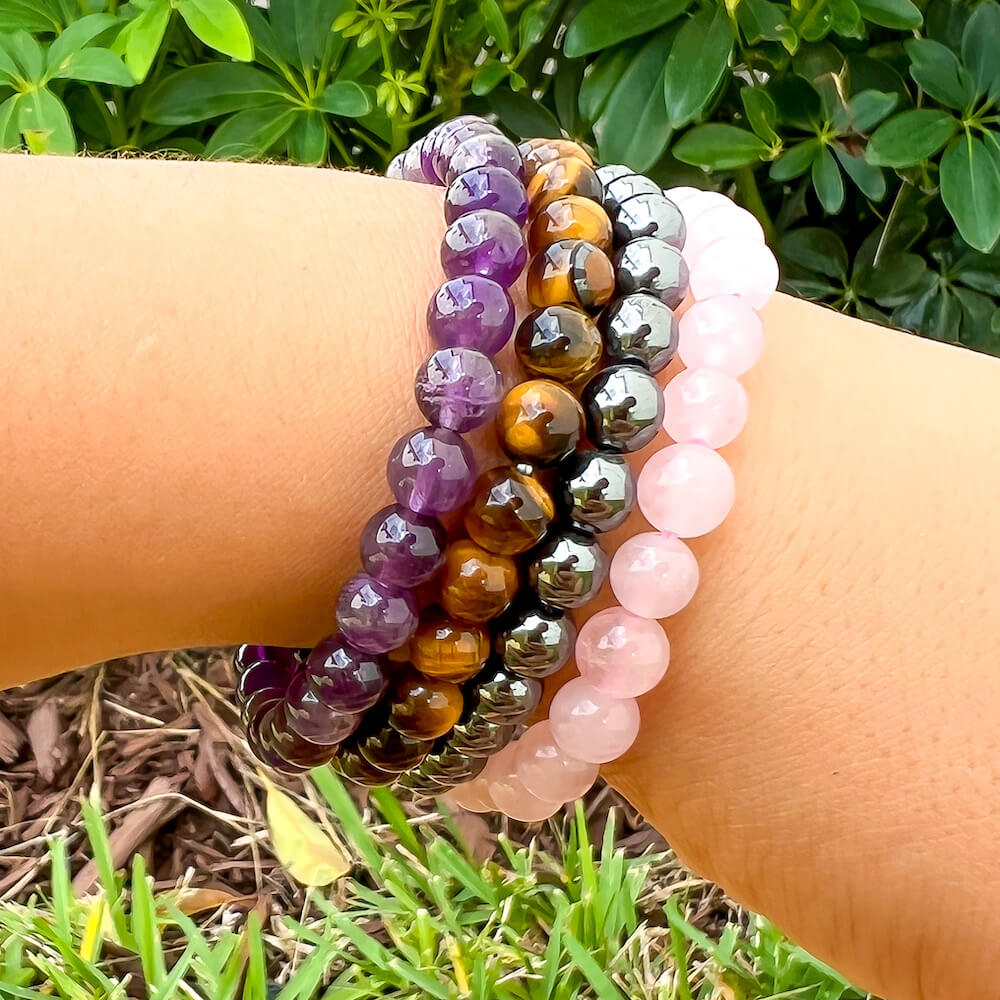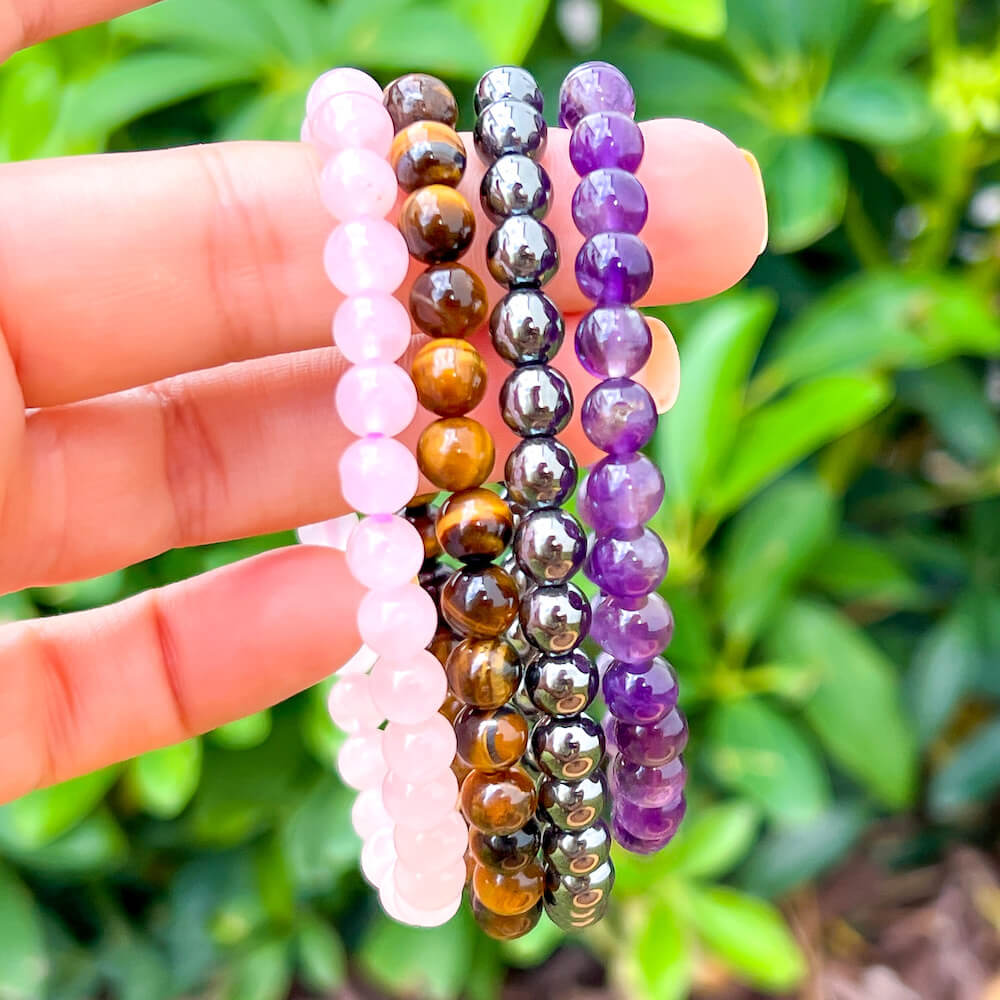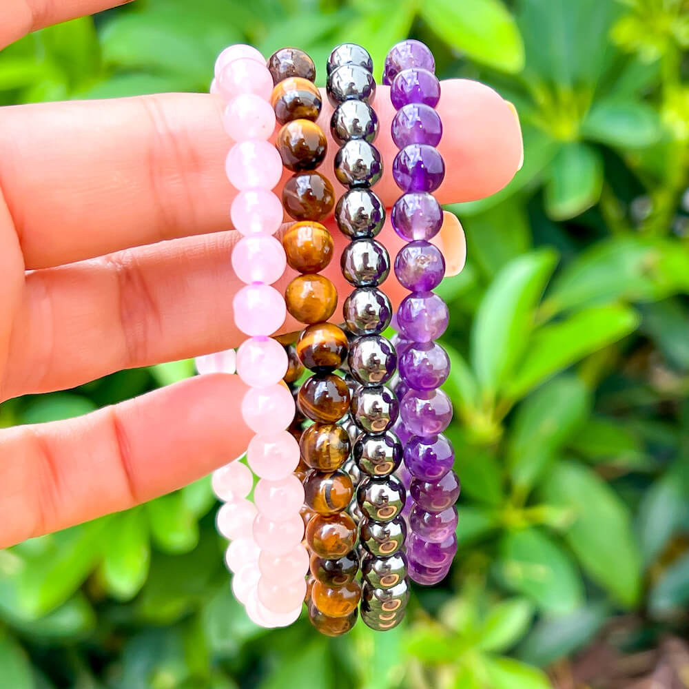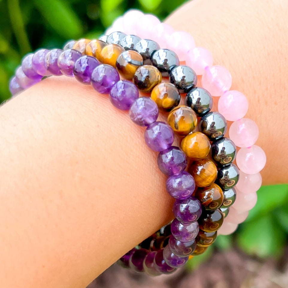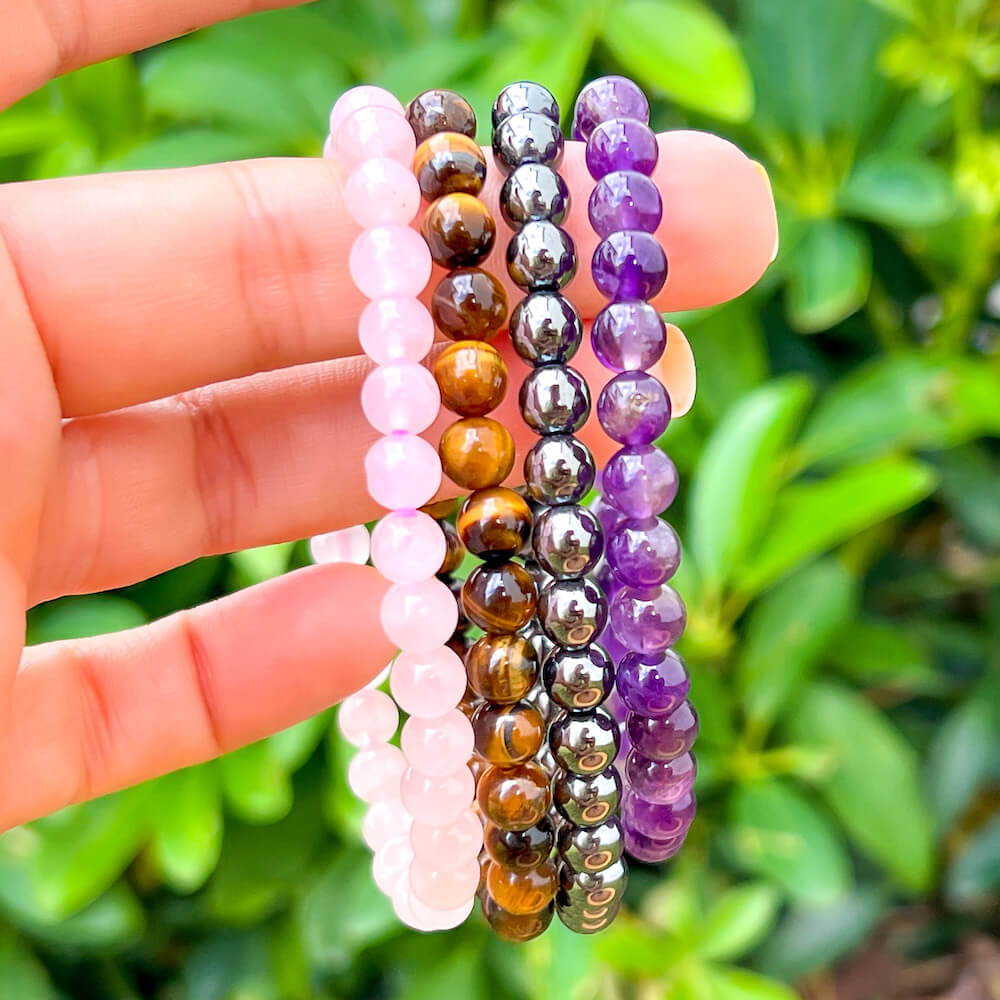 • 4 Bracelets: Amethyst, Tiger Eye, Hematite, Rose Quartz