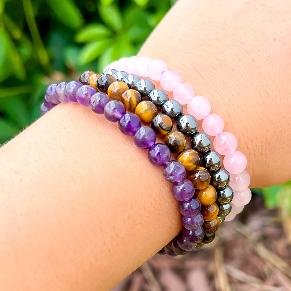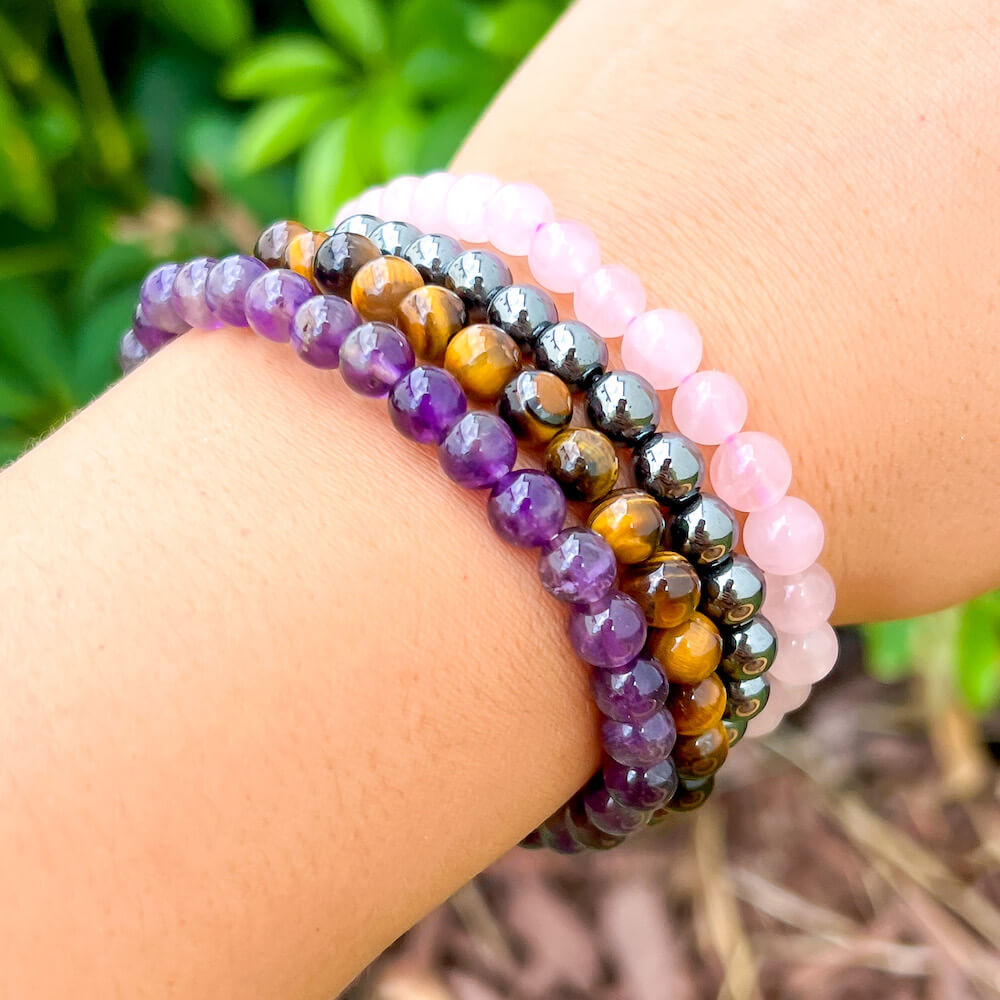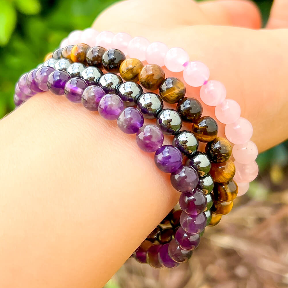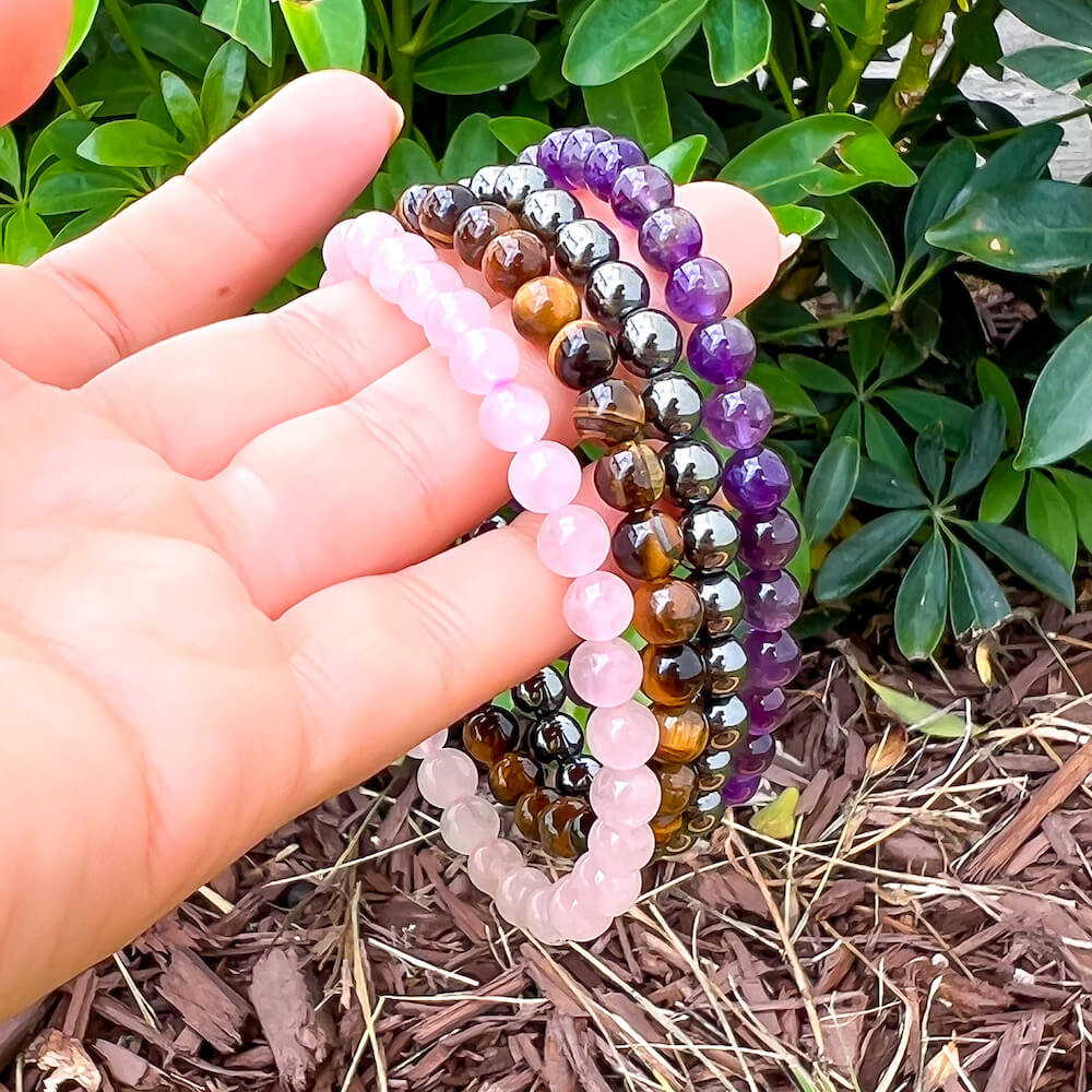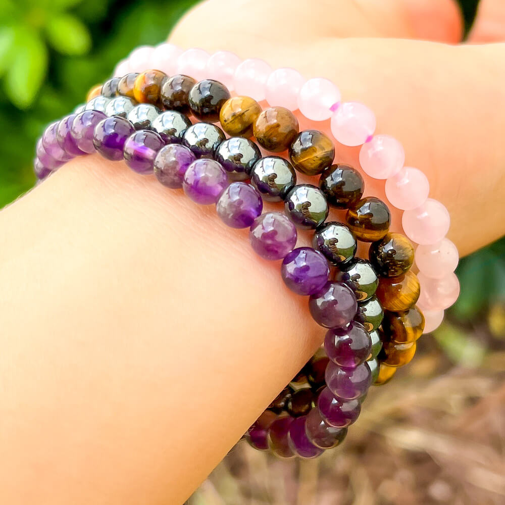 • 4 Bracelets: Amethyst, Tiger Eye, Hematite, Rose Quartz