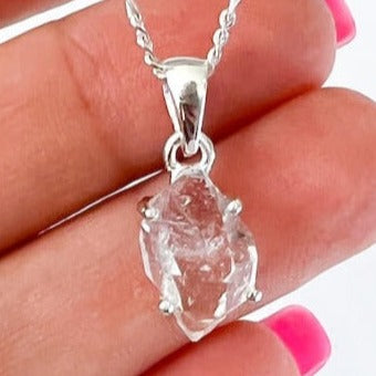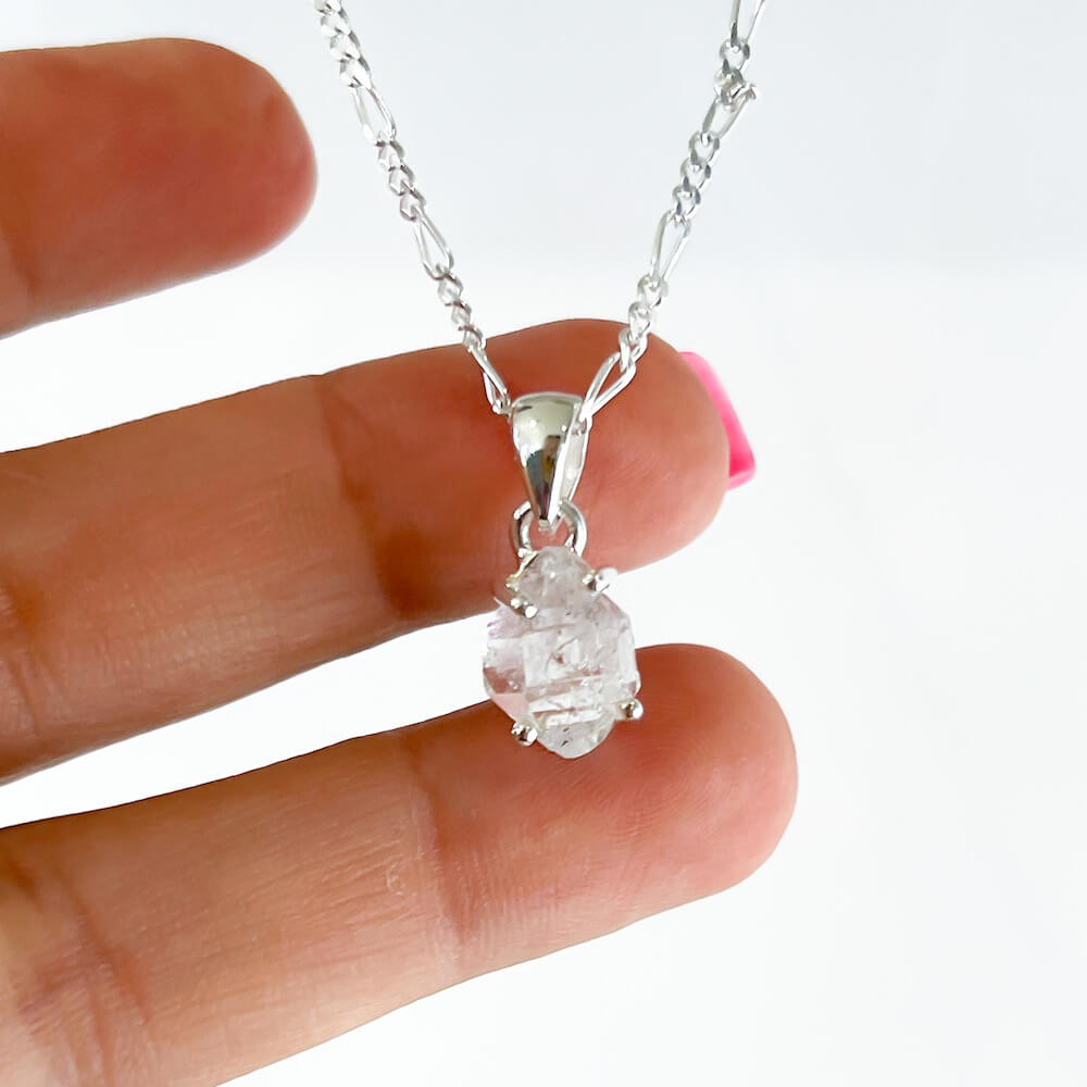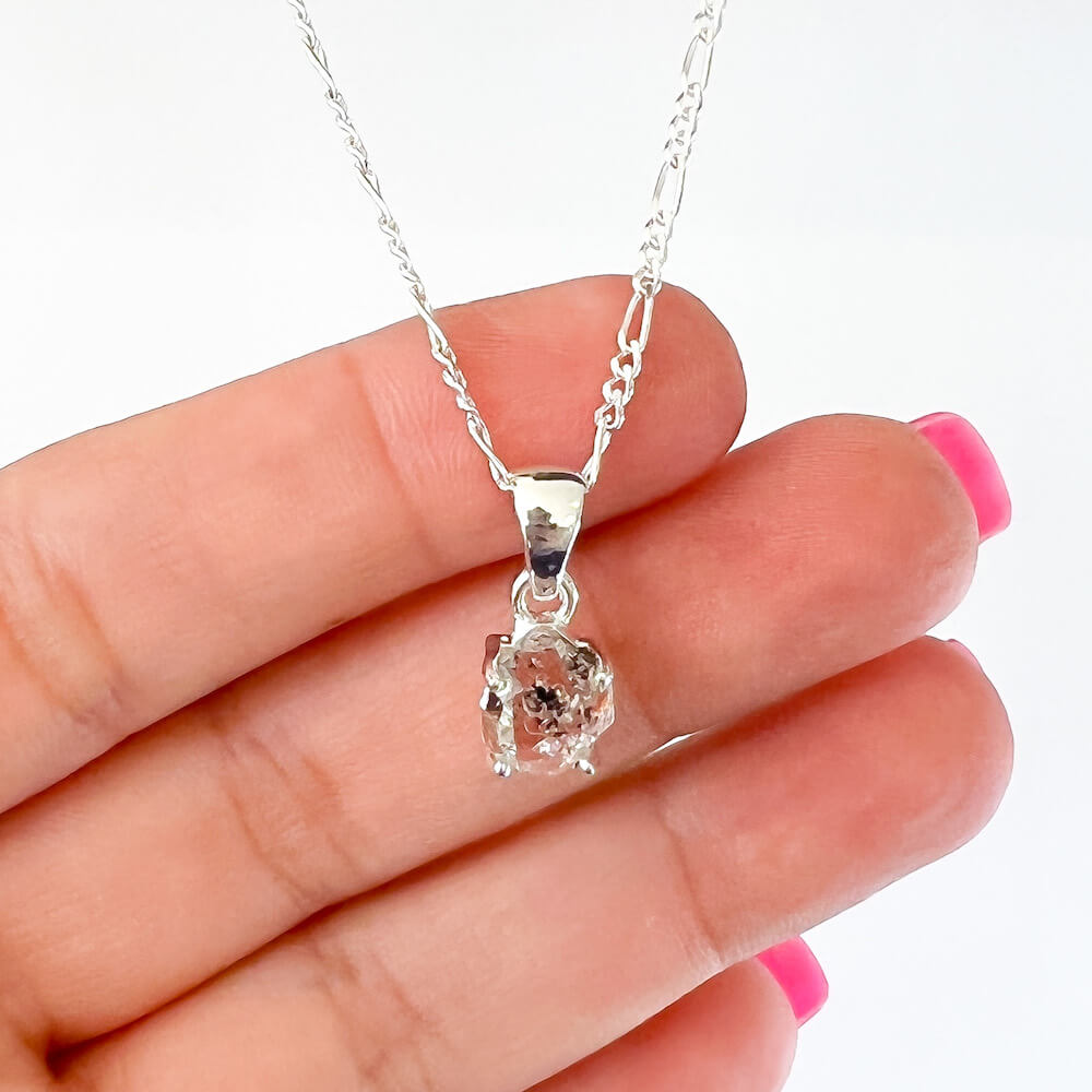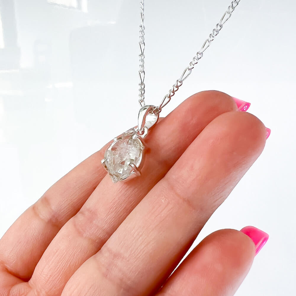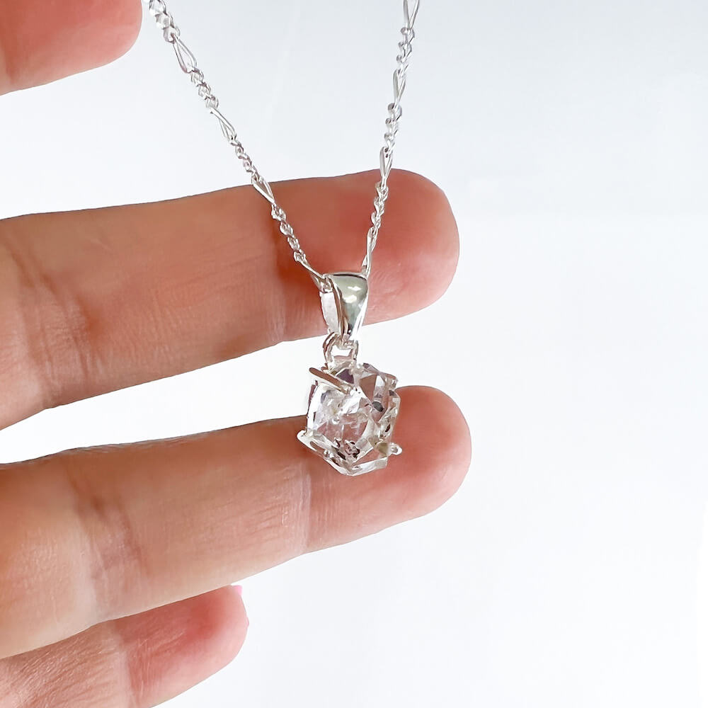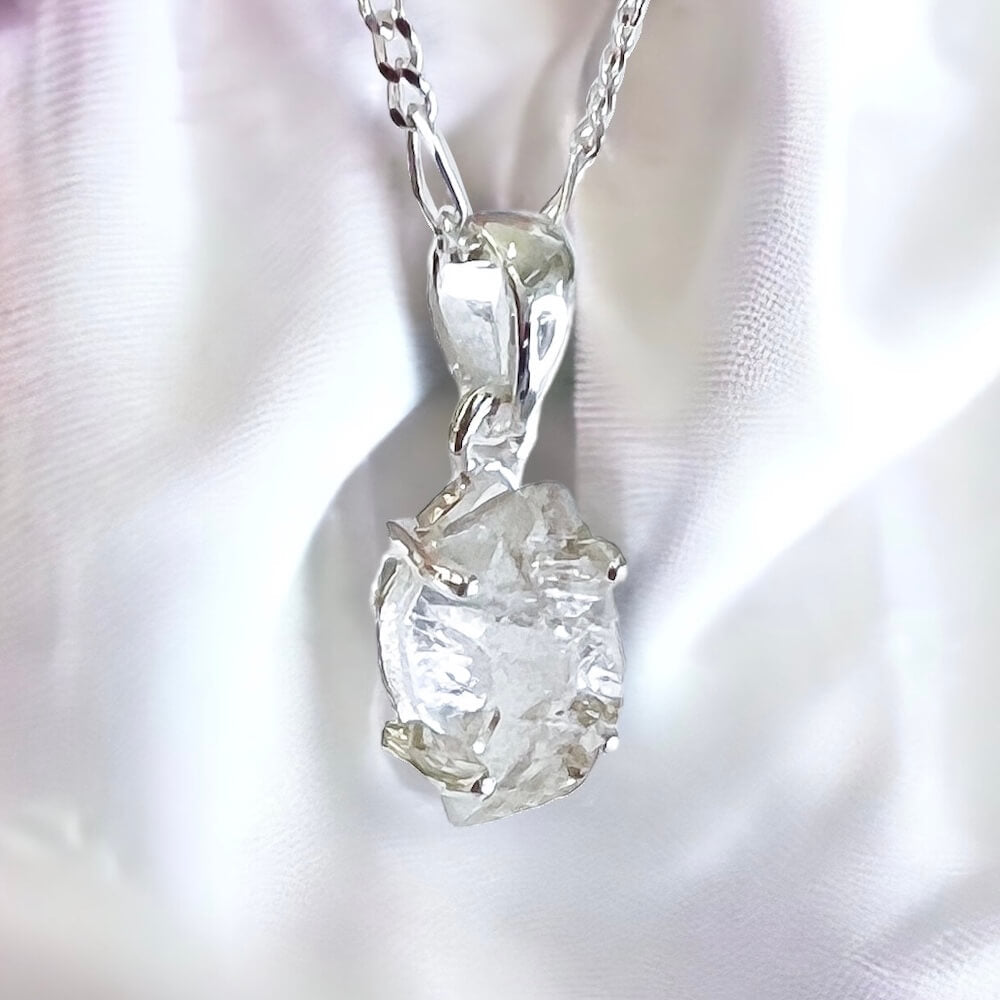 These Herkimer Diamond crystal pendant necklaces are of high, translucent quality and are double terminated. This listing is for ONE (1) intuitively chosen pendant. Each crystal is individual and some have natural inclusions like rainbows, cloudy areas naturally etched divots, and stepped imprints from other crystals. Know that each Herkimer Diamond pendant was hand-selected to guarantee quality and beauty.
