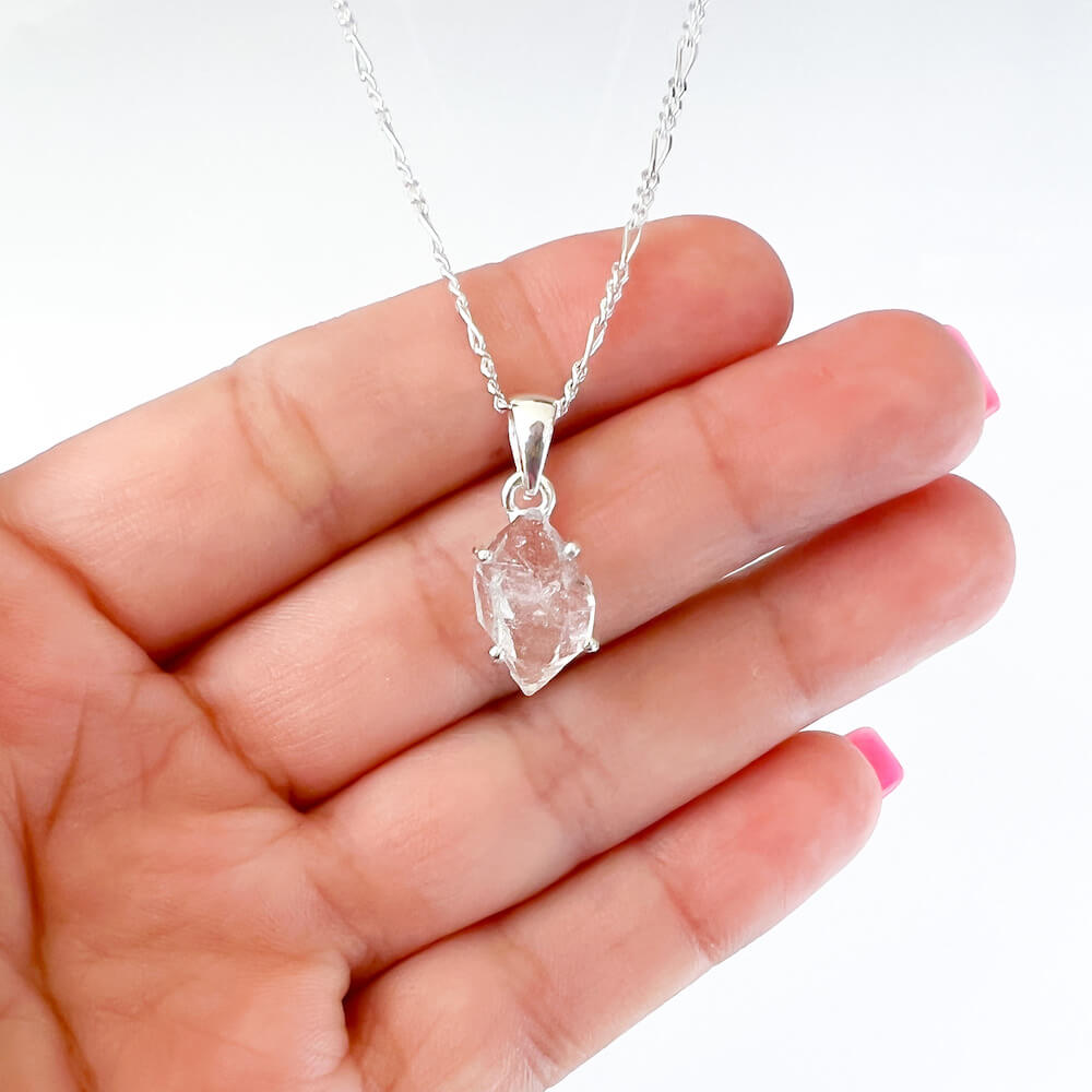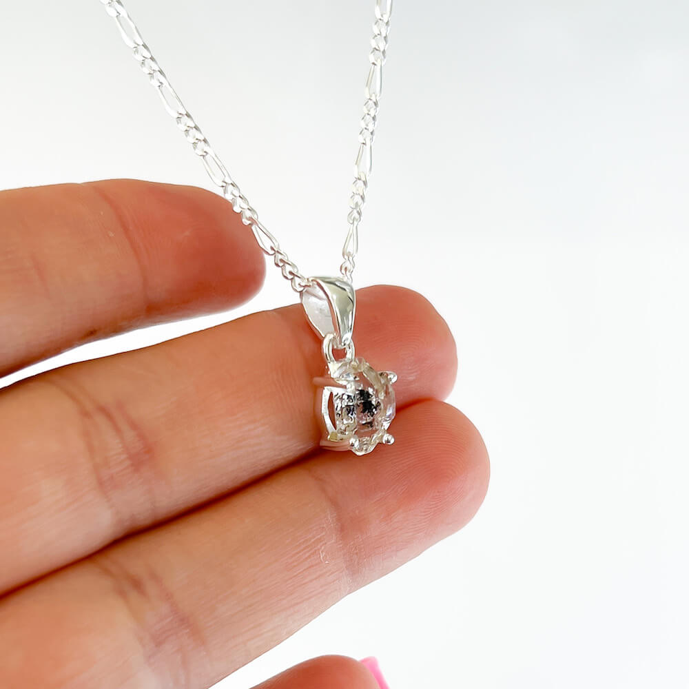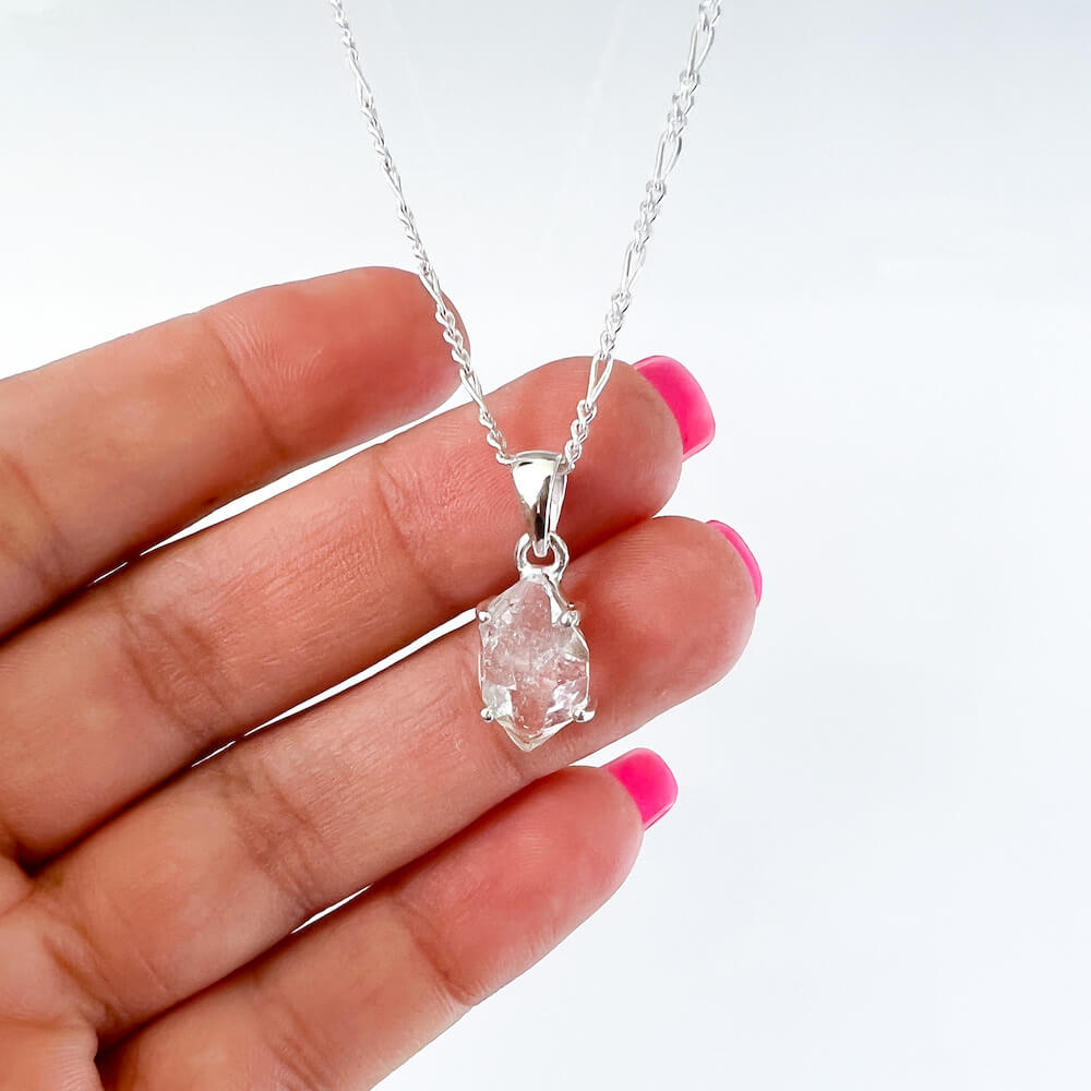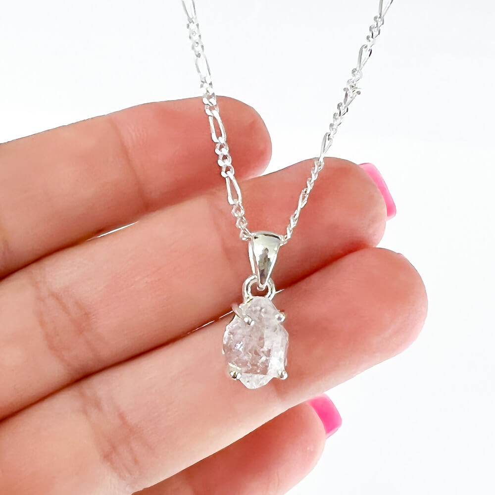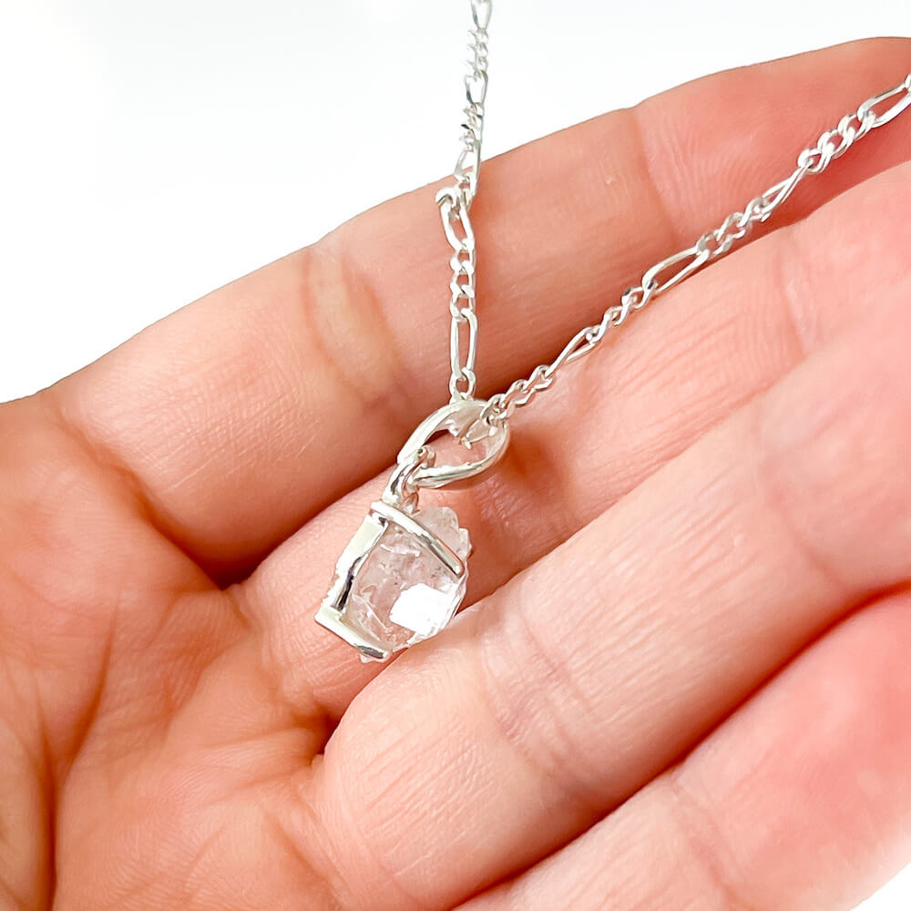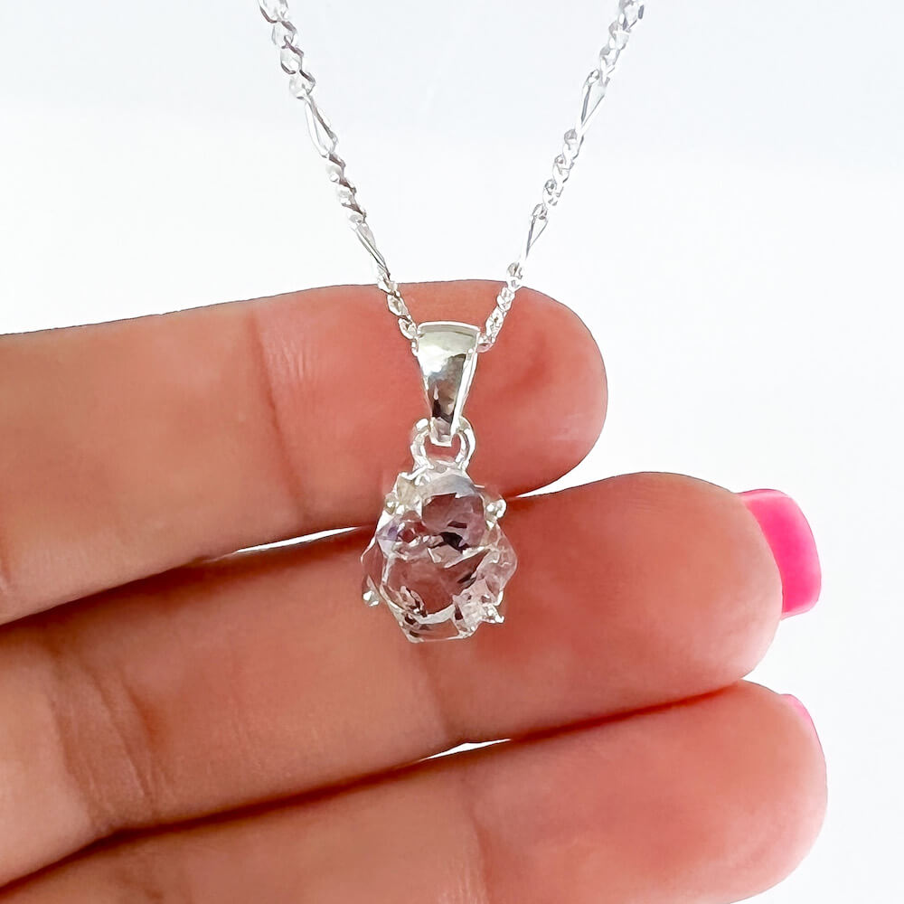 These Herkimer Diamond crystal pendant necklaces are of high, translucent quality and are double terminated. This listing is for ONE (1) intuitively chosen pendant. Each crystal is individual and some have natural inclusions like rainbows, cloudy areas naturally etched divots, and stepped imprints from other crystals. Know that each Herkimer Diamond pendant was hand-selected to guarantee quality and beauty.