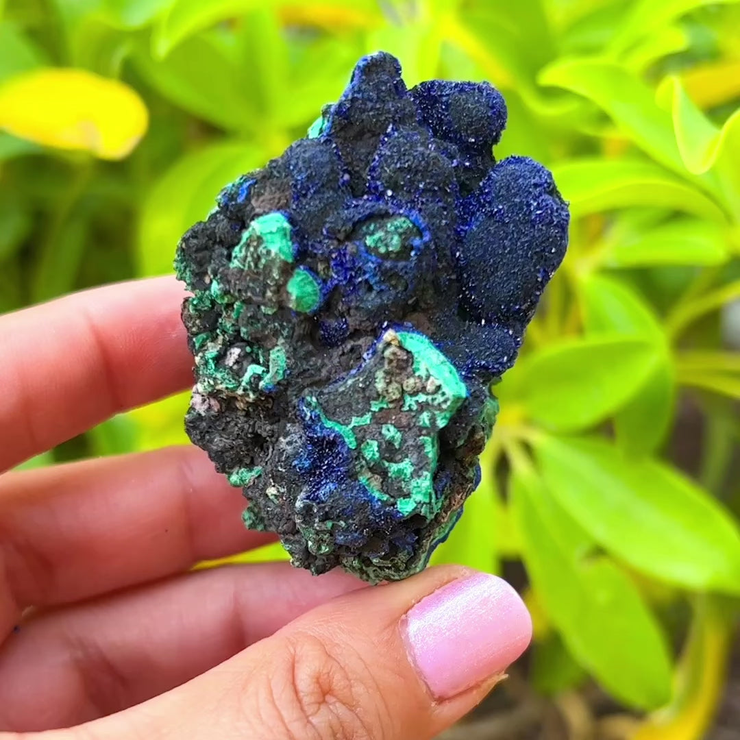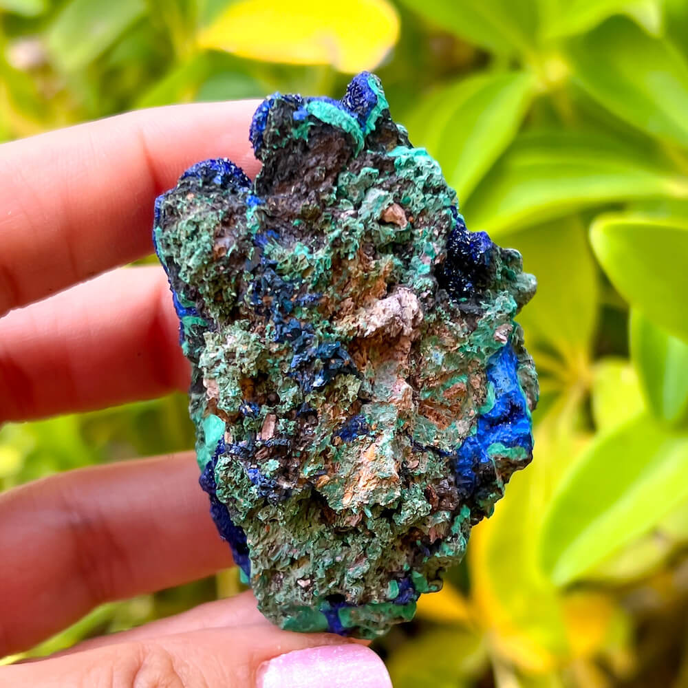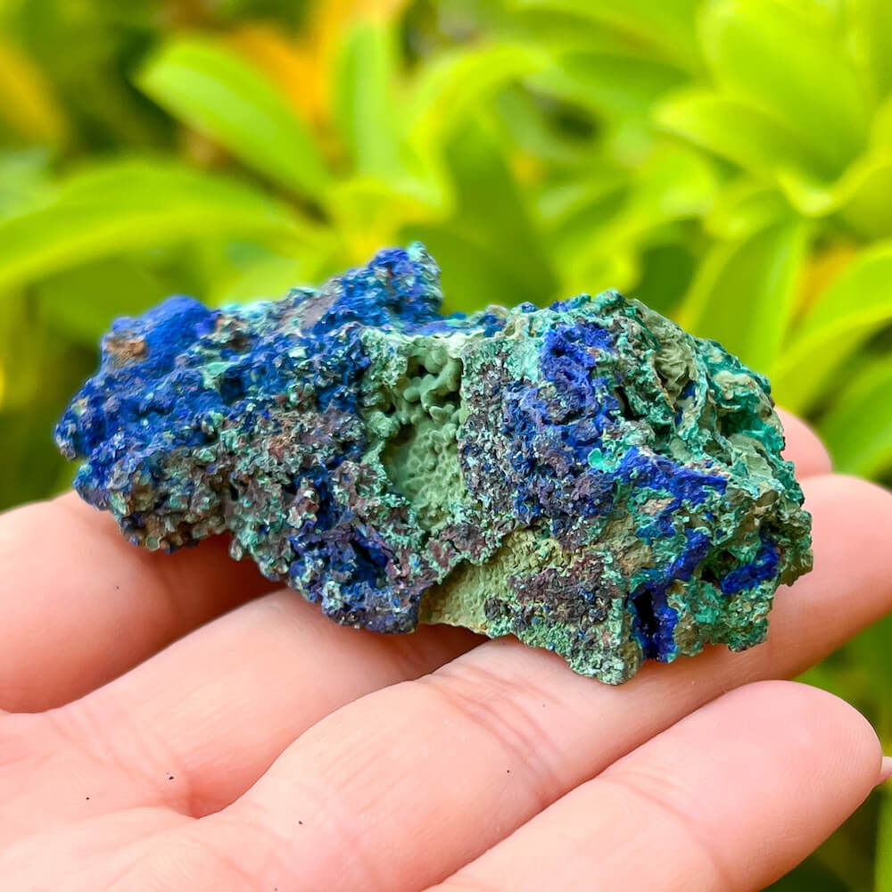 United as azurite-malachite, it is believed this mineral blends different traits together, freshens the user's outlook on life, as well as dissolving egocentric characteristics; dispelling conceit, arrogance, and vanity, and enhancing flexibility in motion and thought.