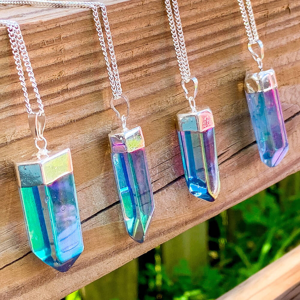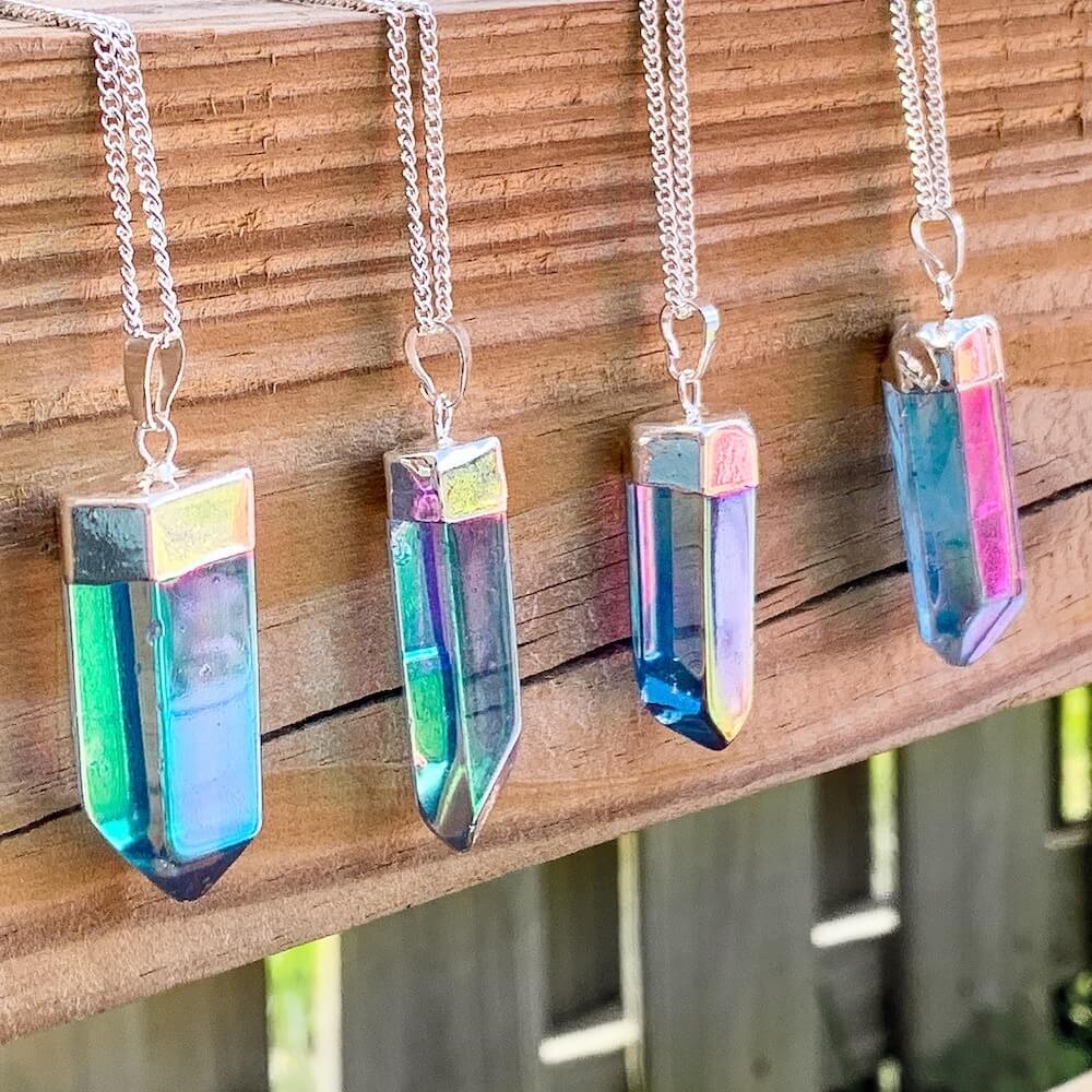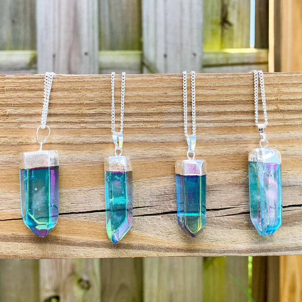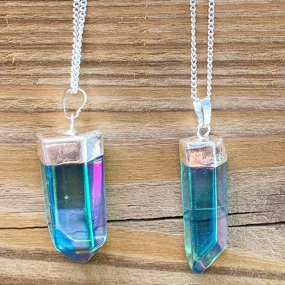 Typical Appearance: Aura Quartz is created through atomic vapor deposition. The outer surface of clear Quartz becomes bonded with atoms of different metals, just a few atoms thick, creating beautiful color and iridescence. The different precious metals and combinations of metals create a wonderful variety of vibrant colors.