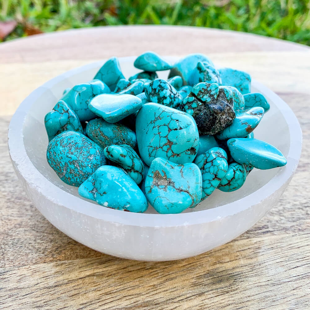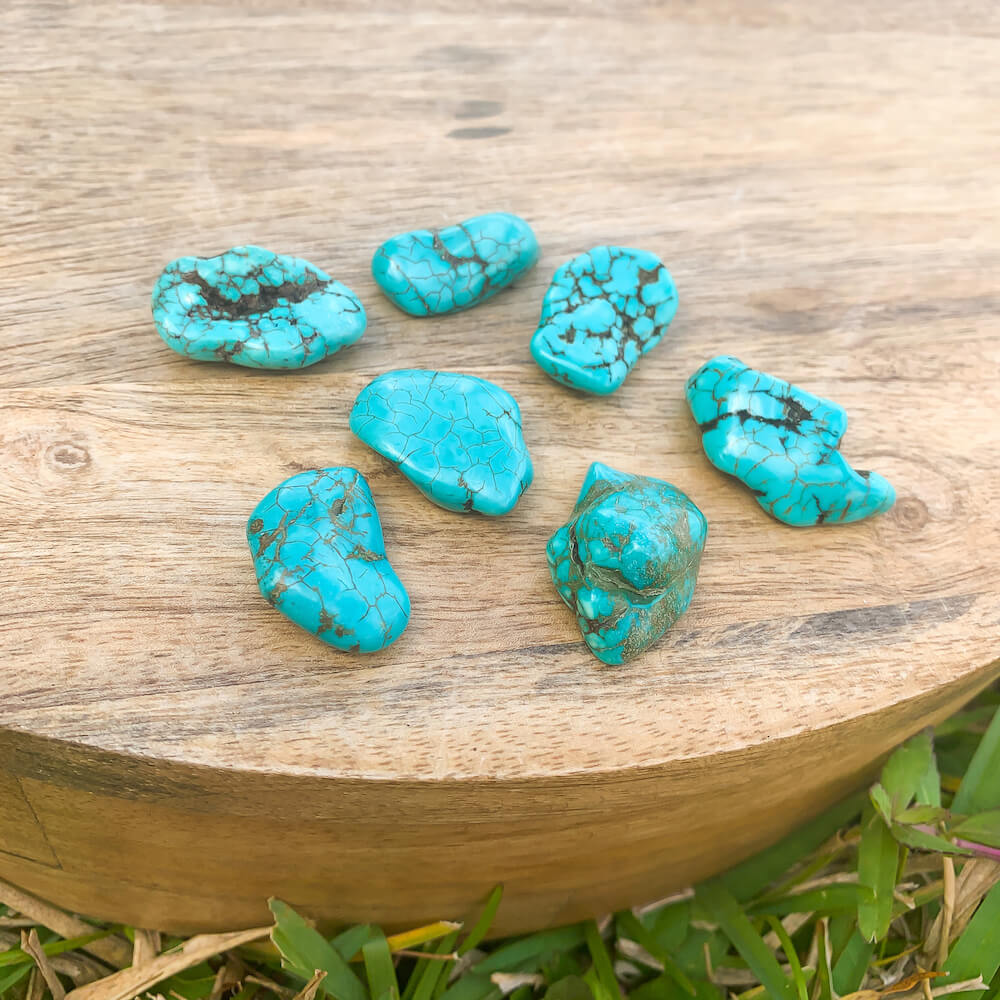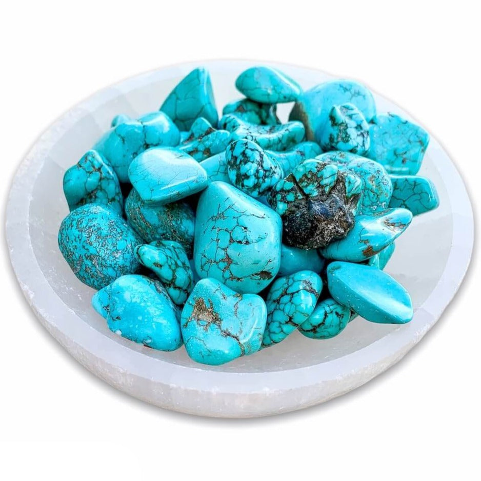 Blue Howlite Turquoise is great for working with the Throat Chakra, to foster honest and clear communication from the heart, and with Water and Air Elements. Enhancing intuition, Turquoise also enhances communication between the physical and spiritual realms. Use Turquoise to release old vows, express freely, and ease nerves when speaking in public. Turquoise is a protective stone, often being used for amulets.