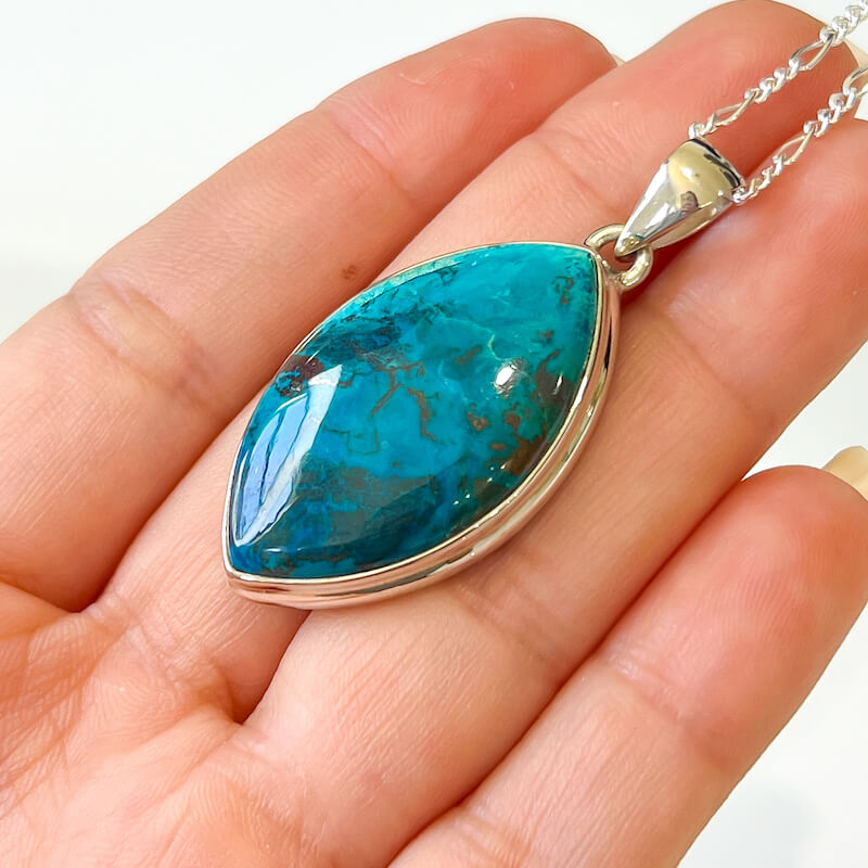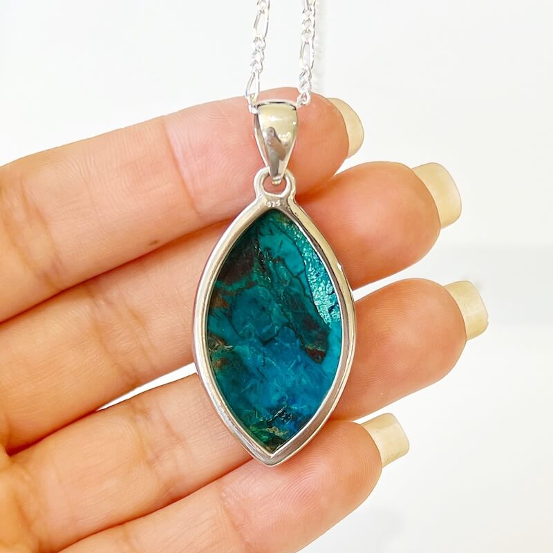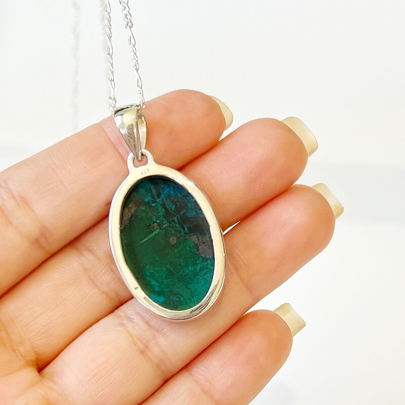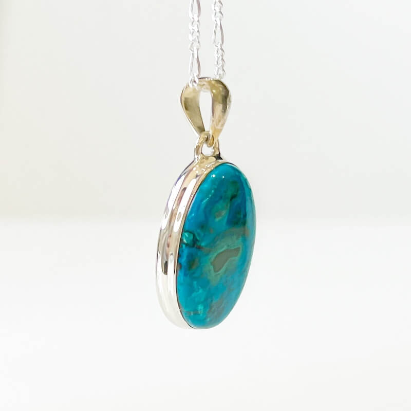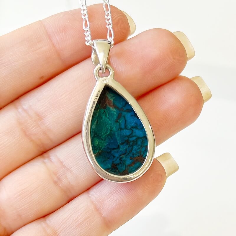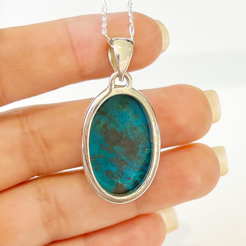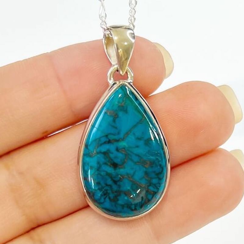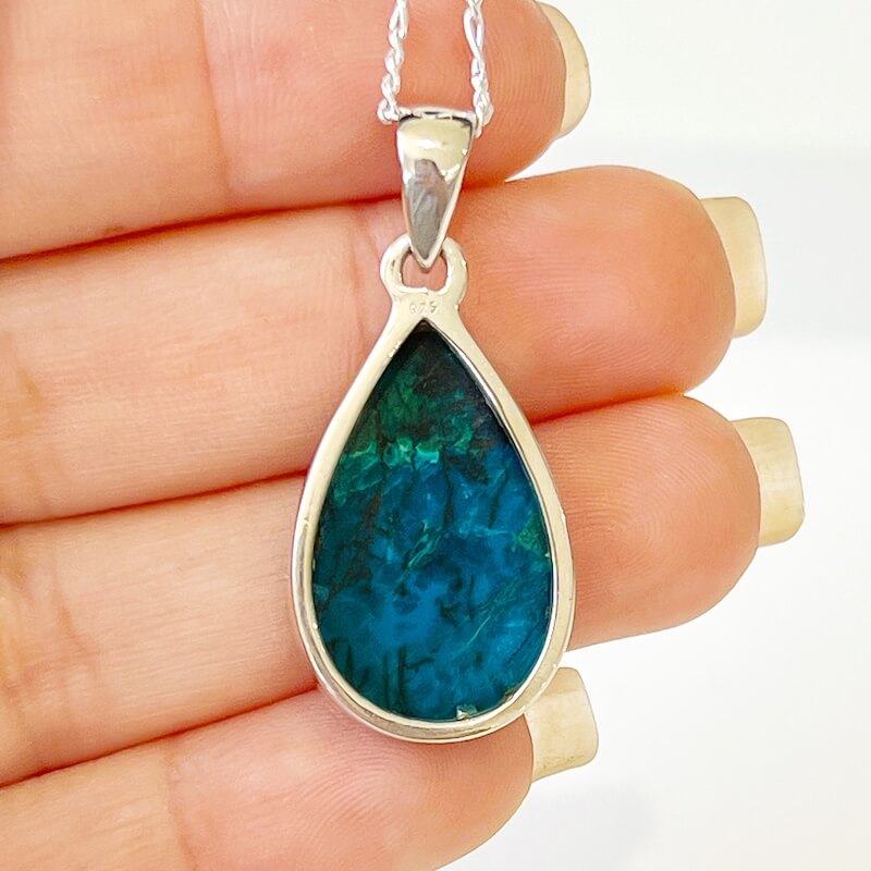 - Polished Authentic Chrysocolla Stone bezel set into 925 sterling silver