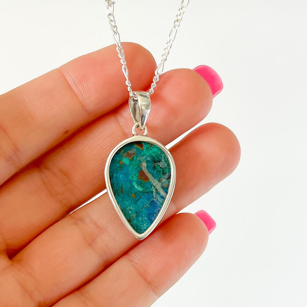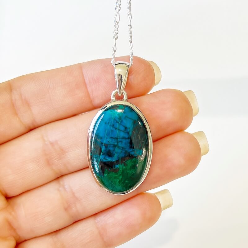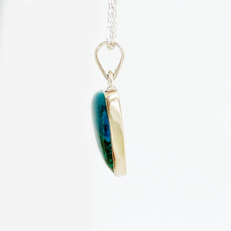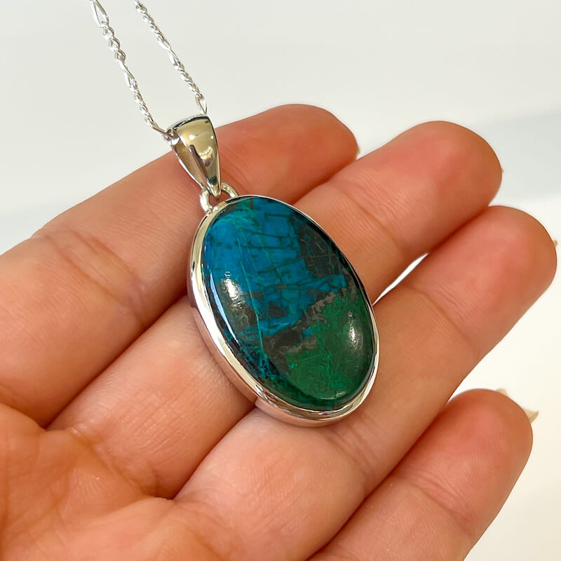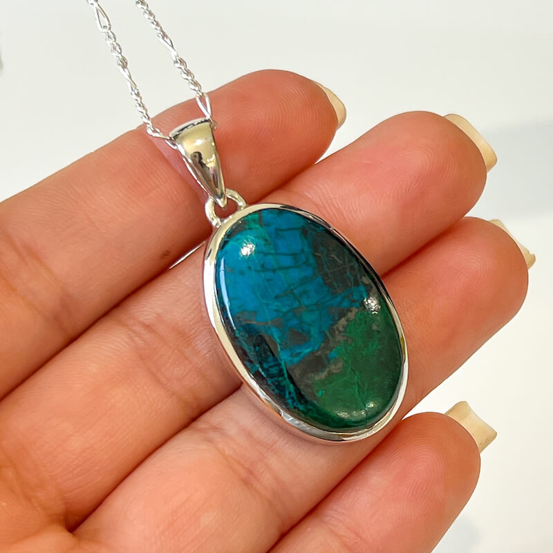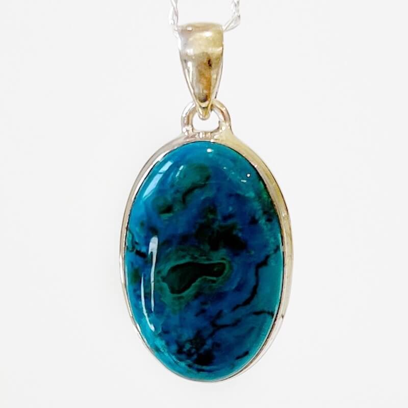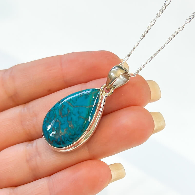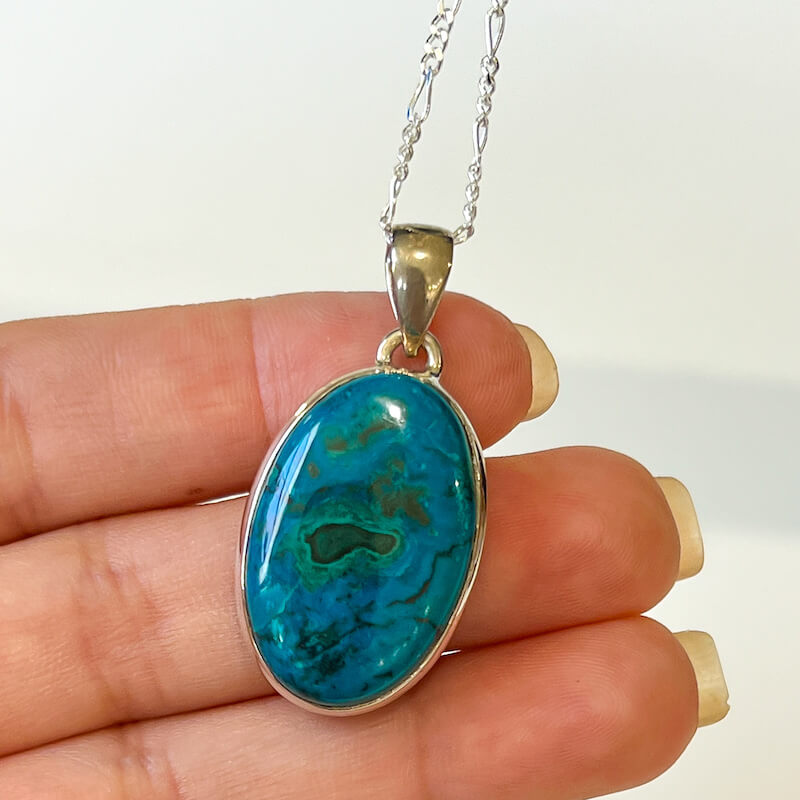 - Polished Authentic Chrysocolla Stone bezel set into 925 sterling silver