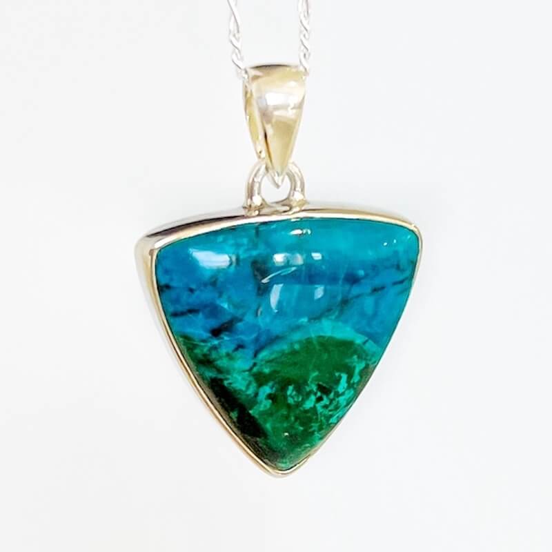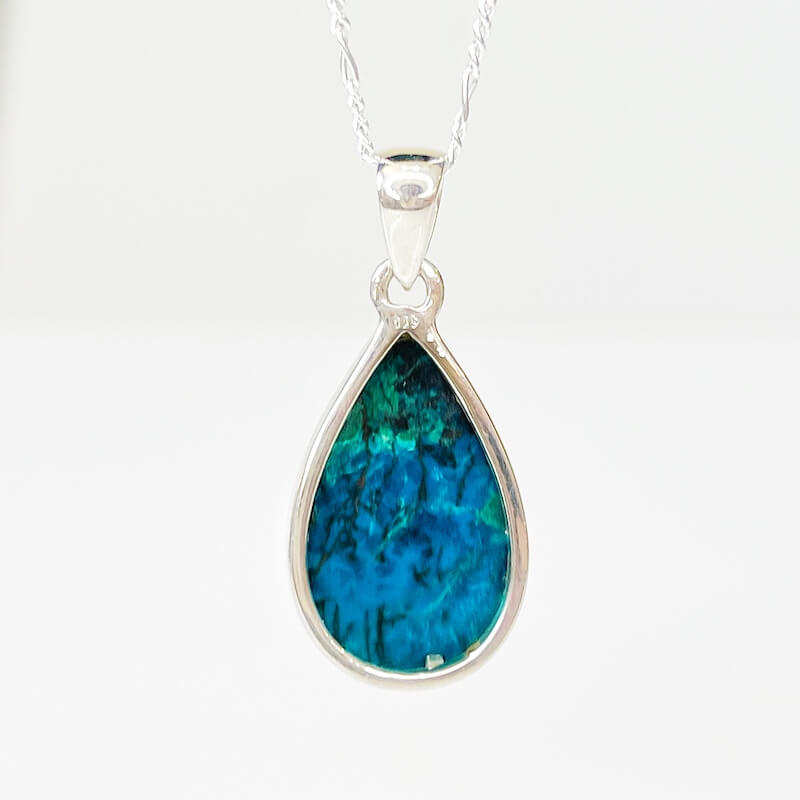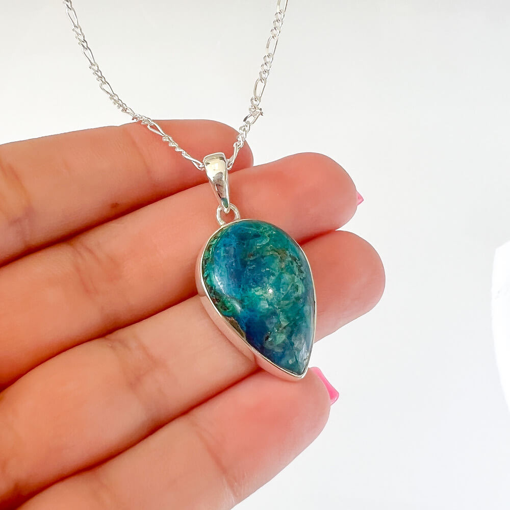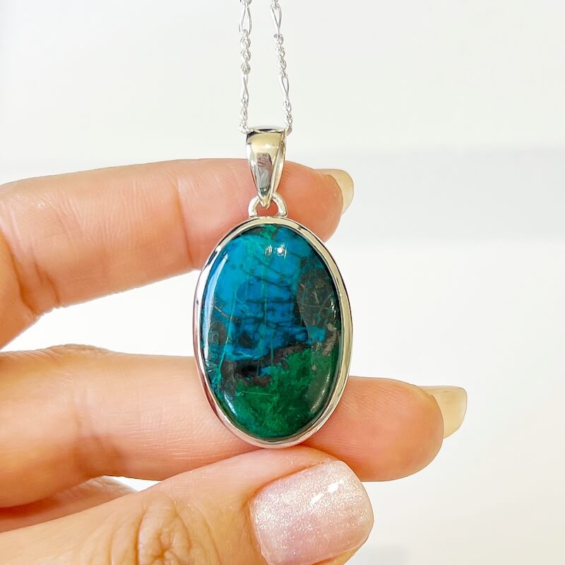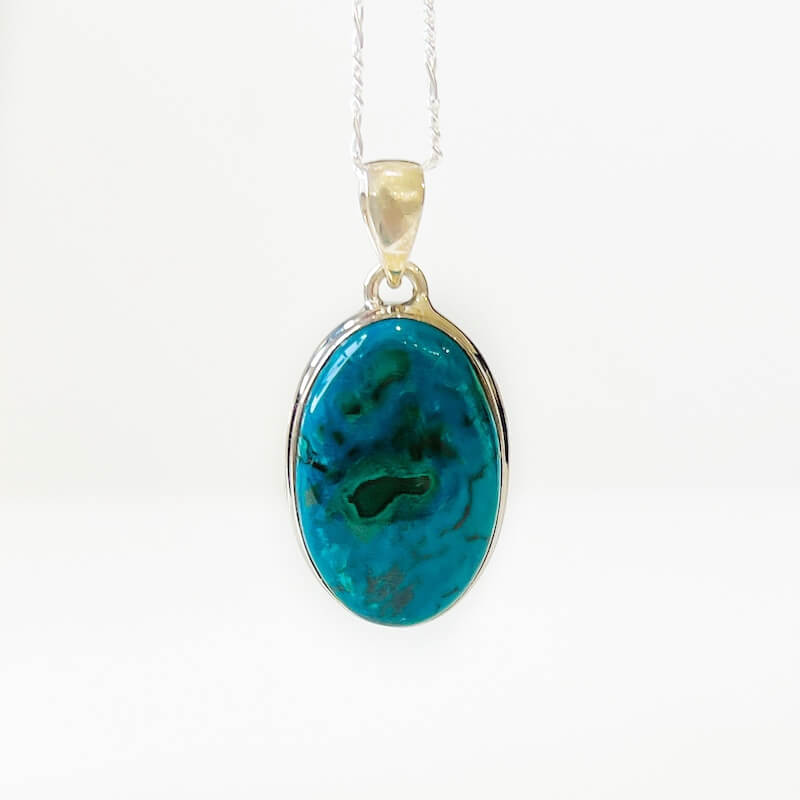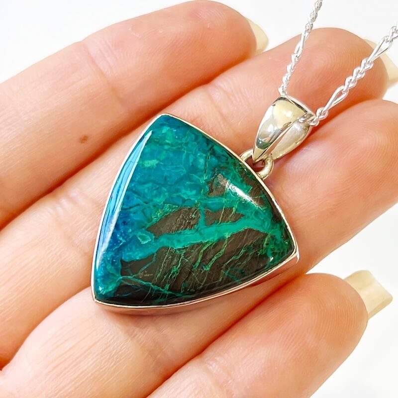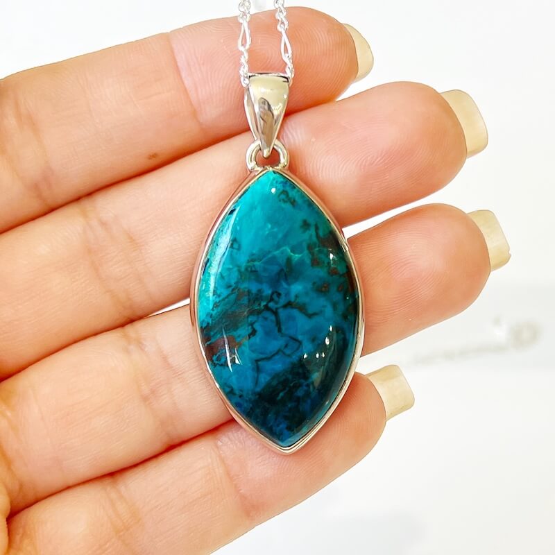 - Polished Authentic Chrysocolla Stone bezel set into 925 sterling silver