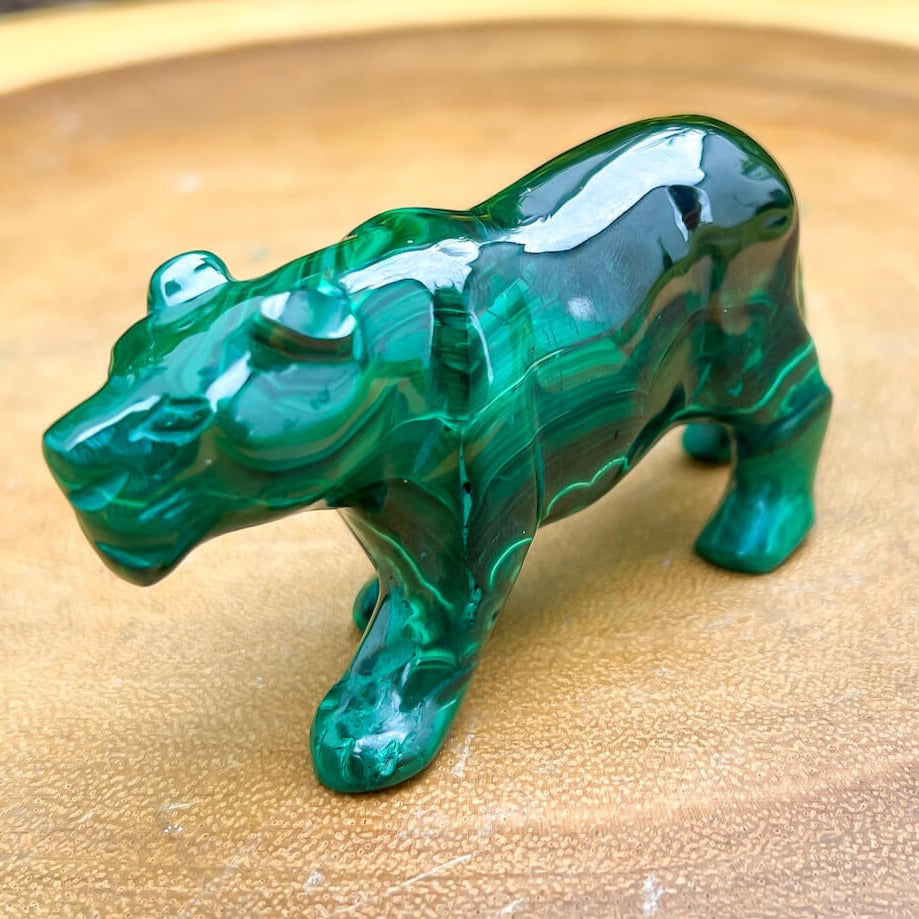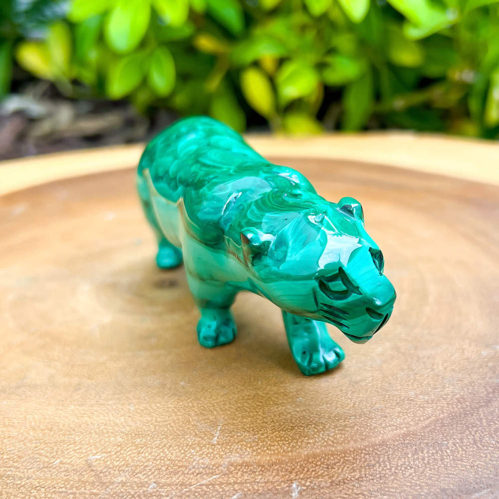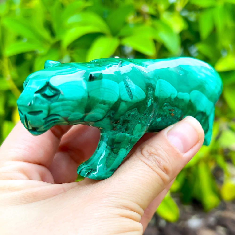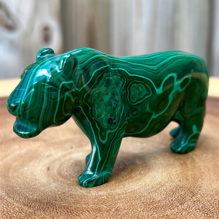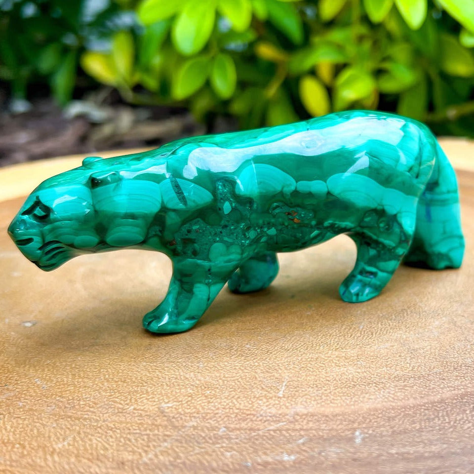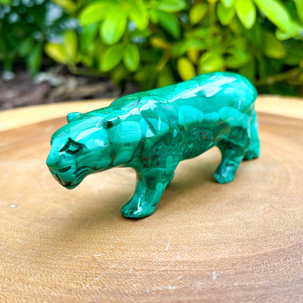 One of a kind Leopard Carving from Congo. Malachite natural, a genuine semiprecious stone from the Democratic Republic of the Congo. You will receive the exact Malachite piece is shown.  Malachite is such a cool stone. It is a copper carbonate hydroxide mineral that forms the most splendid patterns and designs, often forming in botryoidal masses. When looking at Malachite, remember that it is never uniform in its patterns. It will have thin lines, thick lines, circles, swirls, and those patterns form in light mint to the darkest hunter green shades. It is such an awesome stone to look at, spectacular in all of its twisty turvy patterns. - Genuine Malachite will never just line in a similar formation and will not have black in it. Beware of some fake Malachite pieces floating around.