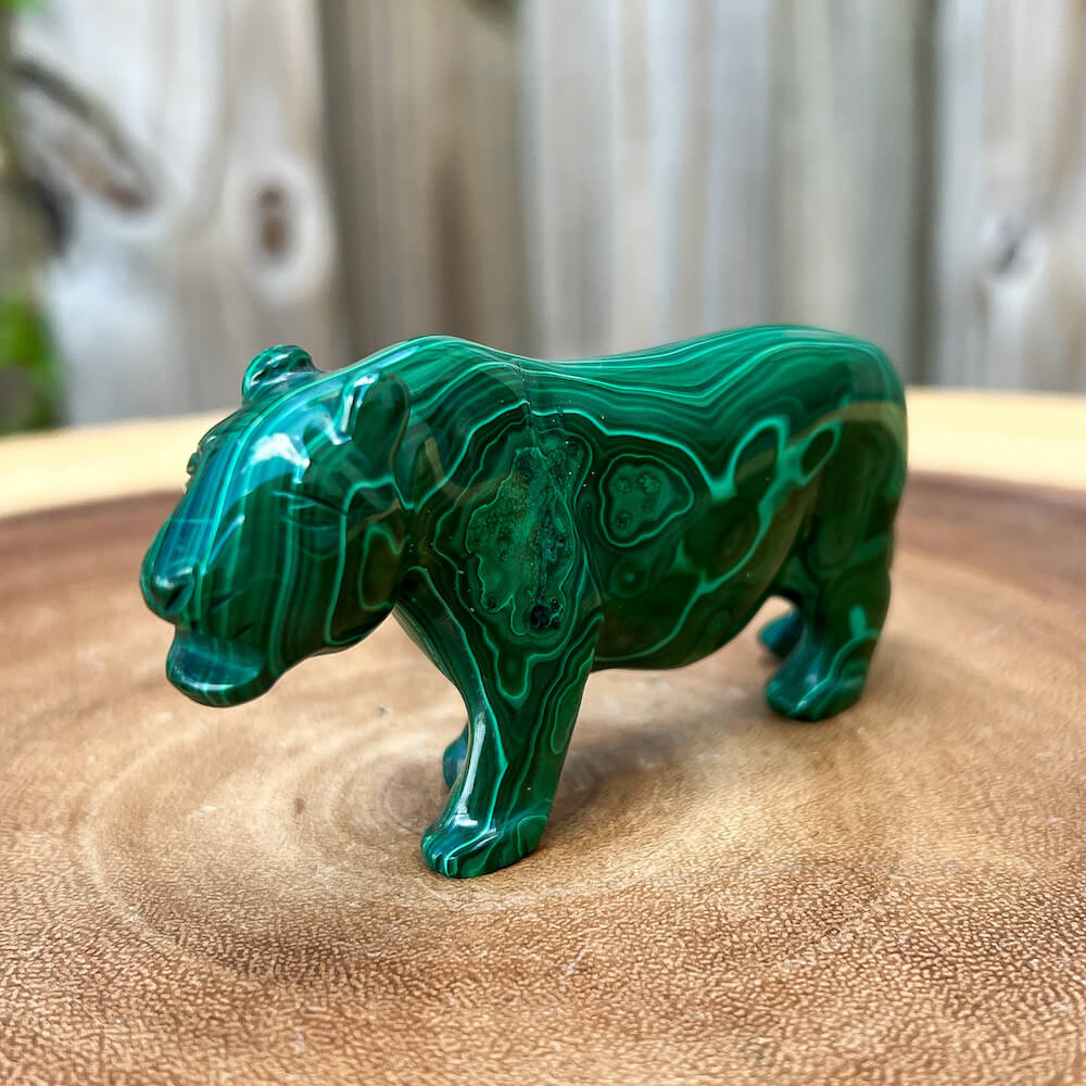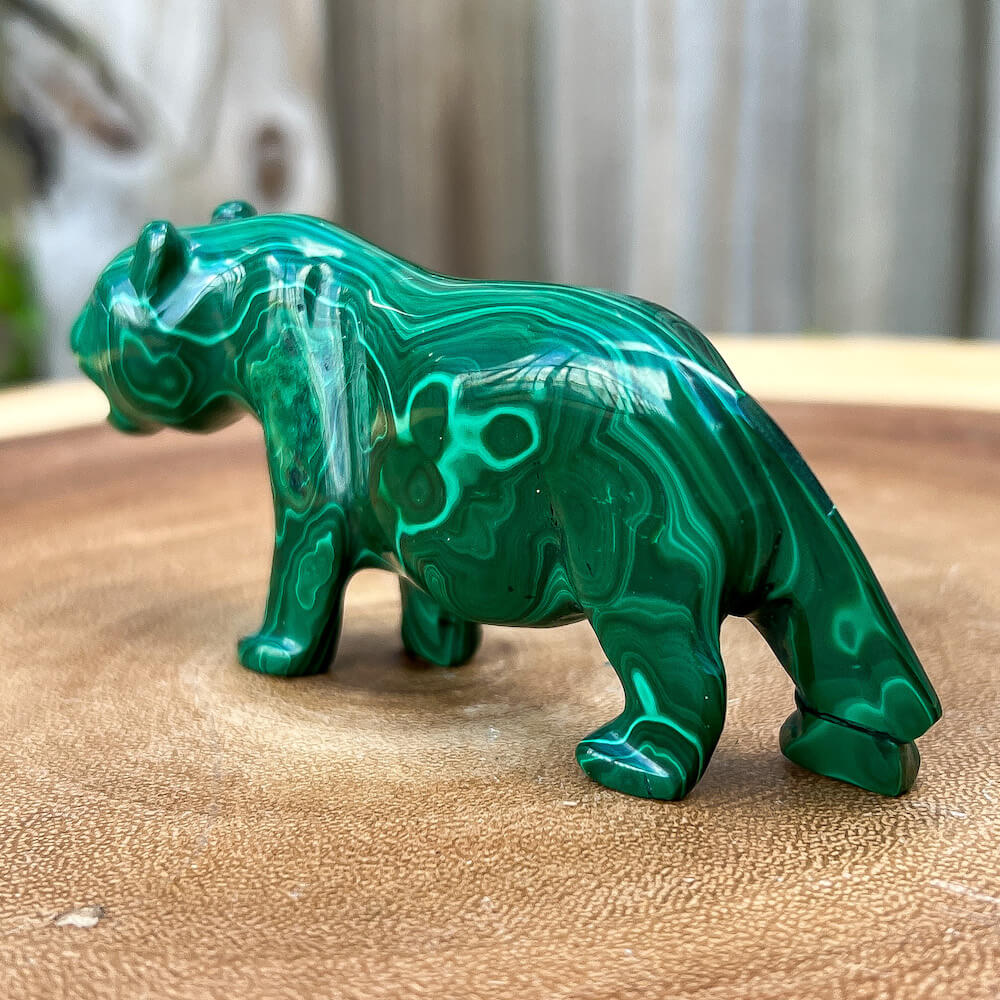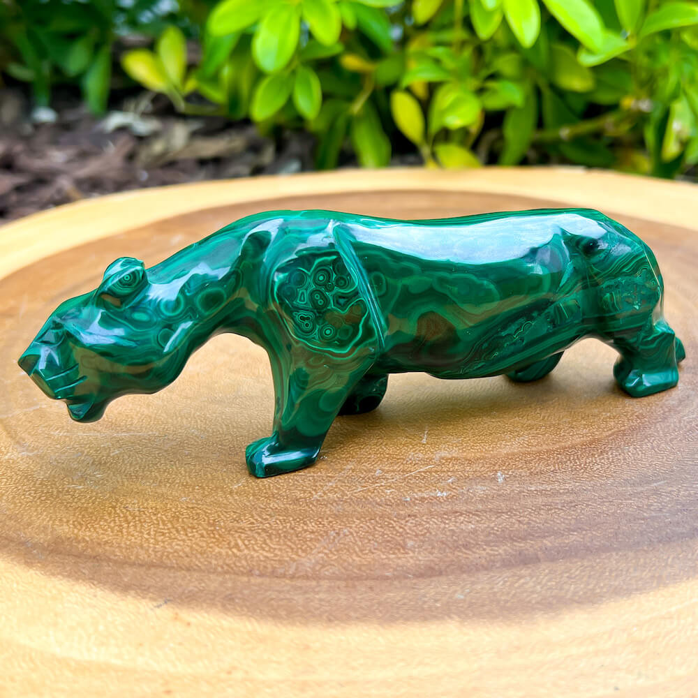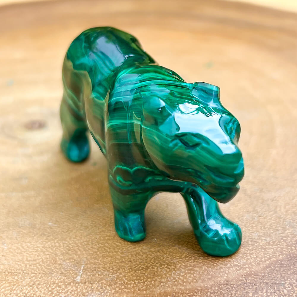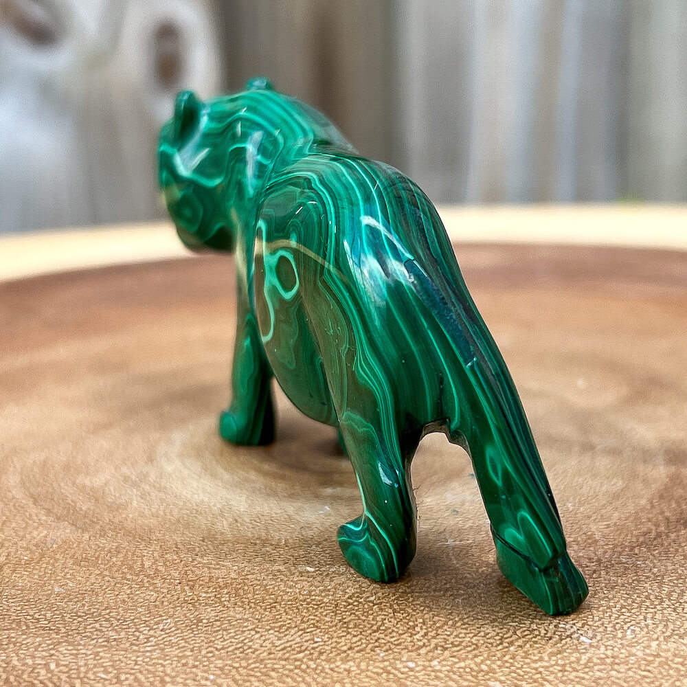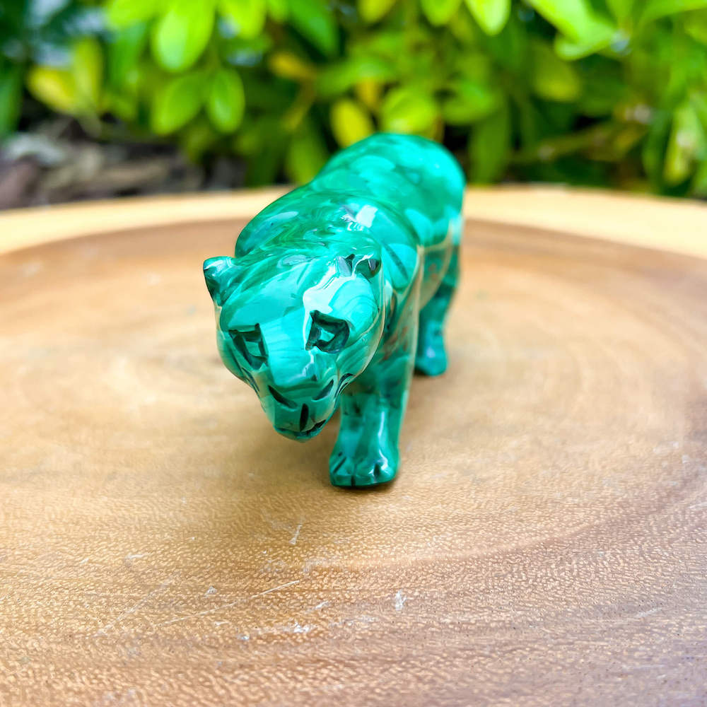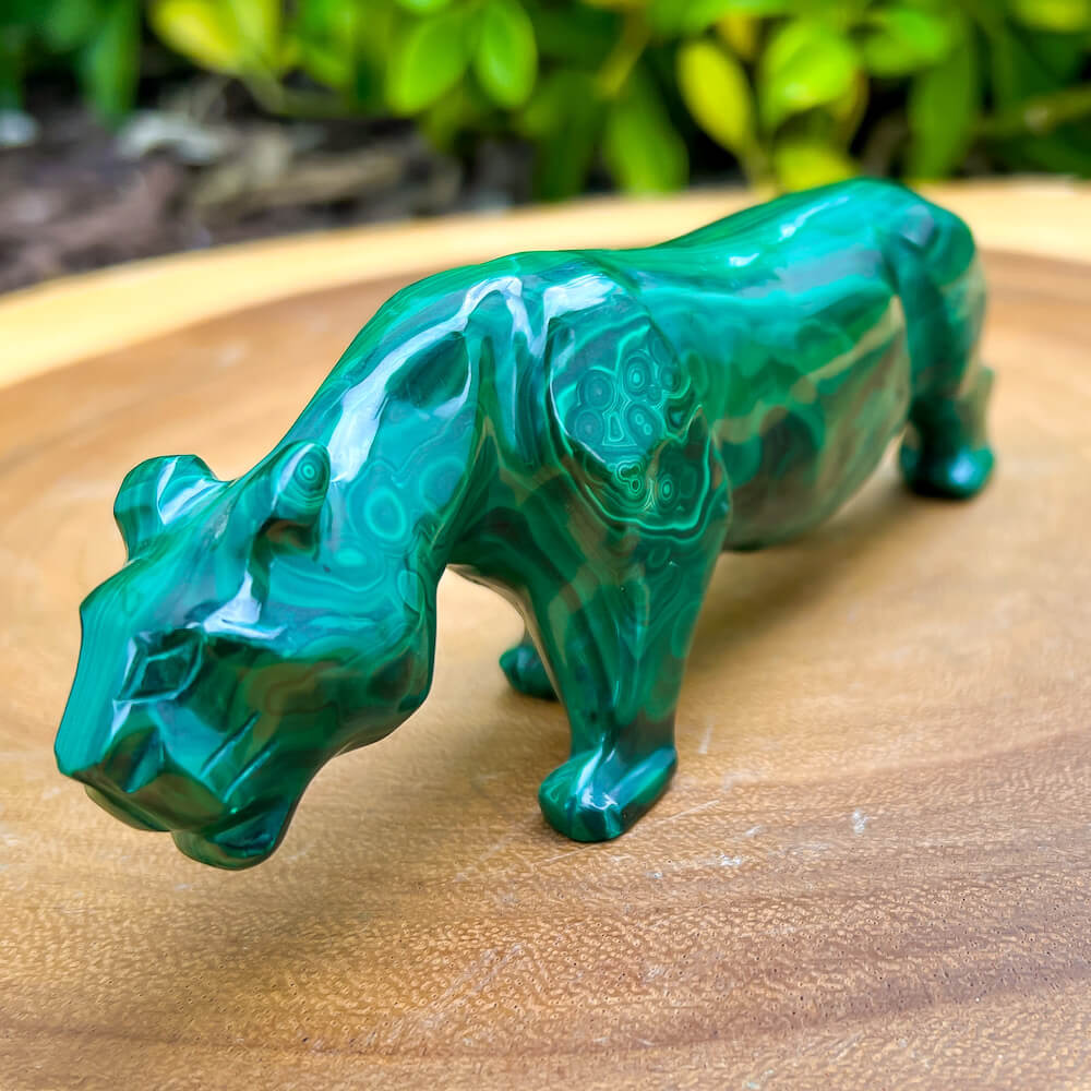 One of a kind Leopard Carving from Congo. Malachite natural, a genuine semiprecious stone from the Democratic Republic of the Congo. You will receive the exact Malachite piece is shown.  Malachite is such a cool stone. It is a copper carbonate hydroxide mineral that forms the most splendid patterns and designs, often forming in botryoidal masses. When looking at Malachite, remember that it is never uniform in its patterns. It will have thin lines, thick lines, circles, swirls, and those patterns form in light mint to the darkest hunter green shades. It is such an awesome stone to look at, spectacular in all of its twisty turvy patterns. - Genuine Malachite will never just line in a similar formation and will not have black in it. Beware of some fake Malachite pieces floating around.