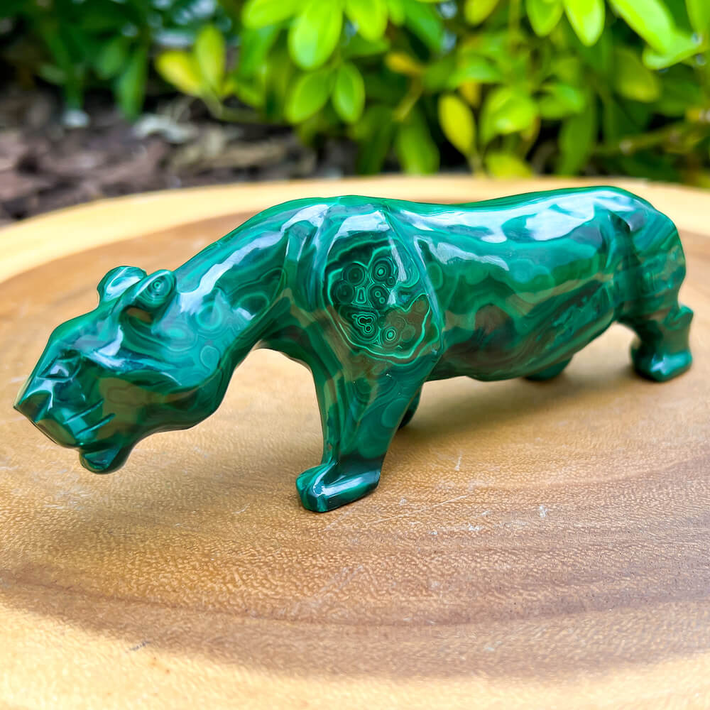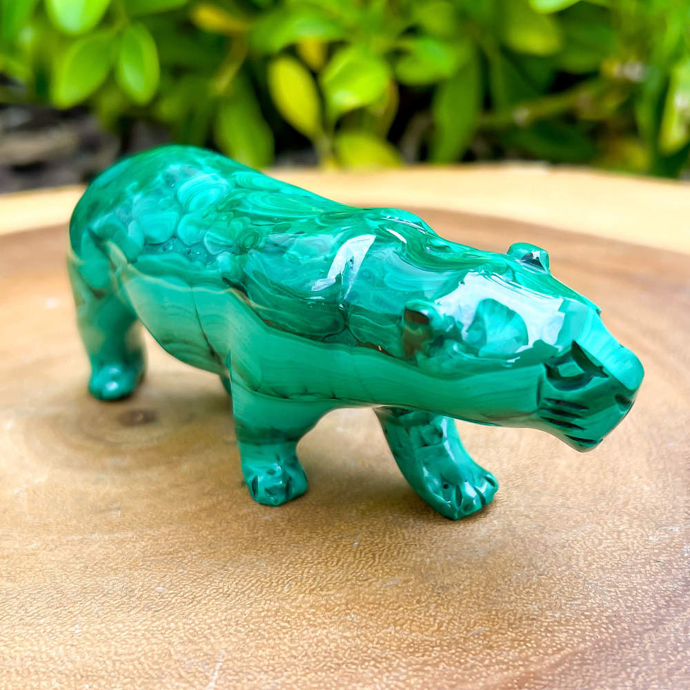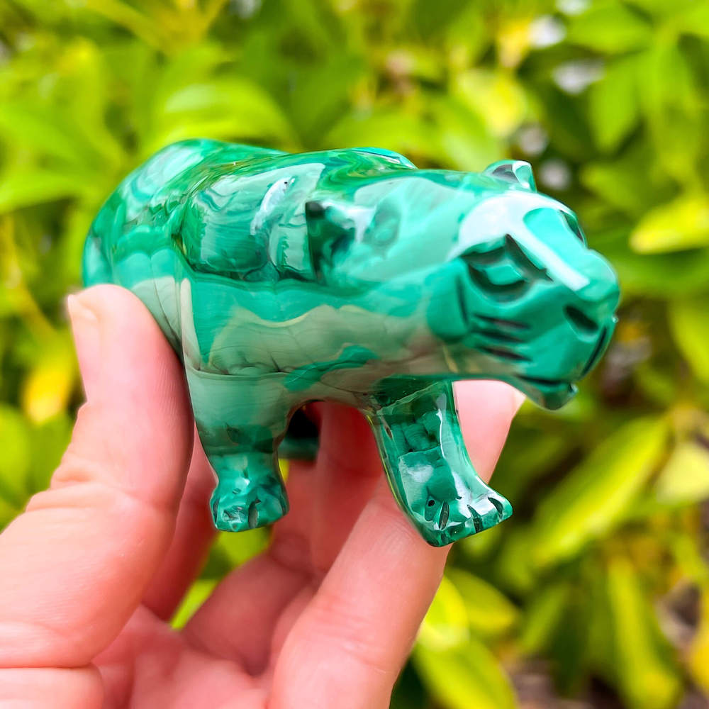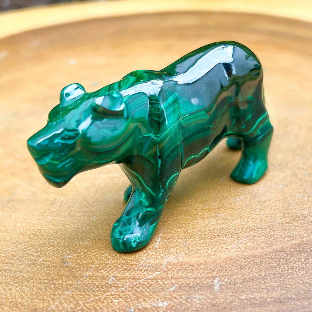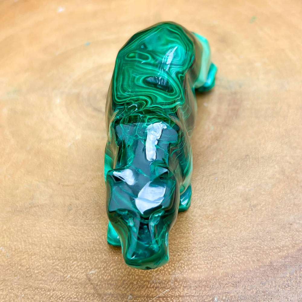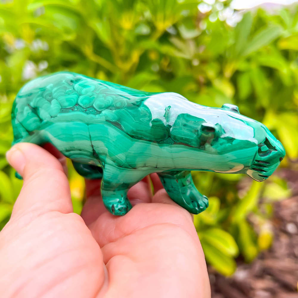 One of a kind Leopard Carving from Congo. Malachite natural, a genuine semiprecious stone from the Democratic Republic of the Congo. You will receive the exact Malachite piece is shown.  Malachite is such a cool stone. It is a copper carbonate hydroxide mineral that forms the most splendid patterns and designs, often forming in botryoidal masses. When looking at Malachite, remember that it is never uniform in its patterns. It will have thin lines, thick lines, circles, swirls, and those patterns form in light mint to the darkest hunter green shades. It is such an awesome stone to look at, spectacular in all of its twisty turvy patterns. - Genuine Malachite will never just line in a similar formation and will not have black in it. Beware of some fake Malachite pieces floating around.