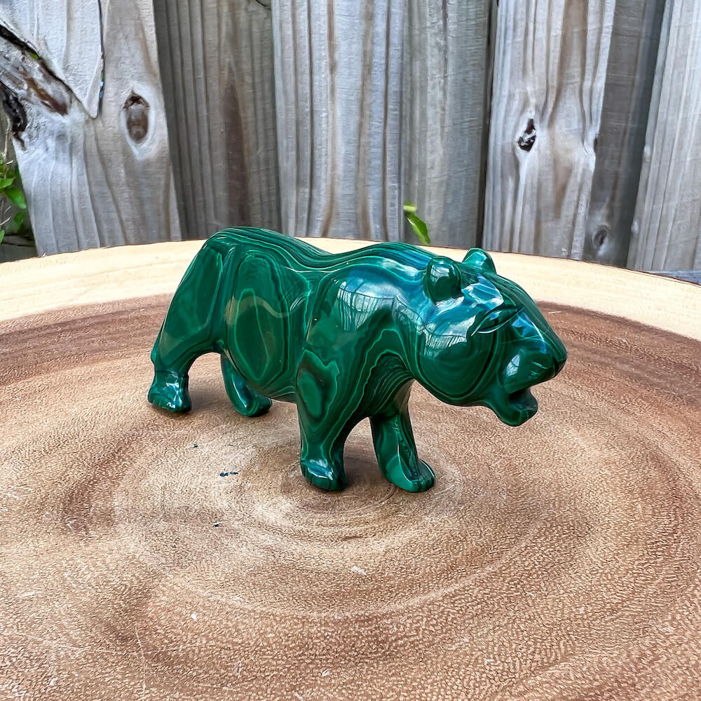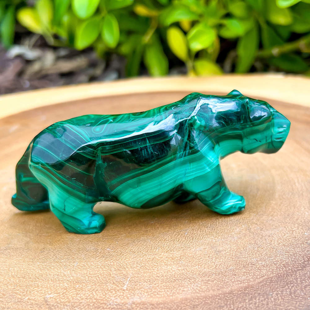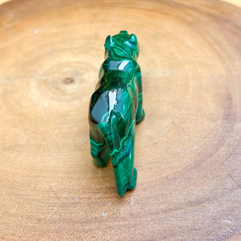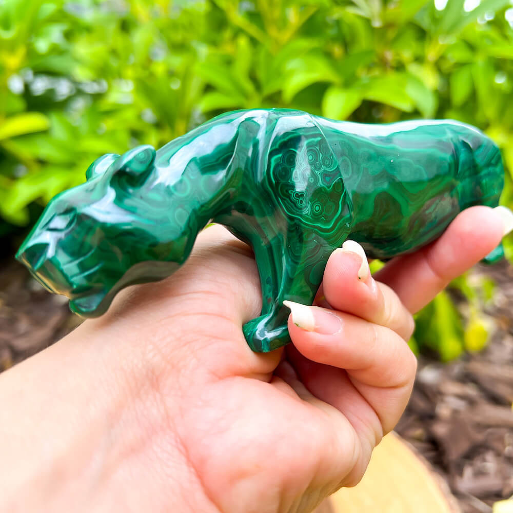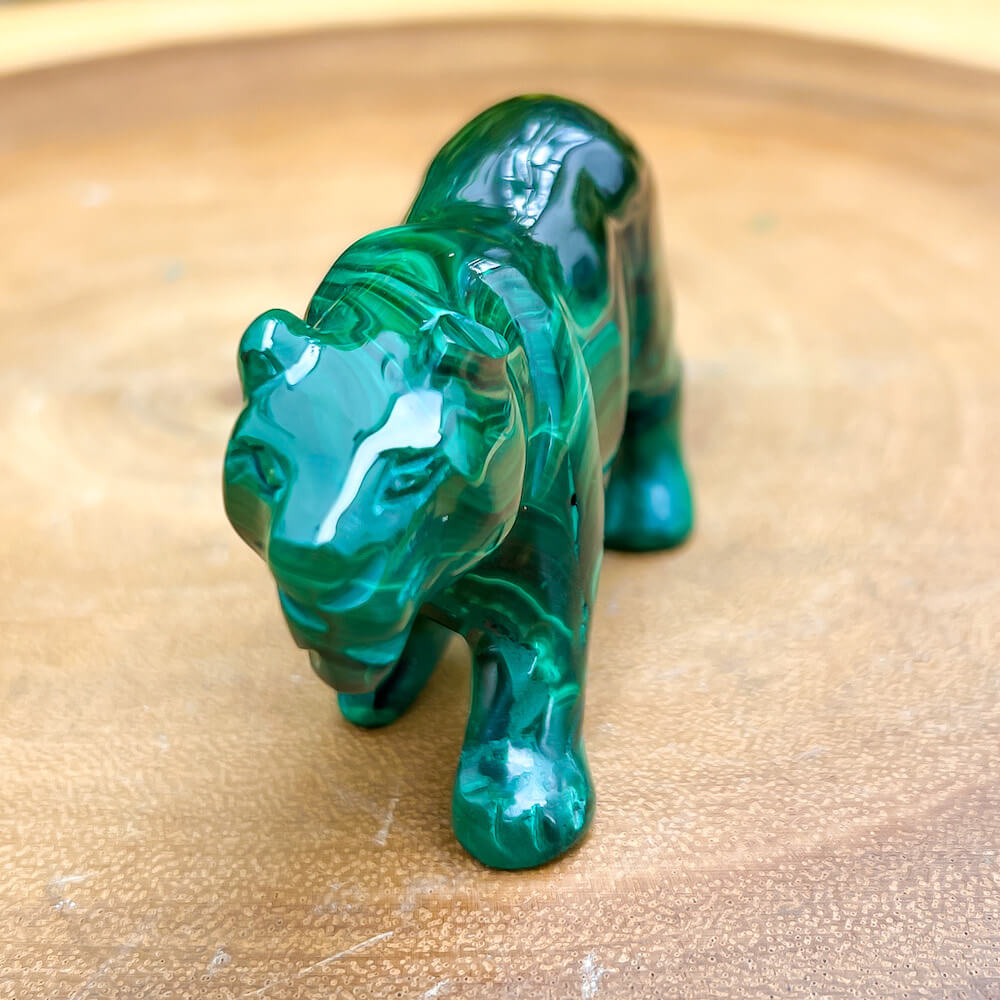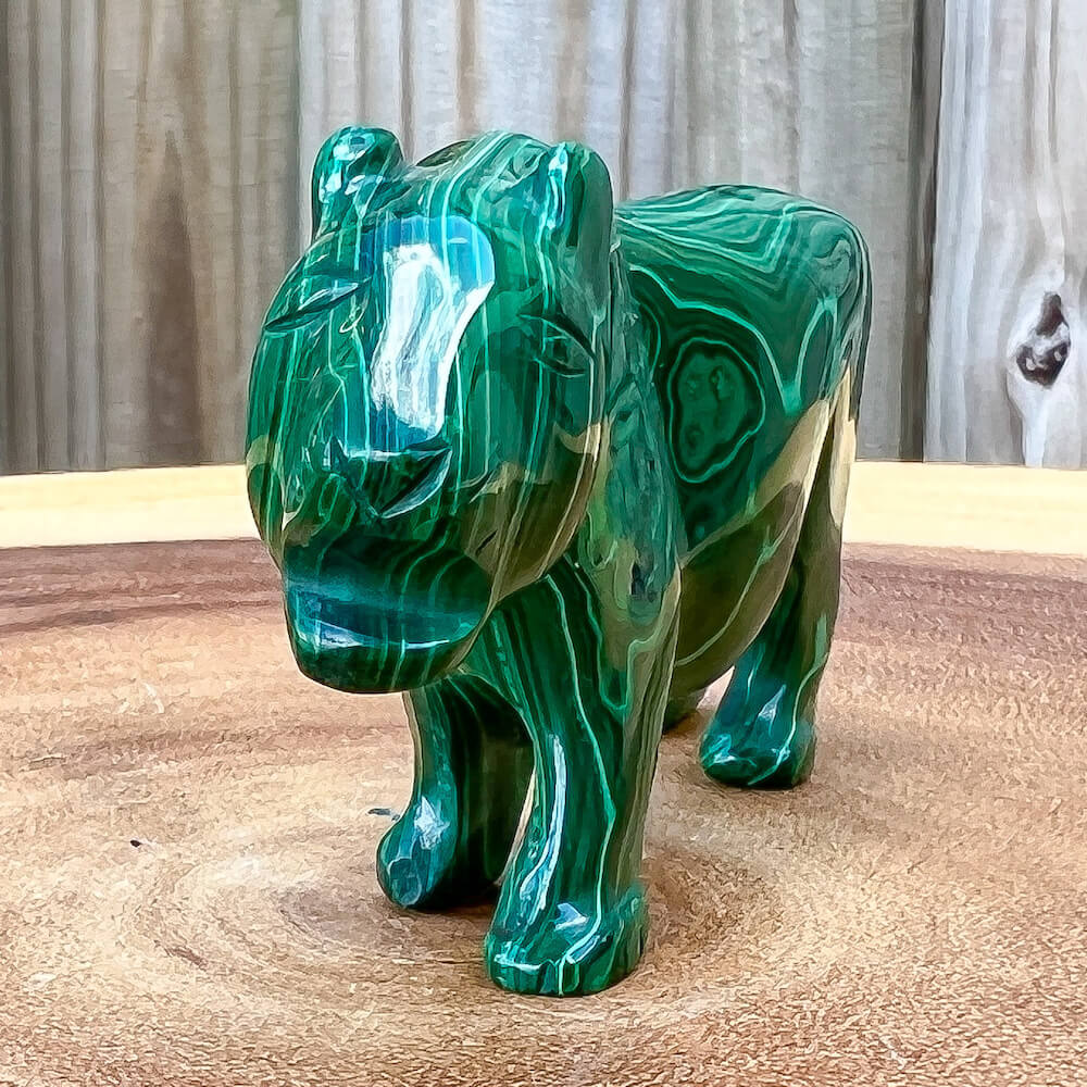 One of a kind Leopard Carving from Congo. Malachite natural, a genuine semiprecious stone from the Democratic Republic of the Congo. You will receive the exact Malachite piece is shown.  Malachite is such a cool stone. It is a copper carbonate hydroxide mineral that forms the most splendid patterns and designs, often forming in botryoidal masses. When looking at Malachite, remember that it is never uniform in its patterns. It will have thin lines, thick lines, circles, swirls, and those patterns form in light mint to the darkest hunter green shades. It is such an awesome stone to look at, spectacular in all of its twisty turvy patterns. - Genuine Malachite will never just line in a similar formation and will not have black in it. Beware of some fake Malachite pieces floating around.