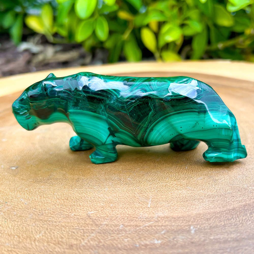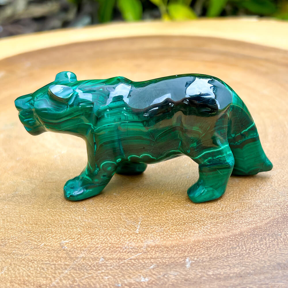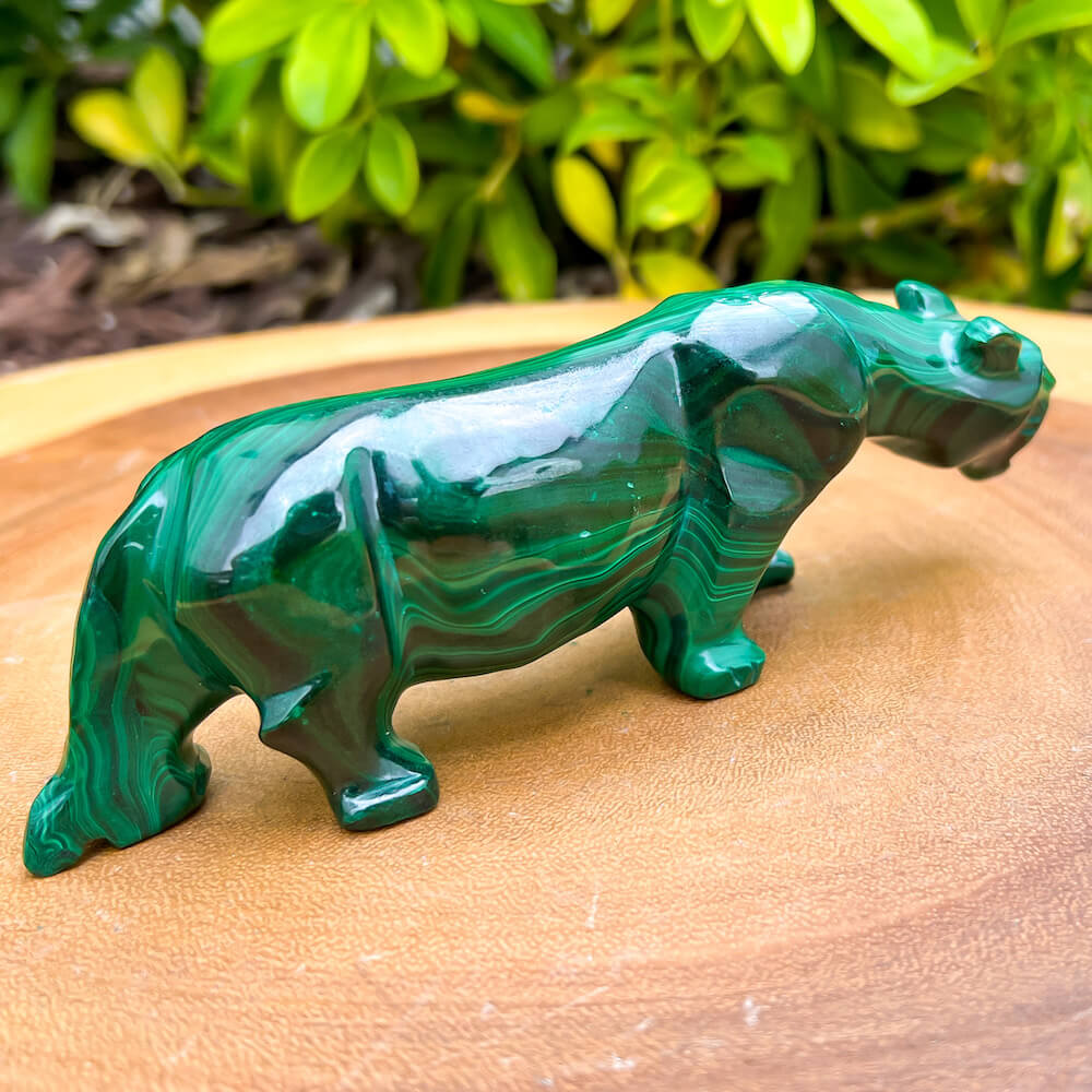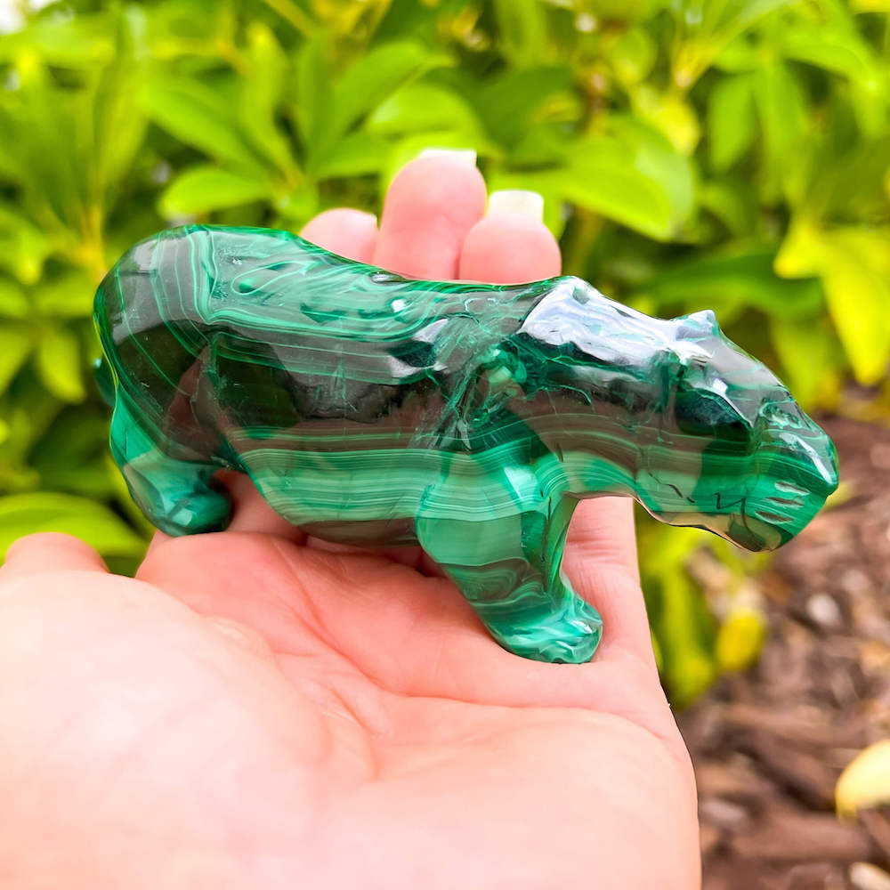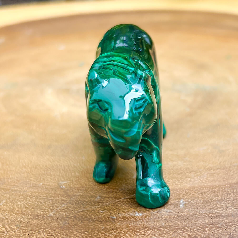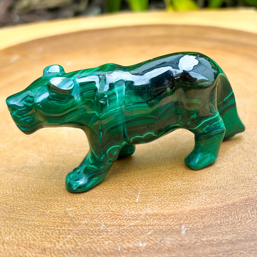 One of a kind Leopard Carving from Congo. Malachite natural, a genuine semiprecious stone from the Democratic Republic of the Congo. You will receive the exact Malachite piece is shown.  Malachite is such a cool stone. It is a copper carbonate hydroxide mineral that forms the most splendid patterns and designs, often forming in botryoidal masses. When looking at Malachite, remember that it is never uniform in its patterns. It will have thin lines, thick lines, circles, swirls, and those patterns form in light mint to the darkest hunter green shades. It is such an awesome stone to look at, spectacular in all of its twisty turvy patterns. - Genuine Malachite will never just line in a similar formation and will not have black in it. Beware of some fake Malachite pieces floating around.