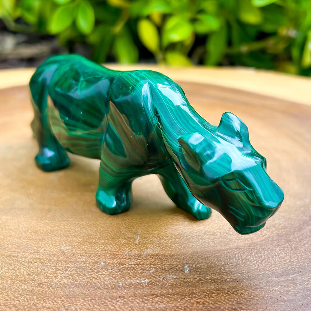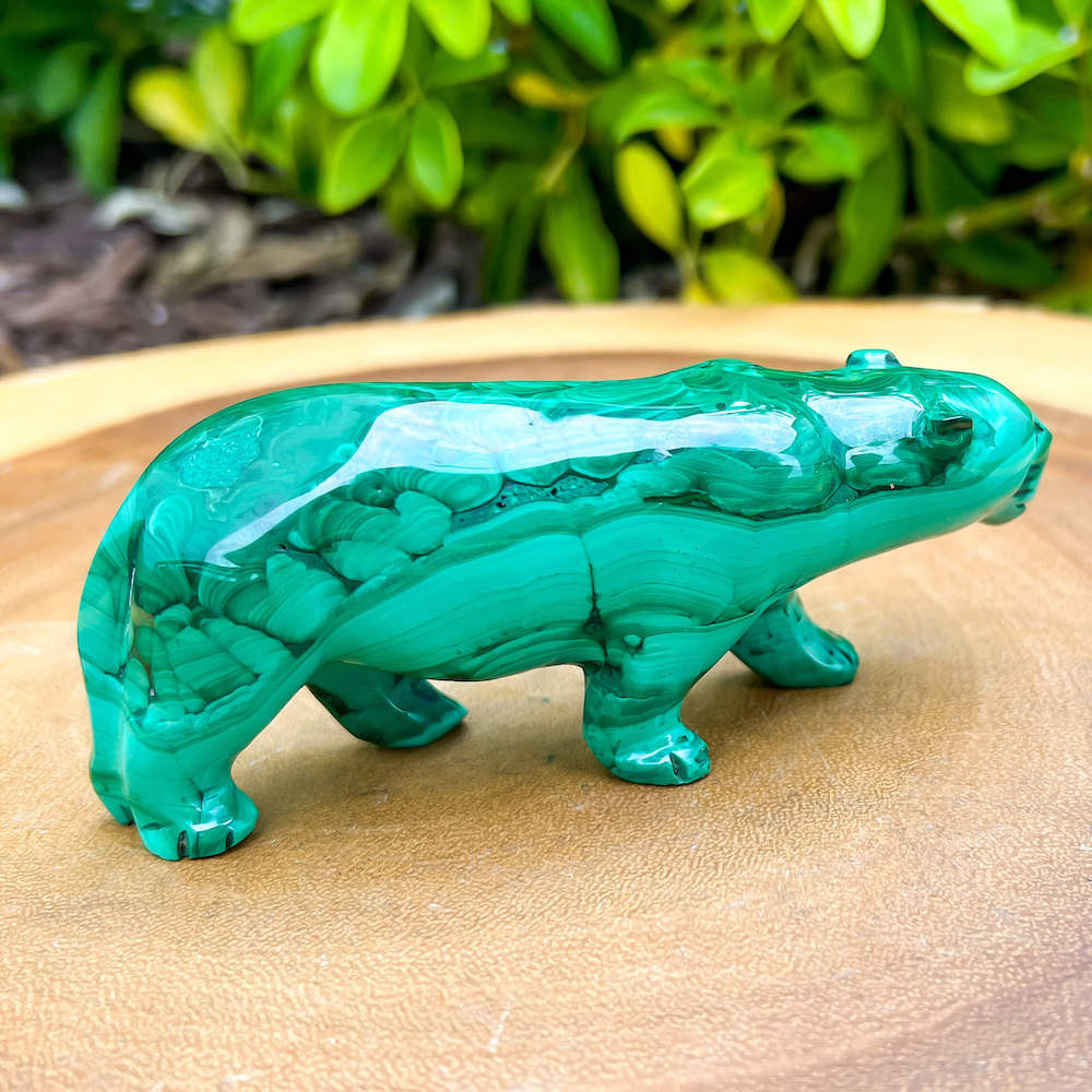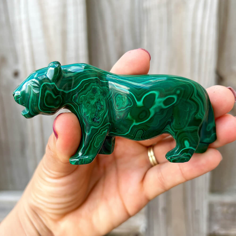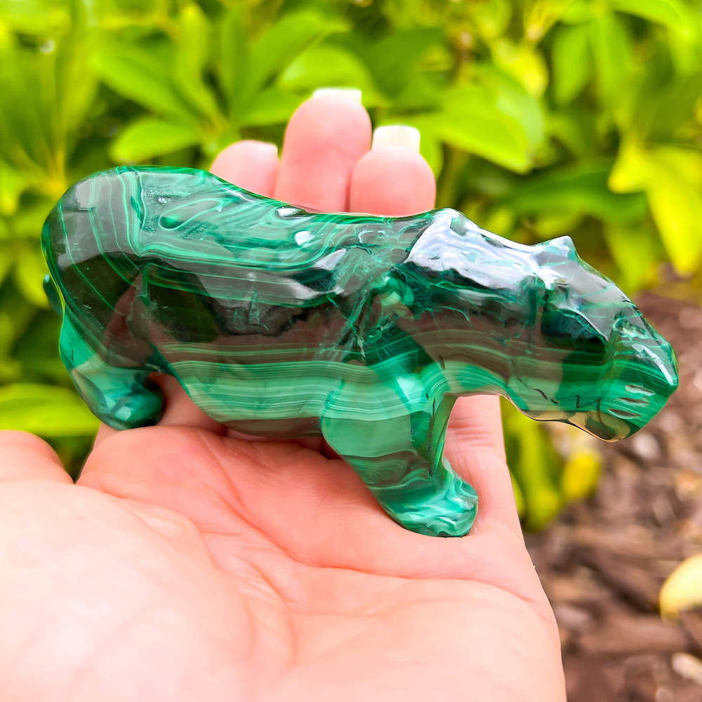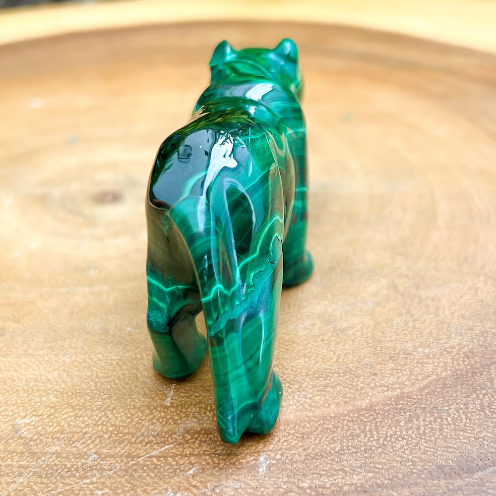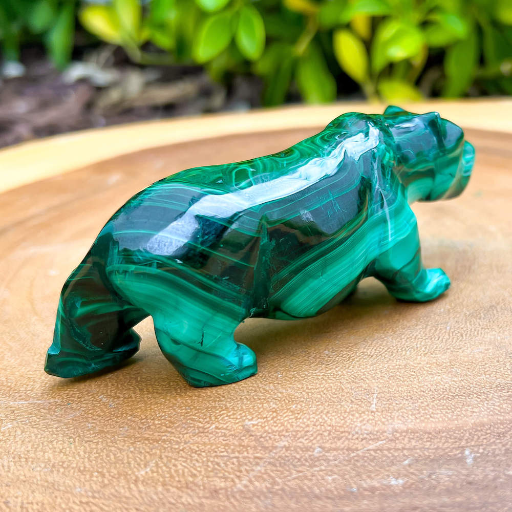 One of a kind Leopard Carving from Congo. Malachite natural, a genuine semiprecious stone from the Democratic Republic of the Congo. You will receive the exact Malachite piece is shown.  Malachite is such a cool stone. It is a copper carbonate hydroxide mineral that forms the most splendid patterns and designs, often forming in botryoidal masses. When looking at Malachite, remember that it is never uniform in its patterns. It will have thin lines, thick lines, circles, swirls, and those patterns form in light mint to the darkest hunter green shades. It is such an awesome stone to look at, spectacular in all of its twisty turvy patterns. - Genuine Malachite will never just line in a similar formation and will not have black in it. Beware of some fake Malachite pieces floating around.