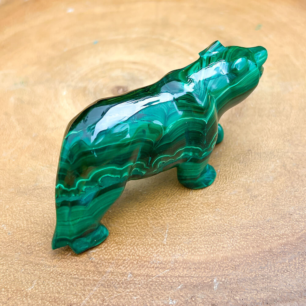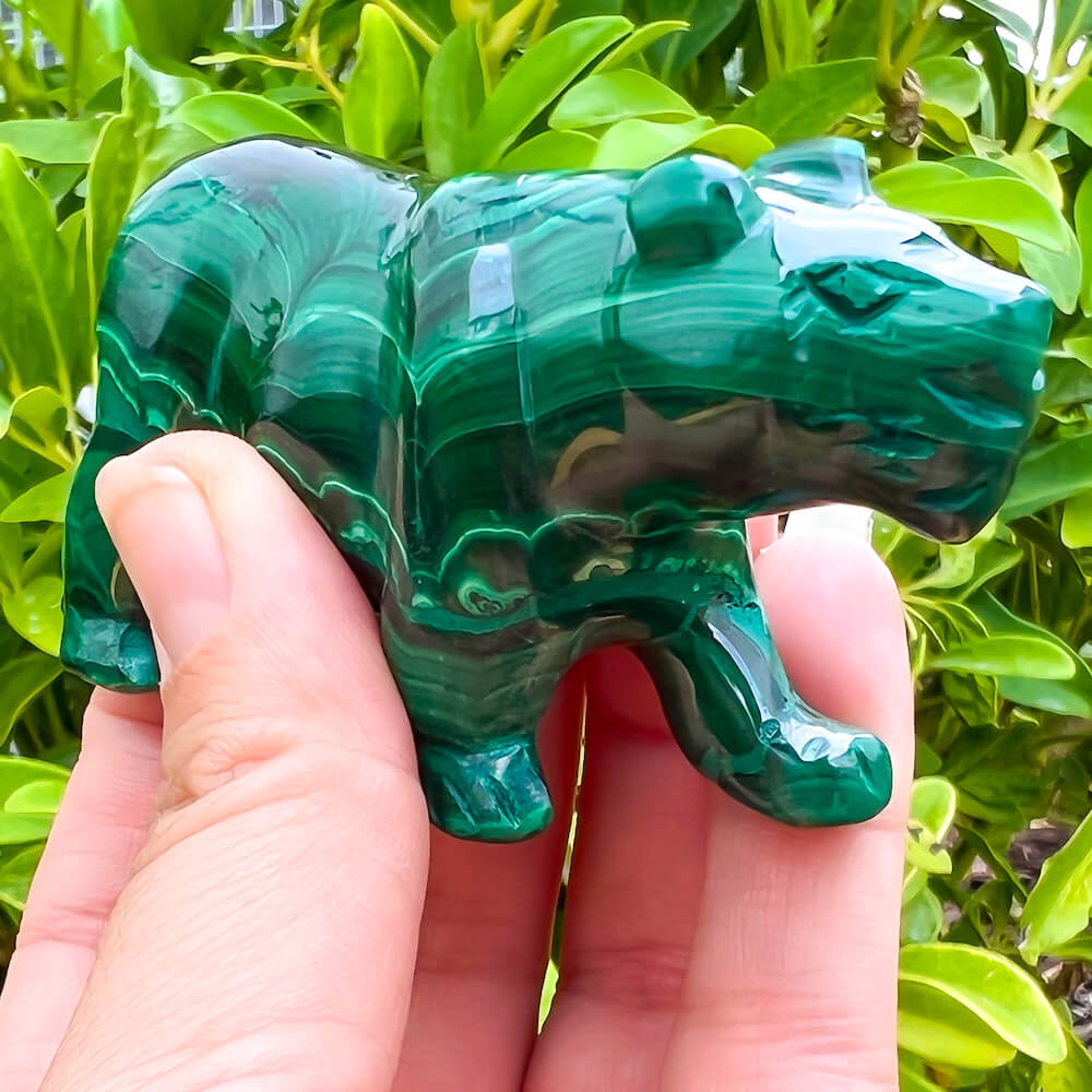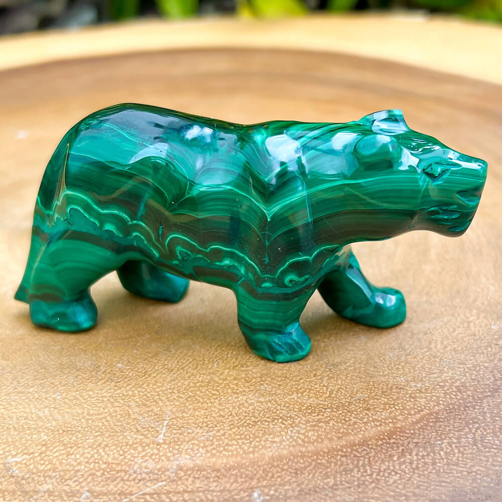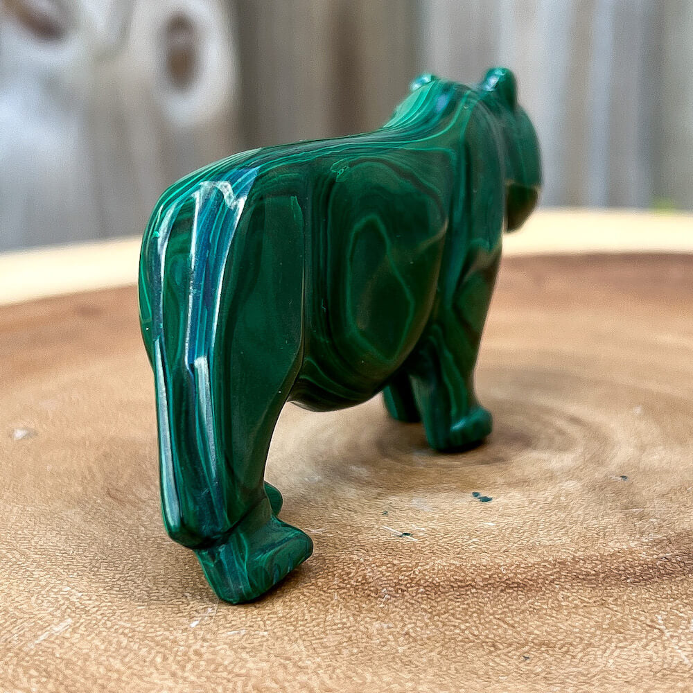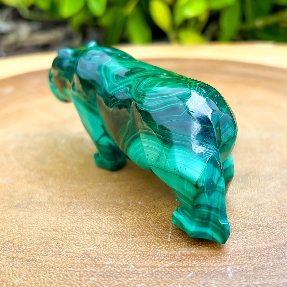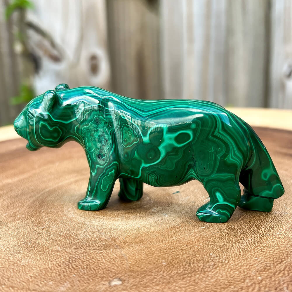 One of a kind Leopard Carving from Congo. Malachite natural, a genuine semiprecious stone from the Democratic Republic of the Congo. You will receive the exact Malachite piece is shown.  Malachite is such a cool stone. It is a copper carbonate hydroxide mineral that forms the most splendid patterns and designs, often forming in botryoidal masses. When looking at Malachite, remember that it is never uniform in its patterns. It will have thin lines, thick lines, circles, swirls, and those patterns form in light mint to the darkest hunter green shades. It is such an awesome stone to look at, spectacular in all of its twisty turvy patterns. - Genuine Malachite will never just line in a similar formation and will not have black in it. Beware of some fake Malachite pieces floating around.
