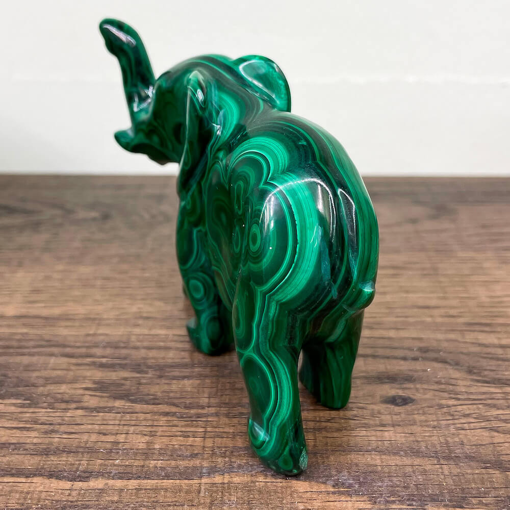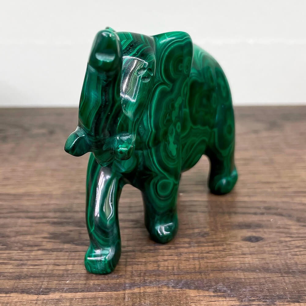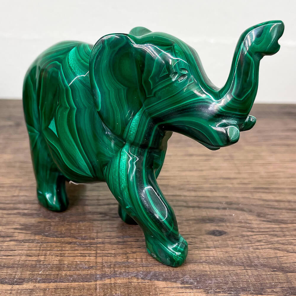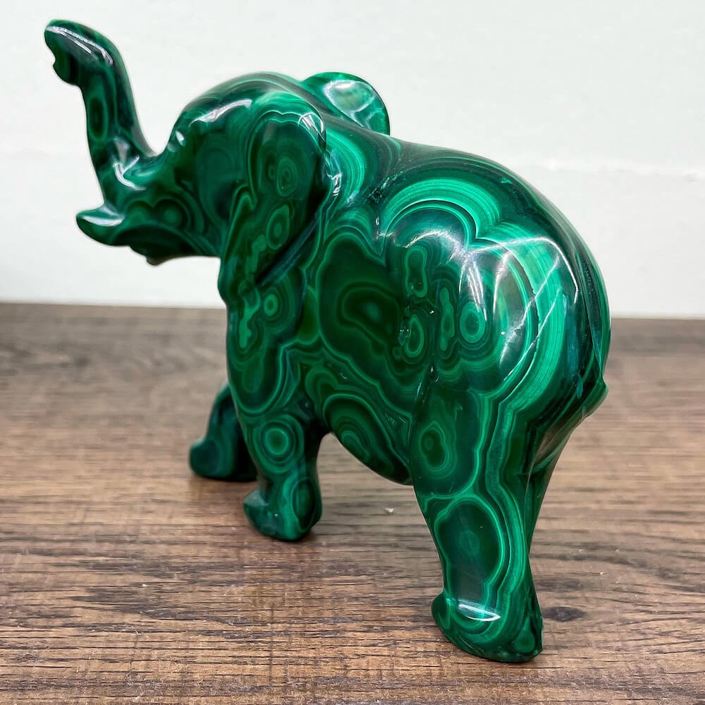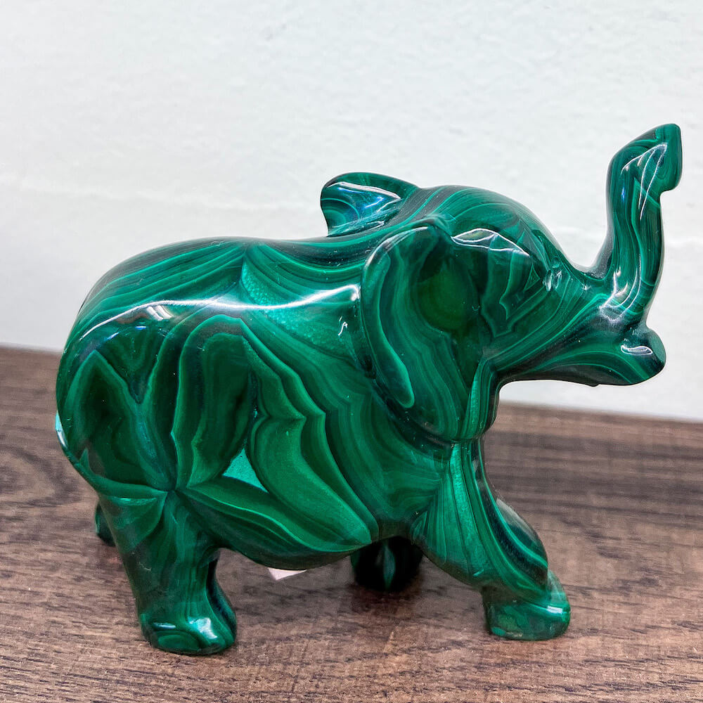 One of a kind Elephant Carving from Congo. Malachite natural, a genuine semiprecious stone from the Democratic Republic of the Congo. You will receive the exact Malachite piece is shown. Malachite is such a cool stone. It is a copper carbonate hydroxide mineral that forms the most splendid patterns and designs, often forming in botryoidal masses. When looking at Malachite, remember that it is never uniform in its patterns. It will have thin lines, thick lines, circles, swirls, and those patterns form in light mint to the darkest hunter green shades. It is such an awesome stone to look at, spectacular in all of its twisty turvy patterns. - Genuine Malachite will never just line in a similar formation and will not have black in it. Beware of some fake Malachite pieces floating around.