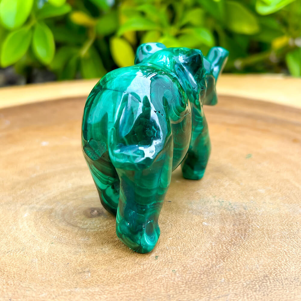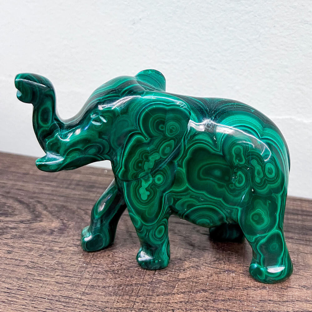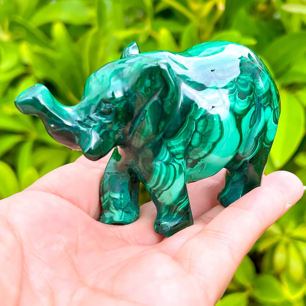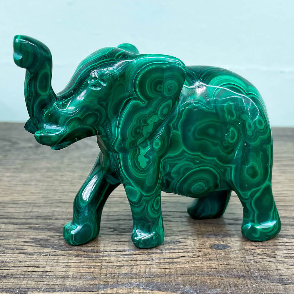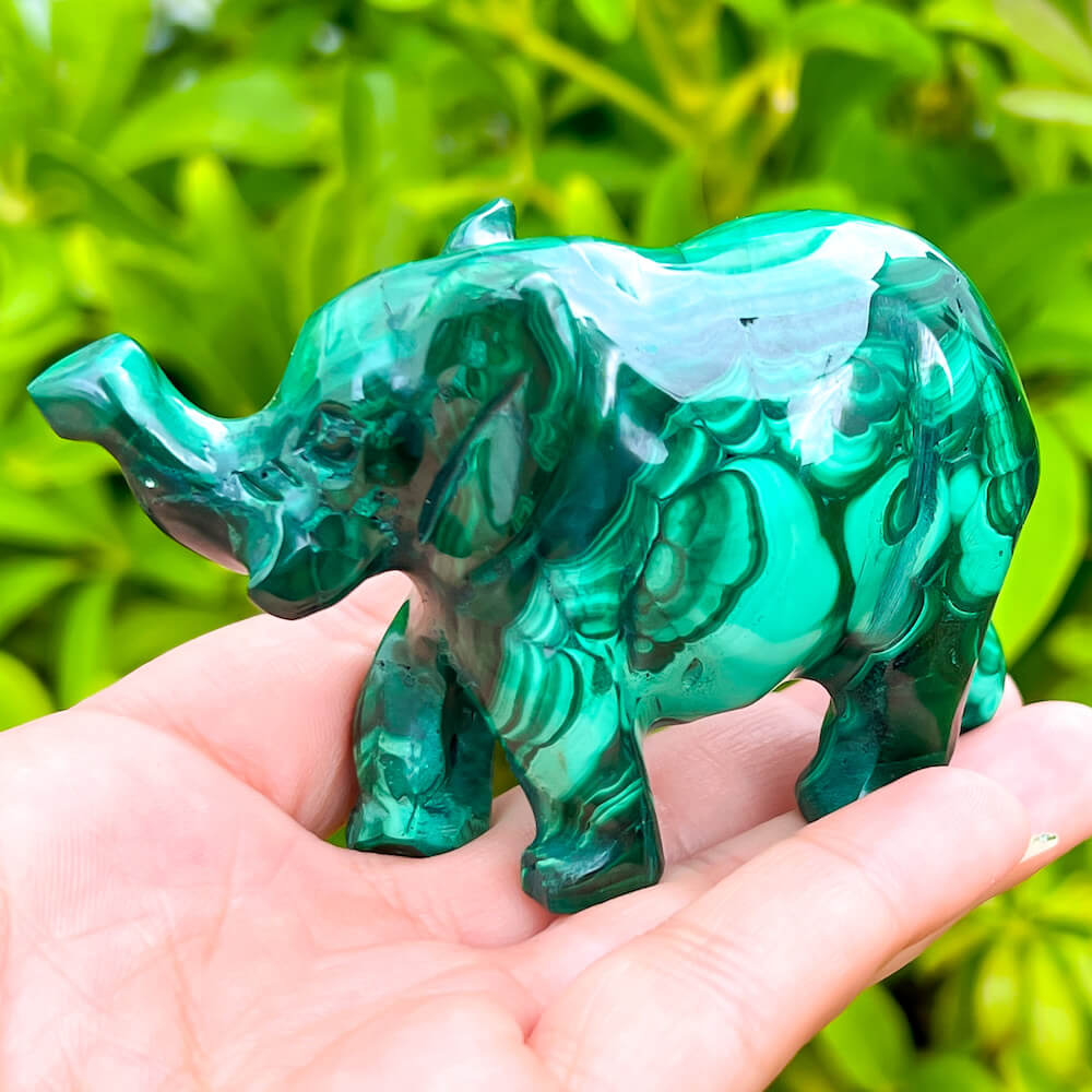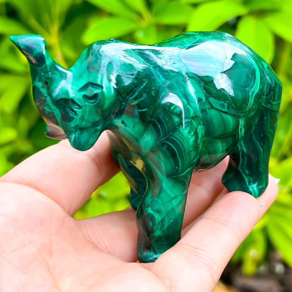 One of a kind Elephant Carving from Congo. Malachite natural, a genuine semiprecious stone from the Democratic Republic of the Congo. You will receive the exact Malachite piece is shown. Malachite is such a cool stone. It is a copper carbonate hydroxide mineral that forms the most splendid patterns and designs, often forming in botryoidal masses. When looking at Malachite, remember that it is never uniform in its patterns. It will have thin lines, thick lines, circles, swirls, and those patterns form in light mint to the darkest hunter green shades. It is such an awesome stone to look at, spectacular in all of its twisty turvy patterns. - Genuine Malachite will never just line in a similar formation and will not have black in it. Beware of some fake Malachite pieces floating around.