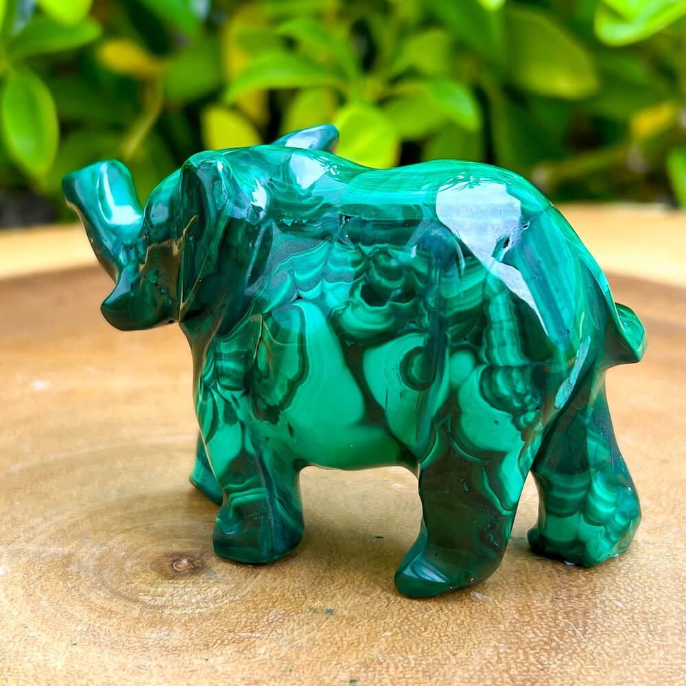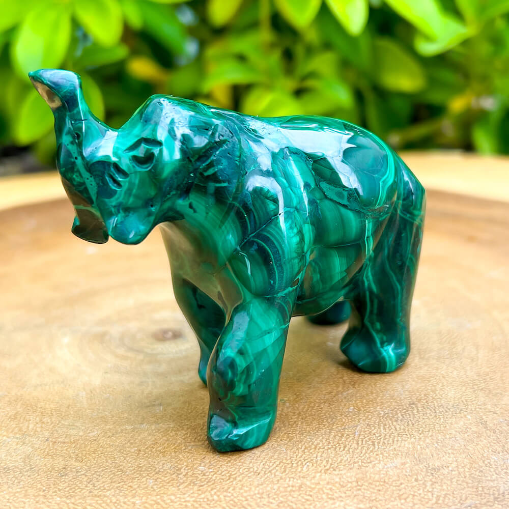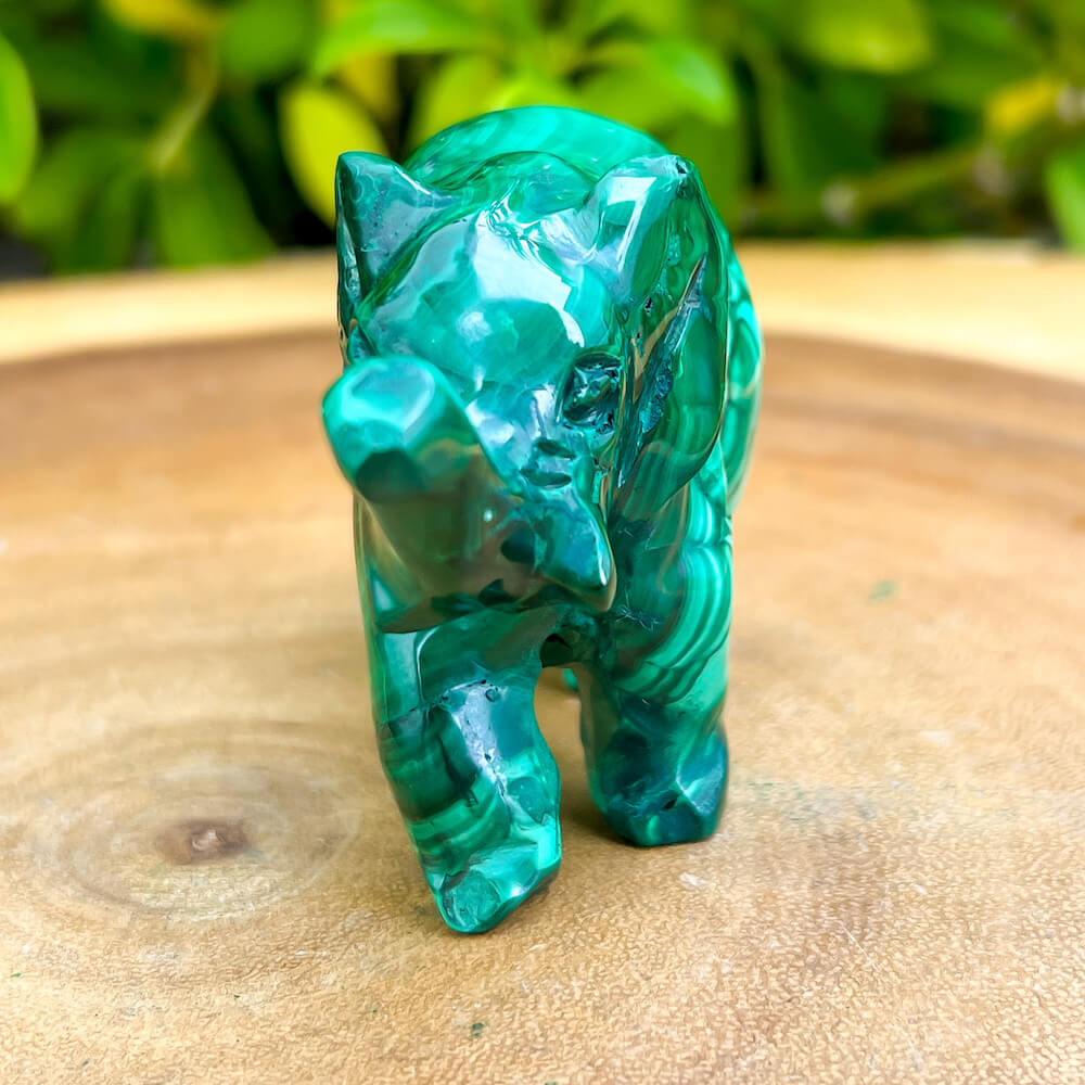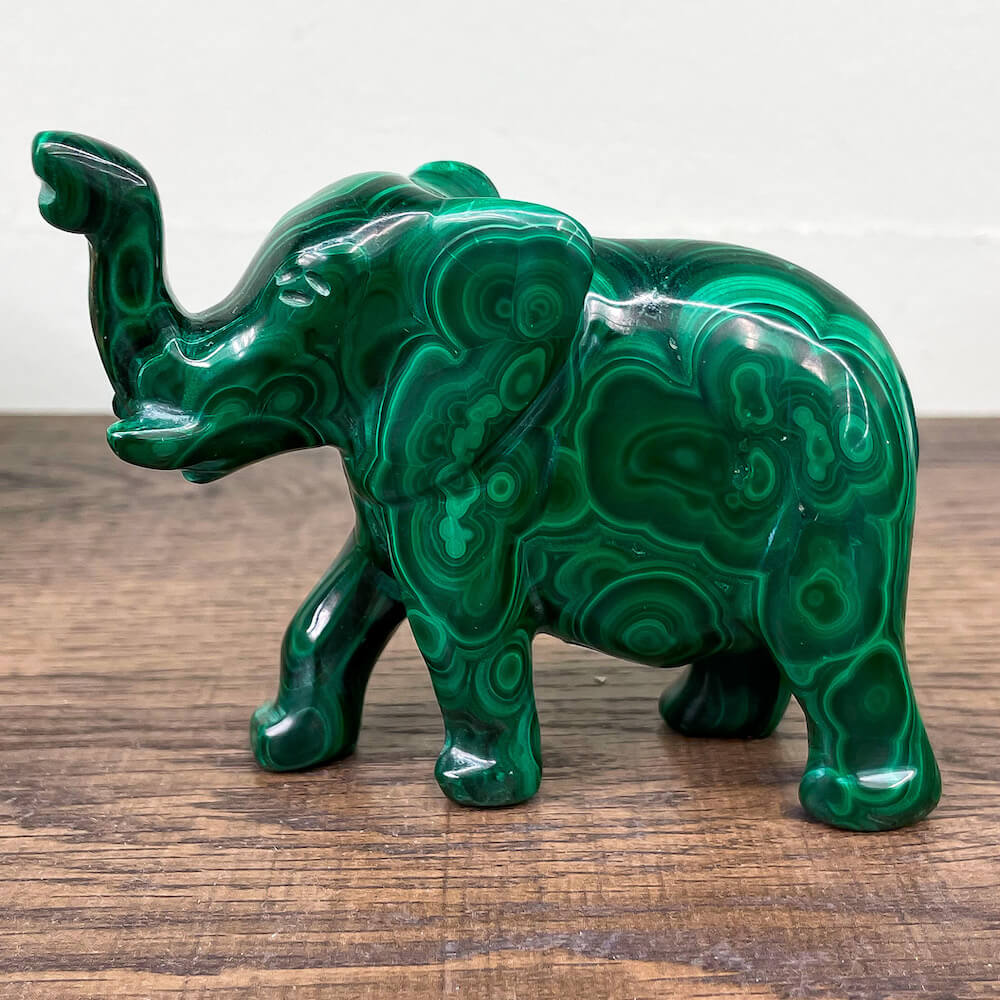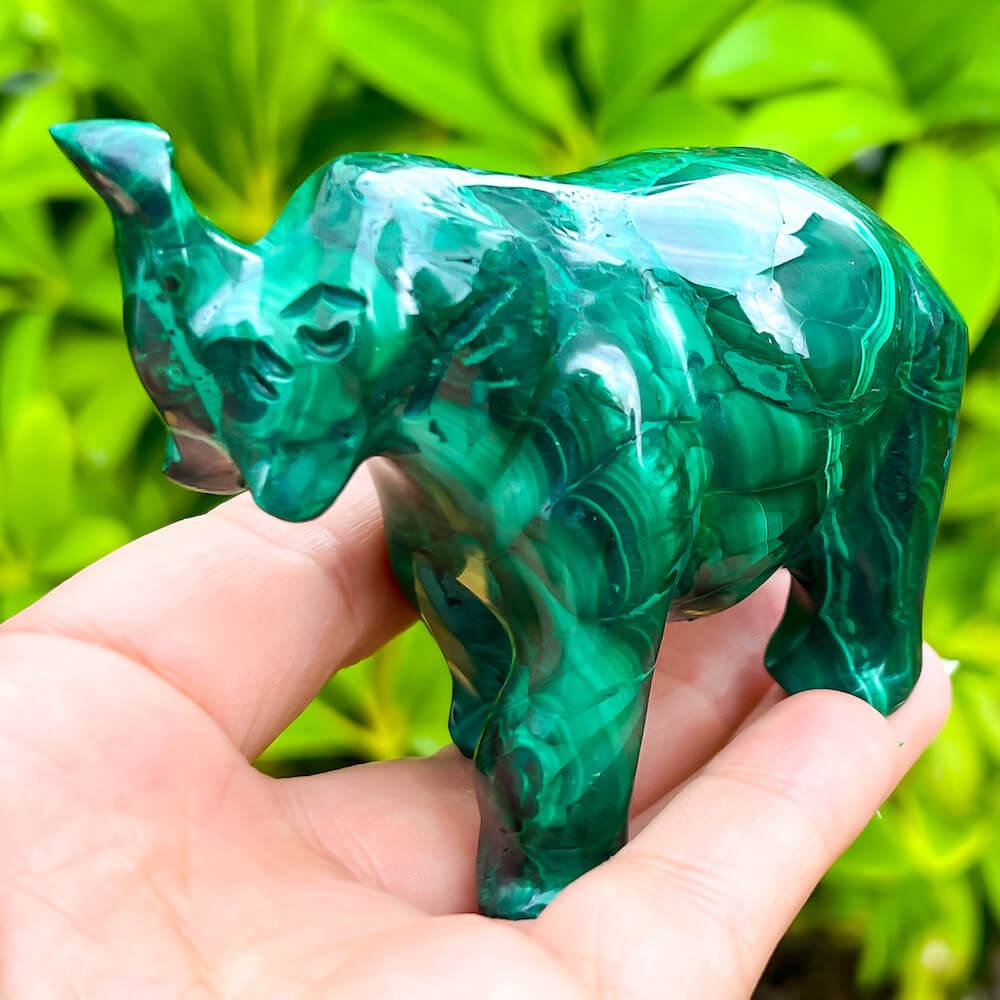 One of a kind Elephant Carving from Congo. Malachite natural, a genuine semiprecious stone from the Democratic Republic of the Congo. You will receive the exact Malachite piece is shown. Malachite is such a cool stone. It is a copper carbonate hydroxide mineral that forms the most splendid patterns and designs, often forming in botryoidal masses. When looking at Malachite, remember that it is never uniform in its patterns. It will have thin lines, thick lines, circles, swirls, and those patterns form in light mint to the darkest hunter green shades. It is such an awesome stone to look at, spectacular in all of its twisty turvy patterns. - Genuine Malachite will never just line in a similar formation and will not have black in it. Beware of some fake Malachite pieces floating around.