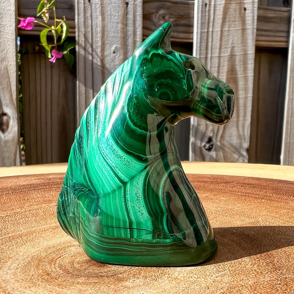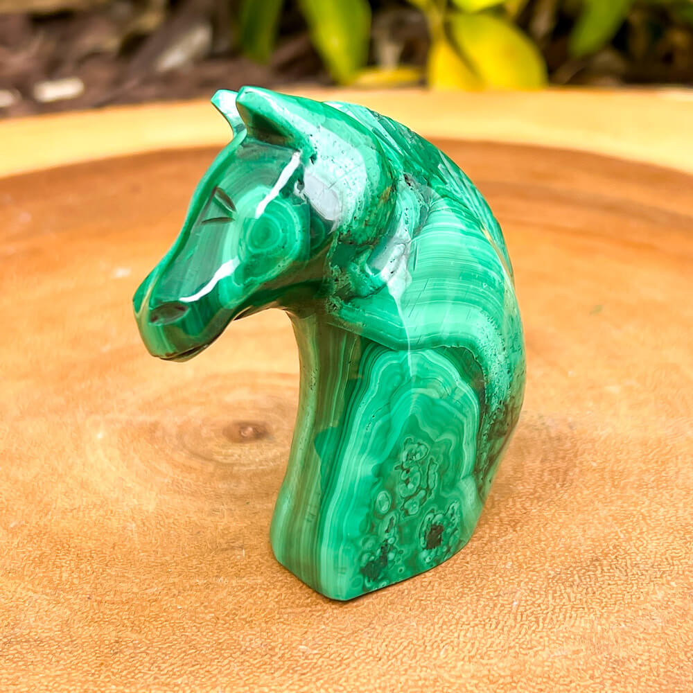 One of a kind Horse Carving from Congo. Malachite natural, a genuine semiprecious stone from the Democratic Republic of the Congo. You will receive the exact Malachite piece is shown.  Malachite is such a cool stone. It is a copper carbonate hydroxide mineral that forms the most splendid patterns and designs, often forming in botryoidal masses. When looking at Malachite, remember that it is never uniform in its patterns. It will have thin lines, thick lines, circles, swirls, and those patterns form in light mint to the darkest hunter green shades. It is such an awesome stone to look at, spectacular in all of its twisty turvy patterns. - Genuine Malachite will never just line in a similar formation and will not have black in it. Beware of some fake Malachite pieces floating around.
