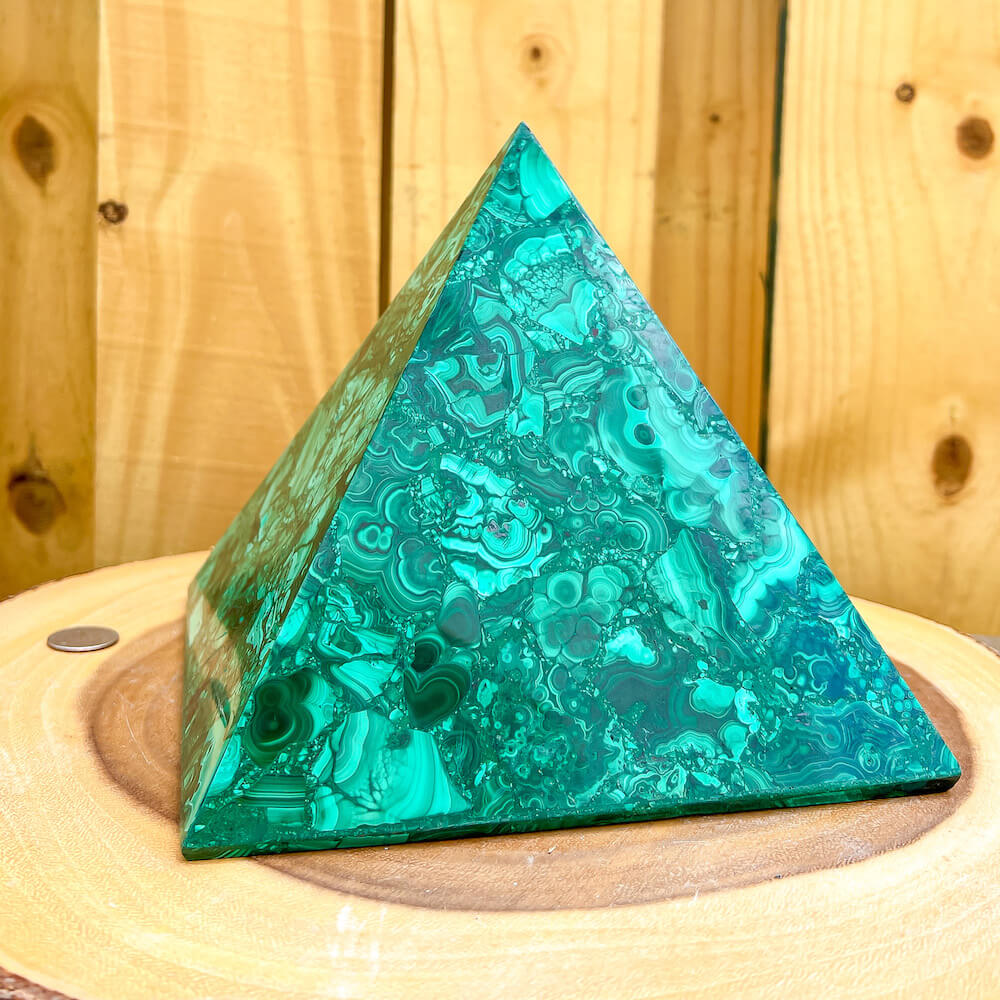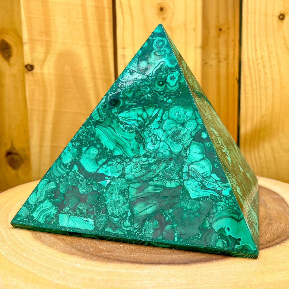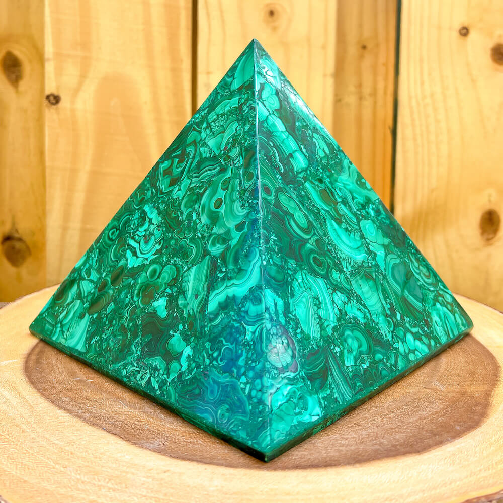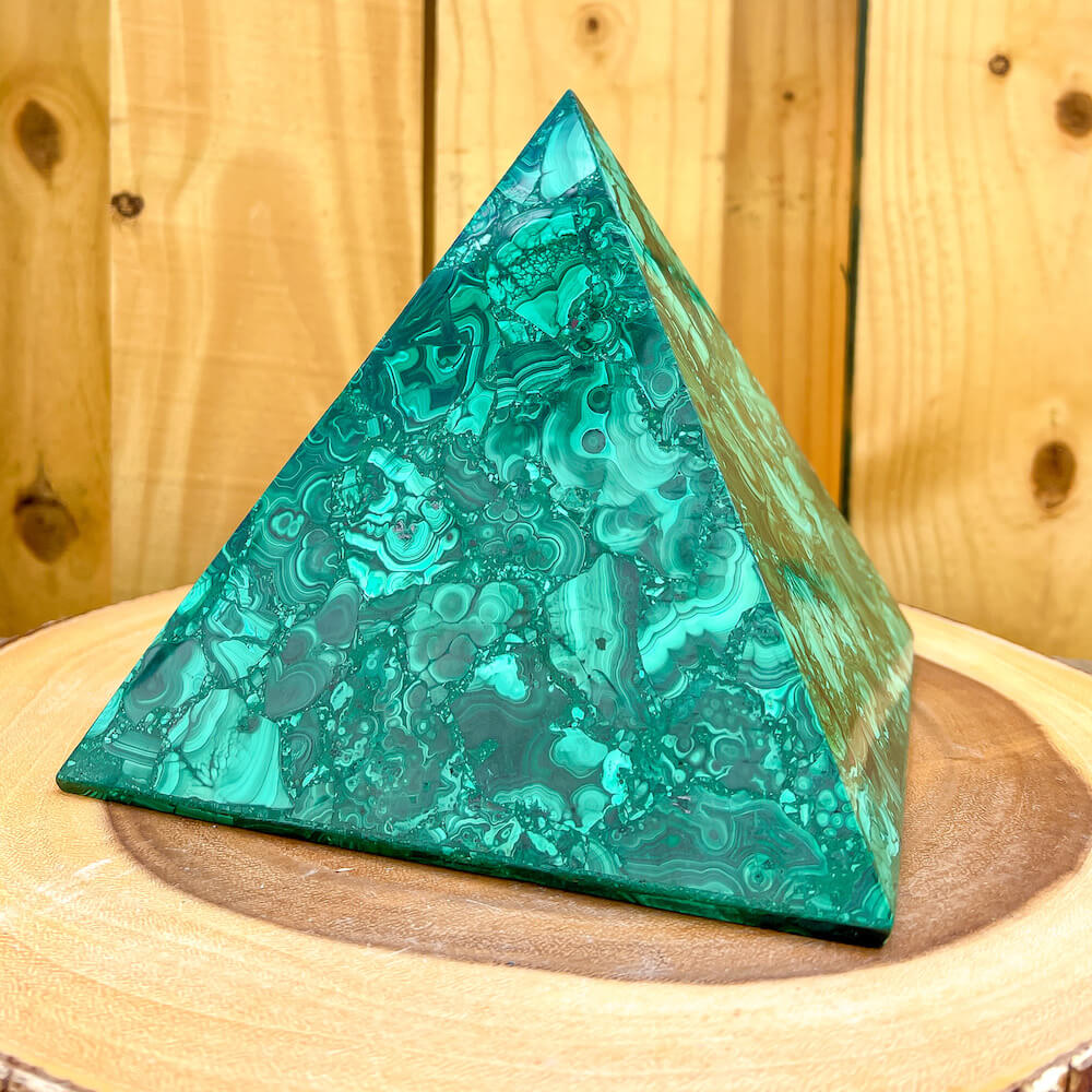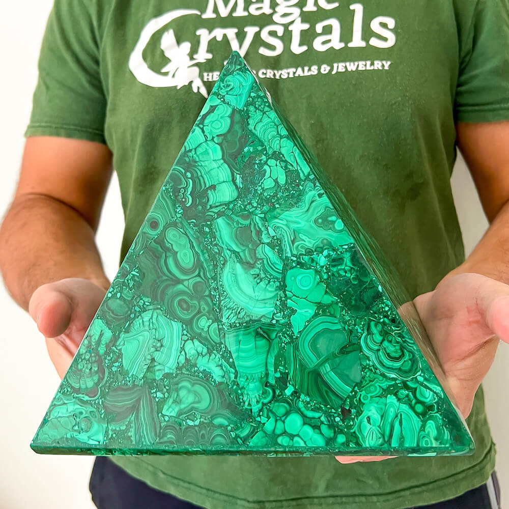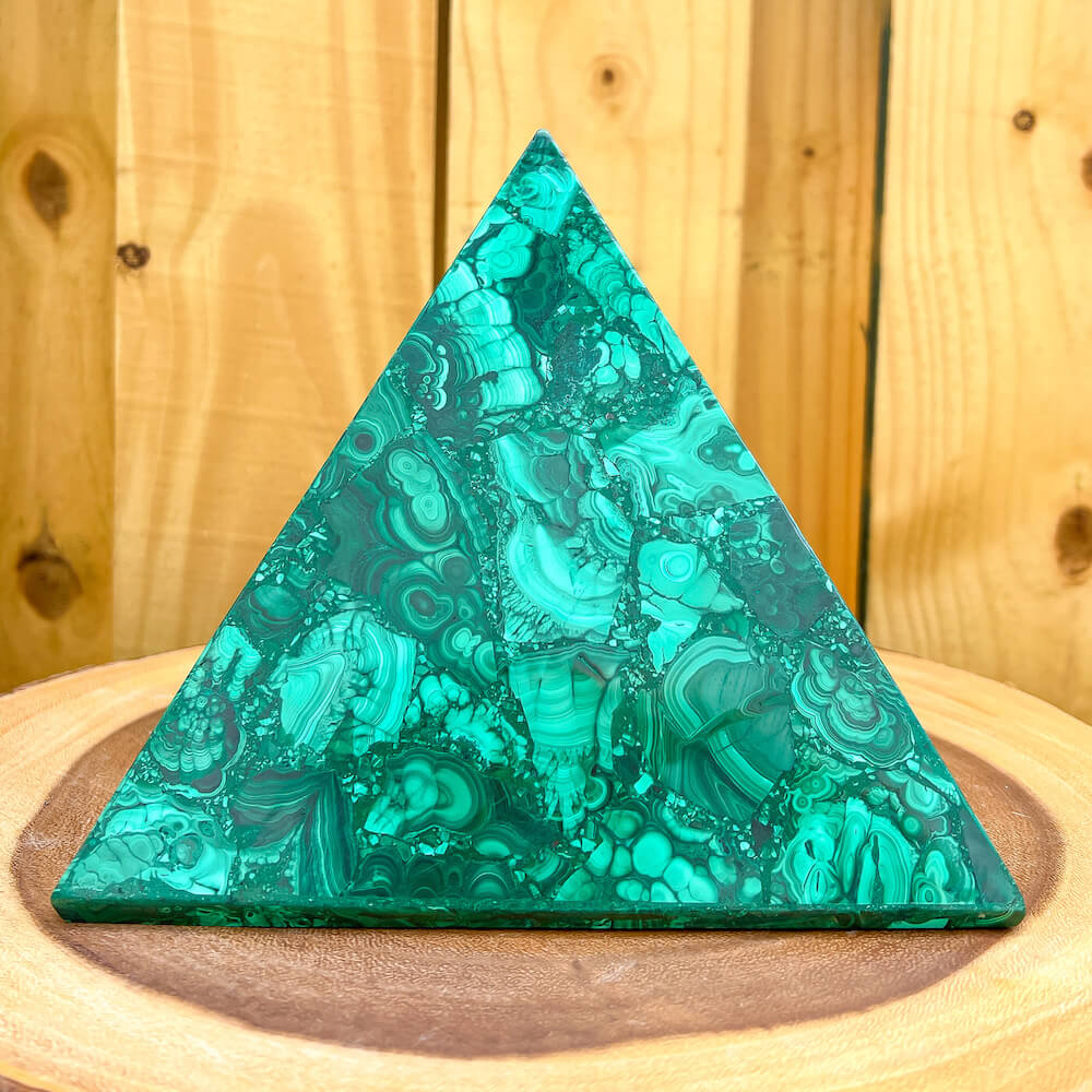 Experience the power and energy of genuine Congo malachite with this beautiful large pyramid. Handcrafted to perfection, this malachite pyramid will fill your space with energy and positivity. Unlock your spiritual potential with this one-of-a-kind malachite pyramid!