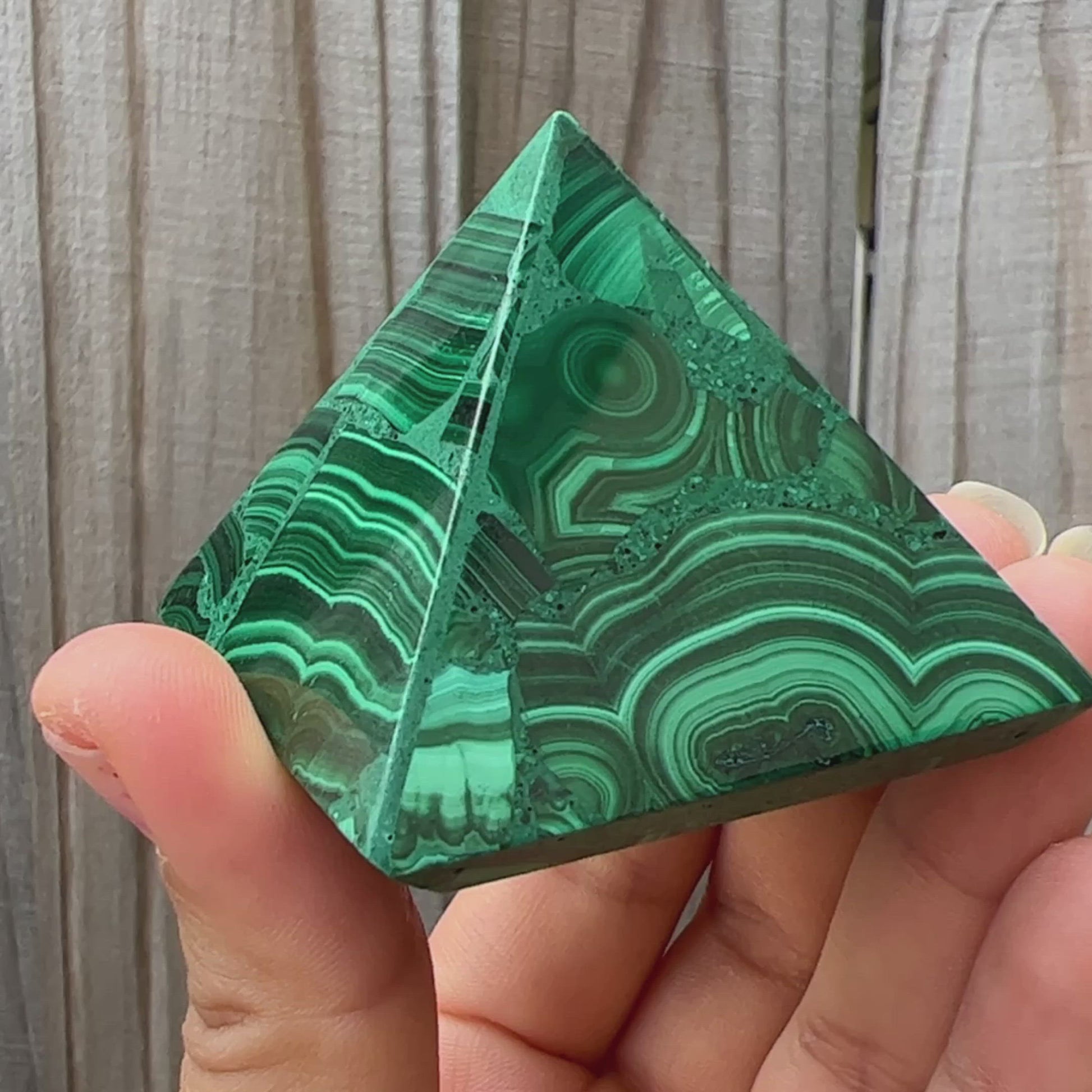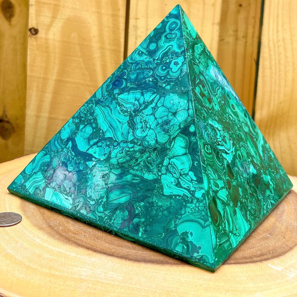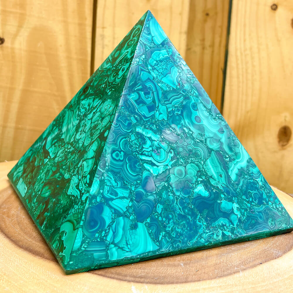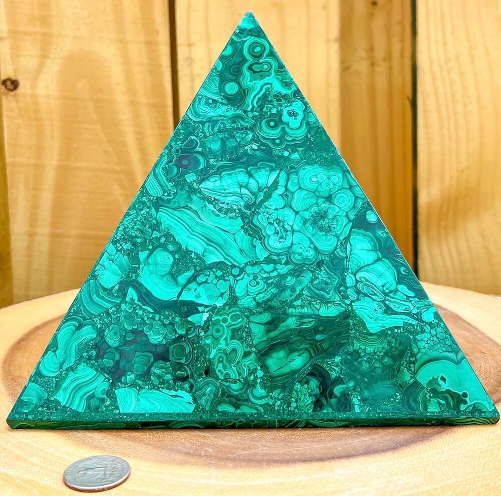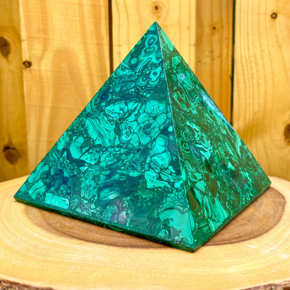 Experience the power and energy of genuine Congo malachite with this beautiful large pyramid. Handcrafted to perfection, this malachite pyramid will fill your space with energy and positivity. Unlock your spiritual potential with this one-of-a-kind malachite pyramid!