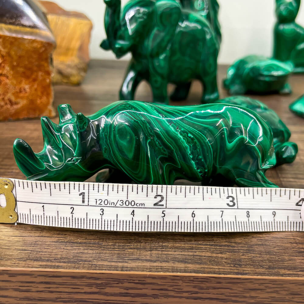 One of a kind Rhino Carving from Congo. Malachite natural, a genuine semiprecious stone from the Democratic Republic of the Congo. You will receive the exact Malachite piece is shown.  Malachite is such a cool stone. It is a copper carbonate hydroxide mineral that forms the most splendid patterns and designs, often forming in botryoidal masses. When looking at Malachite, remember that it is never uniform in its patterns. It will have thin lines, thick lines, circles, swirls, and those patterns form in light mint to the darkest hunter green shades. It is such an awesome stone to look at, spectacular in all of its twisty turvy patterns. - Genuine Malachite will never just line in a similar formation and will not have black in it. Beware of some fake Malachite pieces floating around.