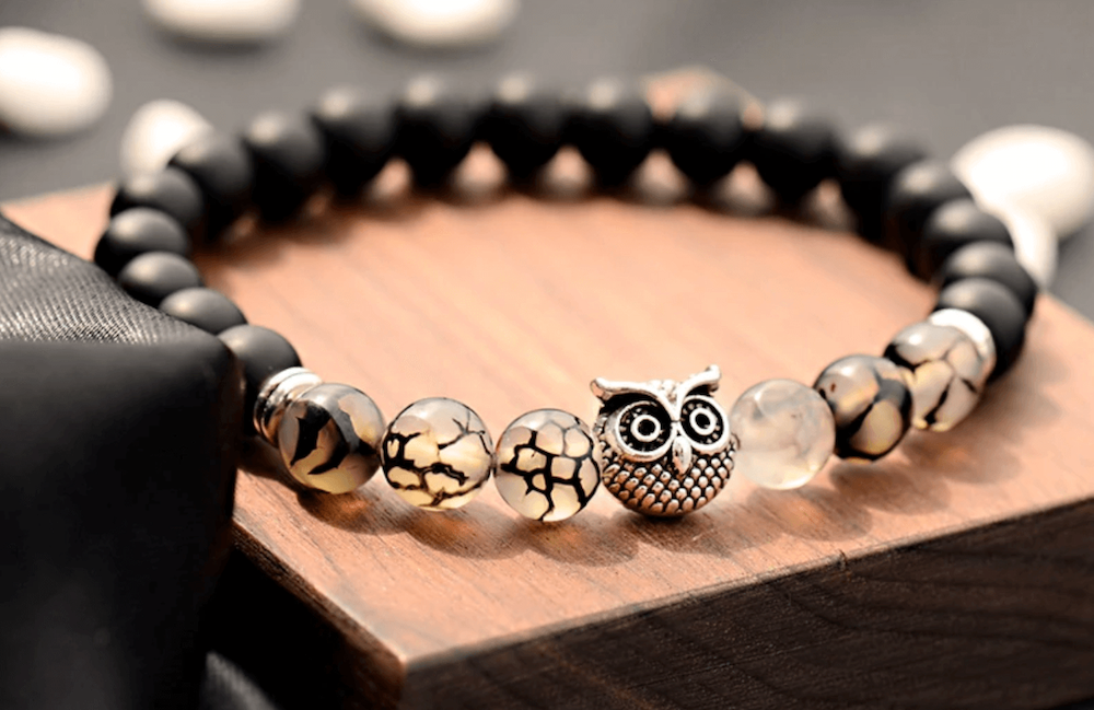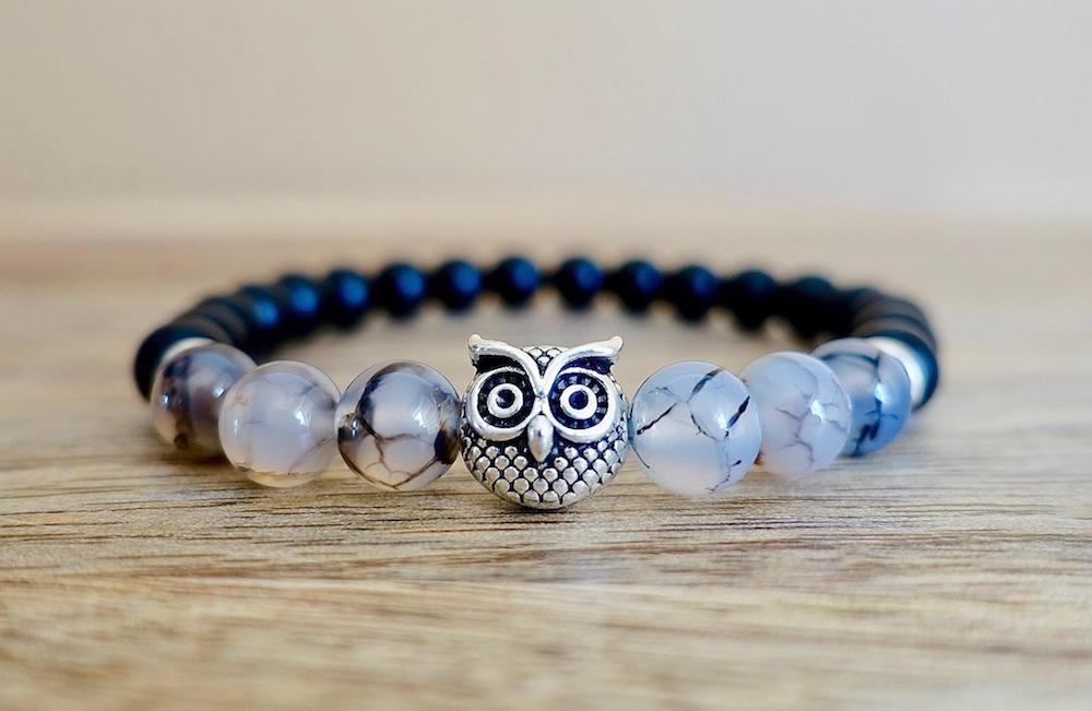 Black Tourmalated Quartz and Black Onyx Matte Stone Owl Bracelet