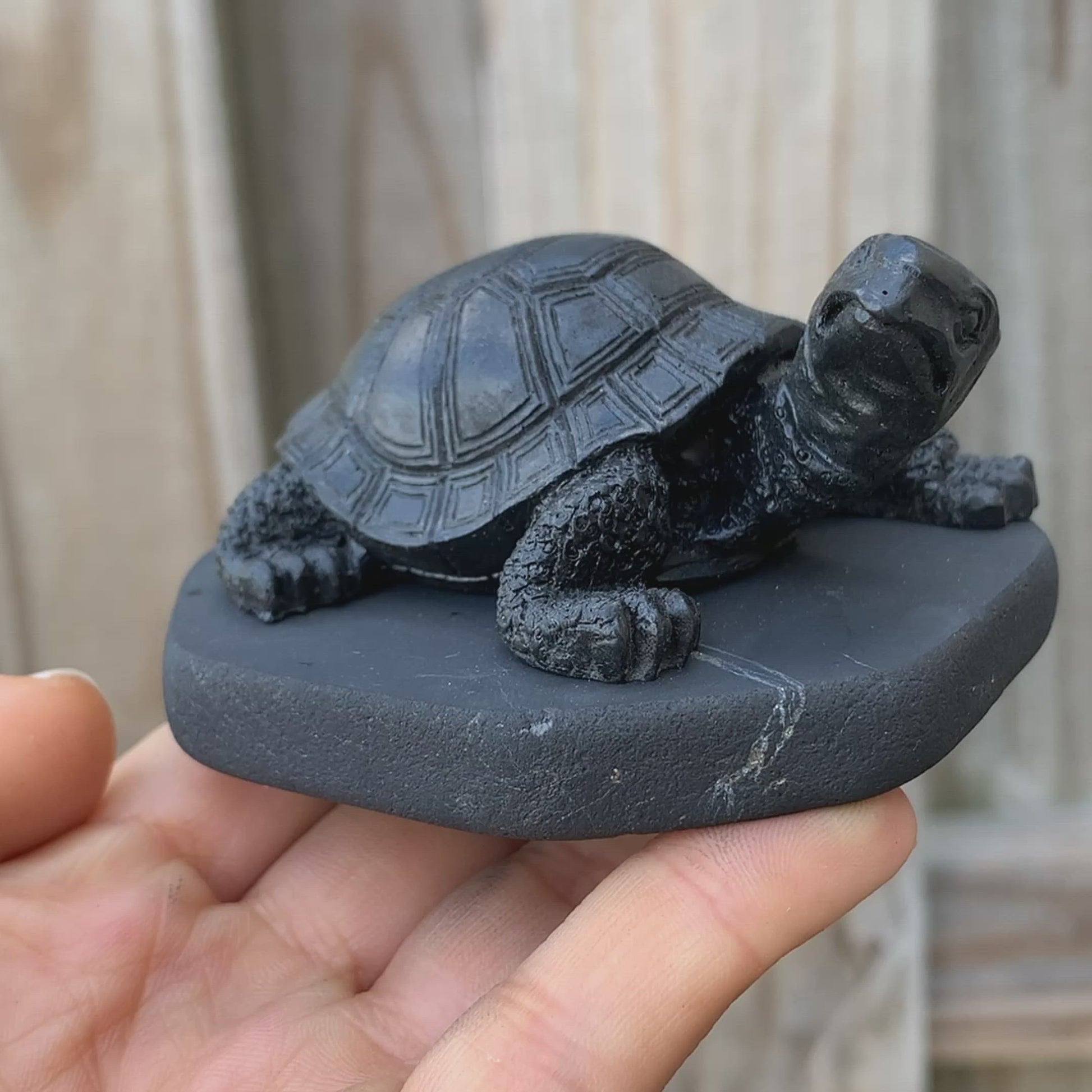 Hand-Carved Shungite Turtle on Shungite slab, from the Republic of Karelia in Russia. Some specimens also contain flecks of pyrite.