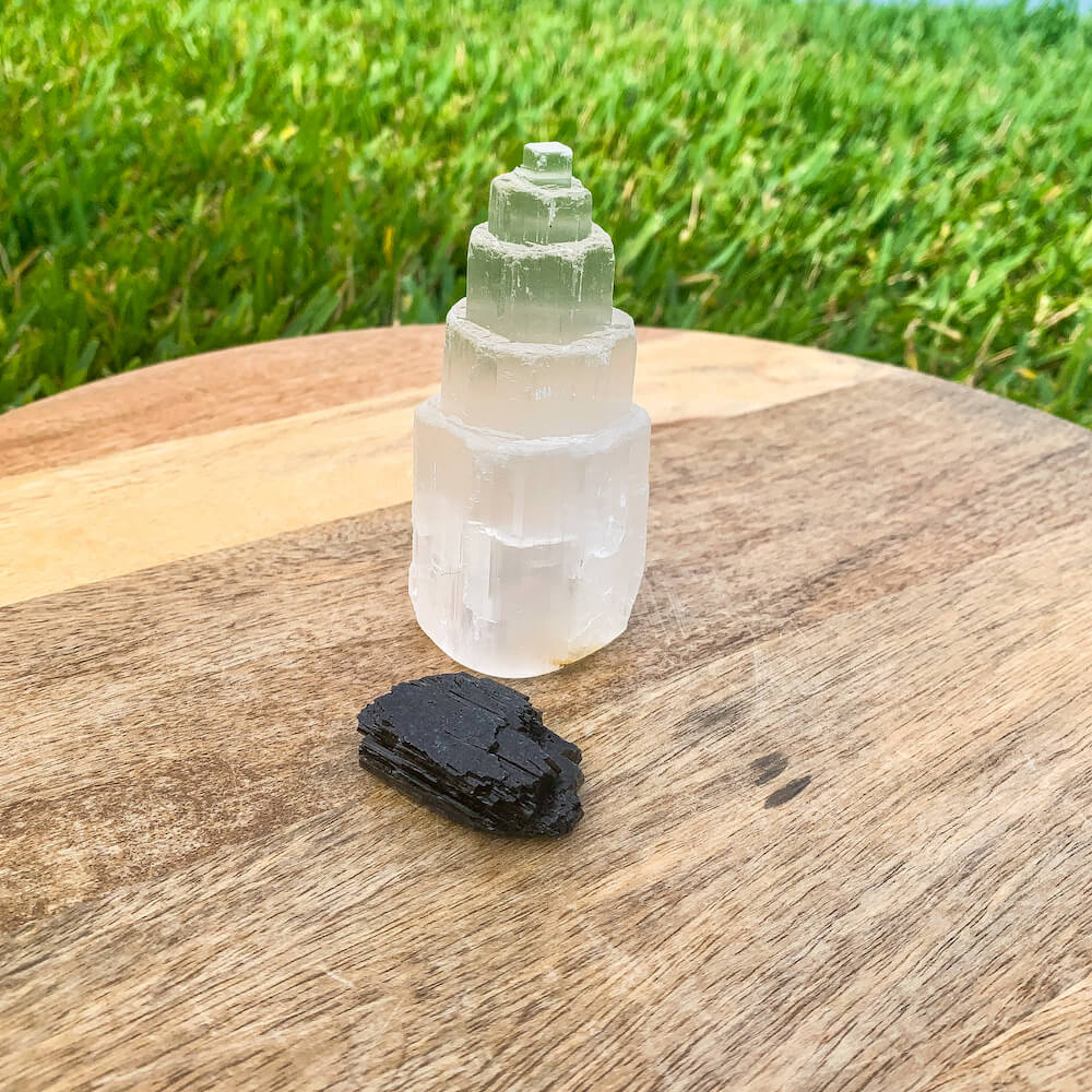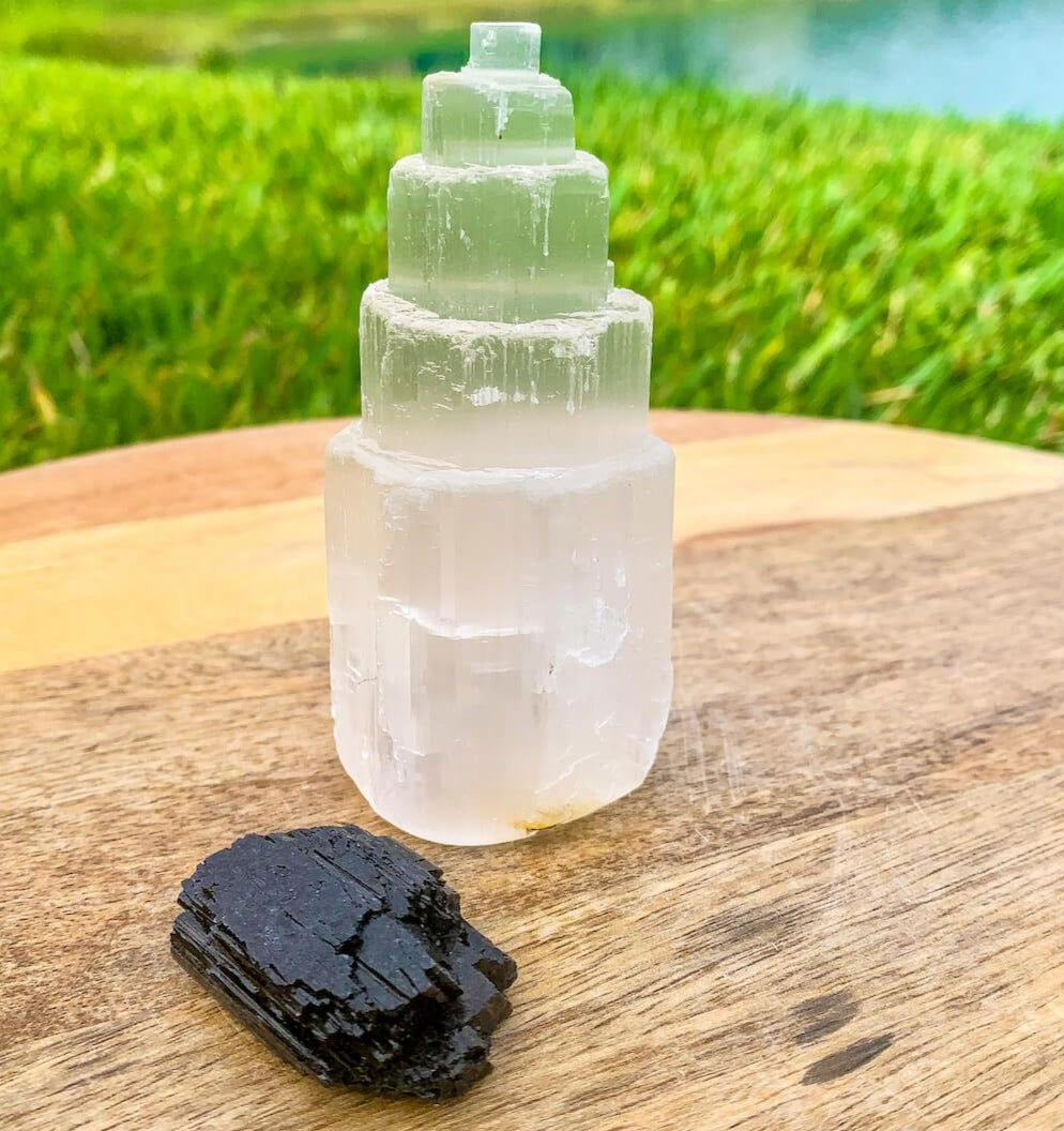 Raw Selenite Tower and Black Tourmaline Raw - Protection Bundle