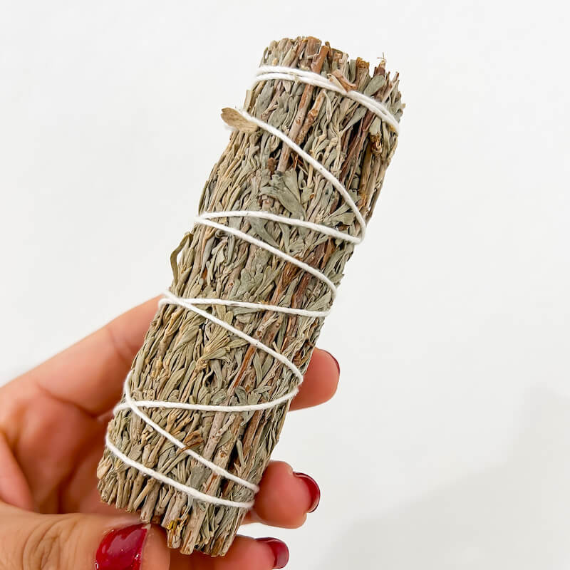 Blue Sage Smudge: Blue Sage smudge sticks are widely used for cleansing and purification purposes; They provides spiritual strength and are sometimes also used during exorcism rituals, as well to remove the malevolent spirits. Blue Sage is a hardy bush found in the deserts of the Southwest. Blue sage is a common name that refers to several different plant species but artemisia is often what is used.